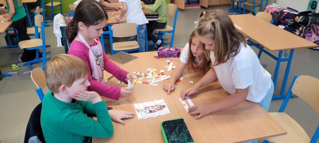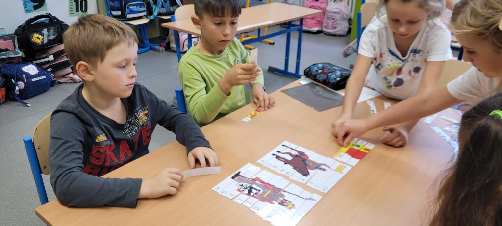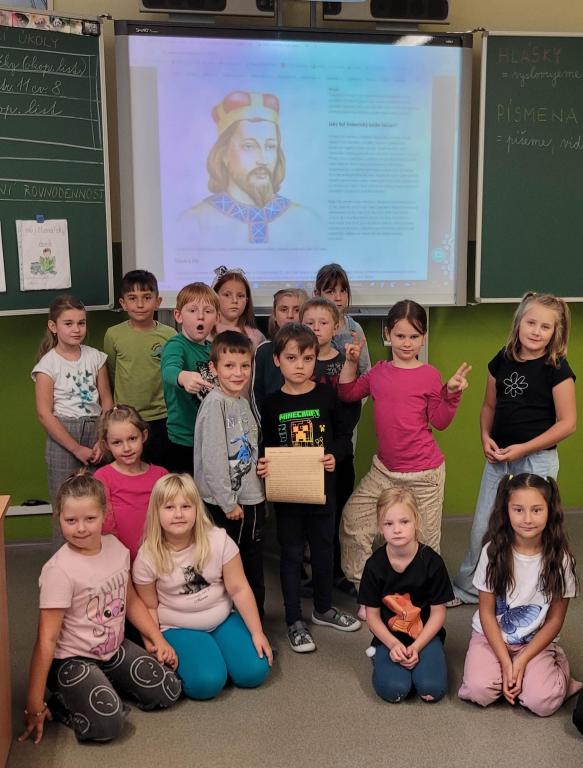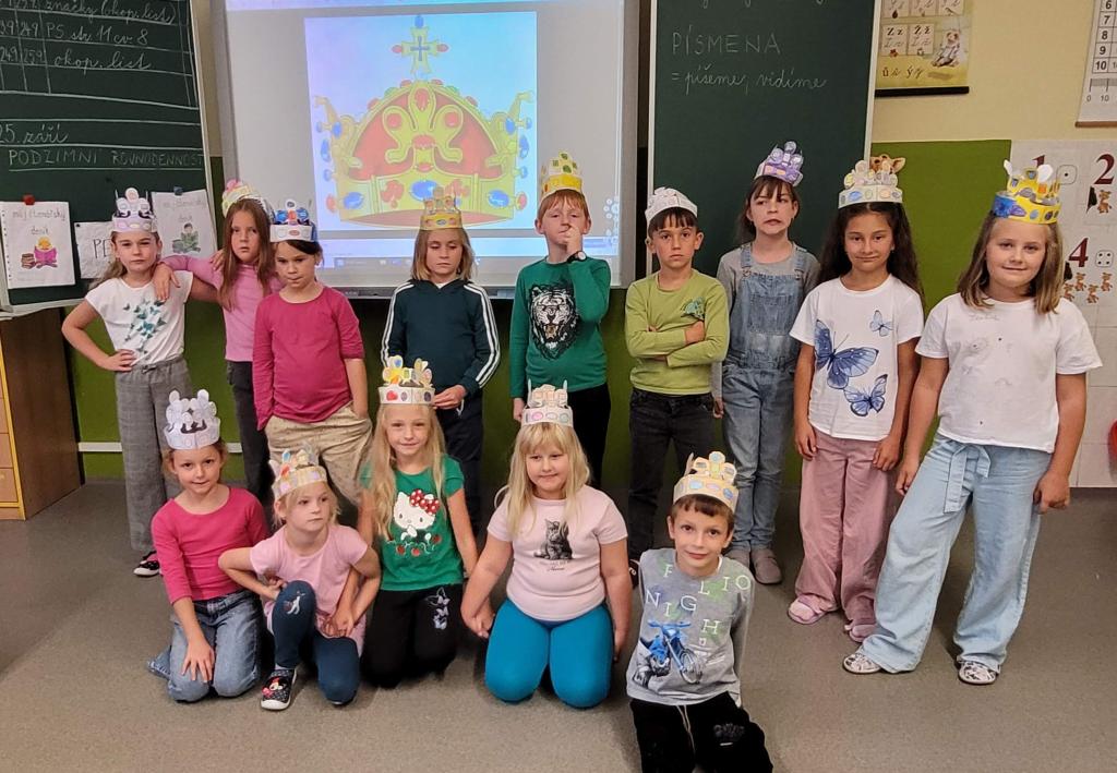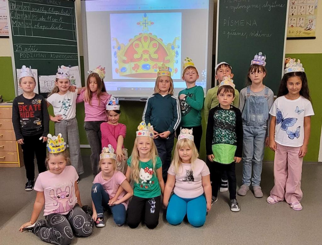 Při hodině českého jazyka jsme se rozdělili do čtyř skupin. Každá skupina dostala obálku s obrázkem rozstříhaným na proužky. Na každém proužku bylo jedno písmeno a děti měly za úkol seřadit písmena správně podle abecedy. Když se jim to podařilo, na složeném obrázku se objevil svatý Václav s kopím a štítem, svatý Václav na koni, jednoduchá královská koruna a nakonec ta nejvzácnější – svatováclavská koruna, česká královská koruna nejstarší a nejvýznamnější součást českých korunovačních klenotů, kterou nechat zhotovit Karel IV.