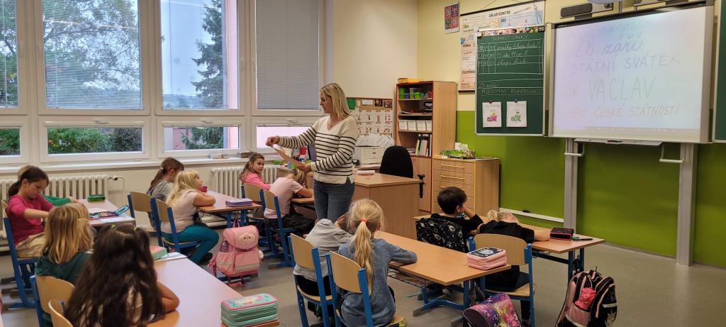 V hudební výchově jsme si pustili českou státní hymnu. Připomněli jsme si, jak se máme při jejím poslechu chovat, že stojíme v klidu a s respektem. Povídali jsme si také o tom, kdy se hymna hraje, například právě při státním svátku Dne české státnosti 28. září.