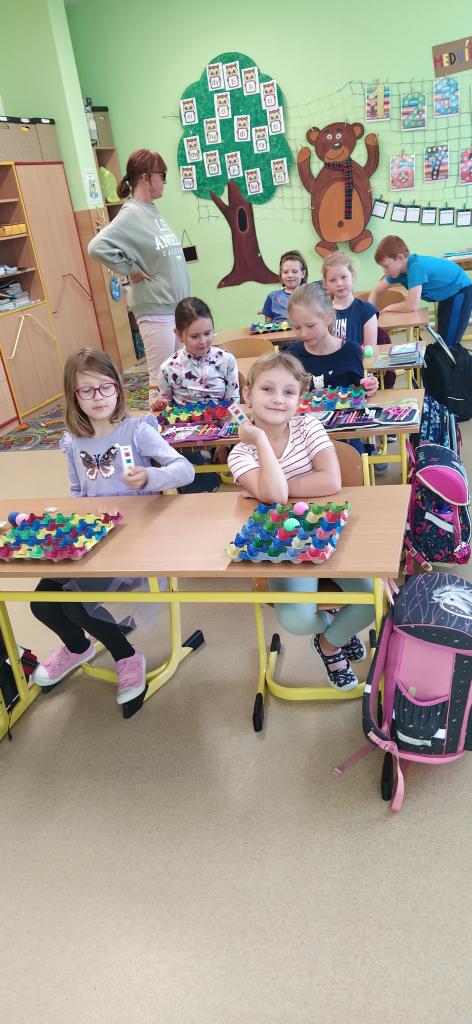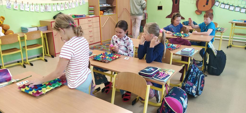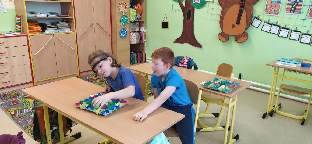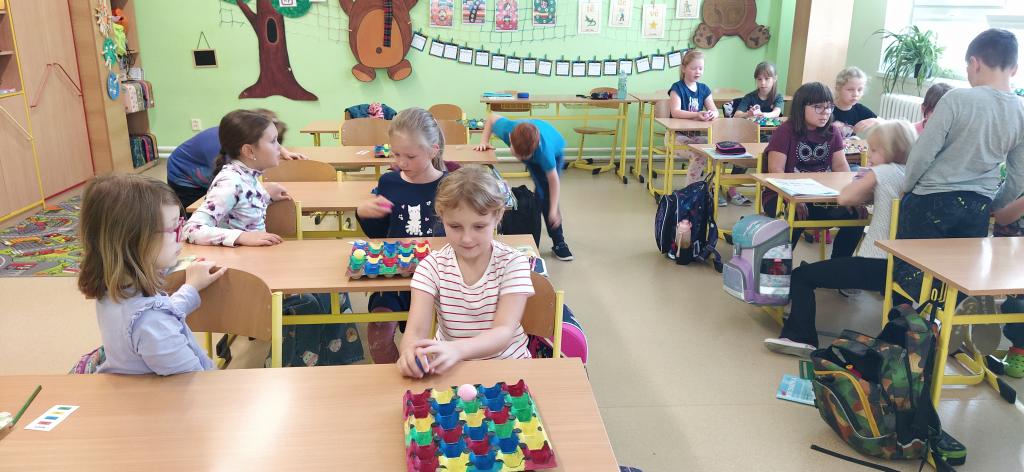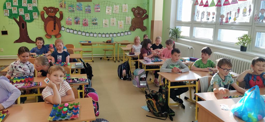 K výrobě děti potřebovaly velké plato od vajíček, barevnou bodovou osnovu, temperové barvy a dva barevně odlišené pingpongové míčky. Pak už stačilo jen dostatek trpělivosti – nejprve s rozmisťováním barev podle společně vytvořené bodové osnovy, a poté s pečlivým vybarvováním jednotlivých políček.