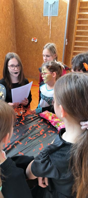 31.10. si pro nás vybraní žáci druhého stupně společně s paní učitelkou Michaelou Stachurovou připravili aktivity v tělocvičně školy. Aby nám to čekání na pátou vyučovací hodinu rychleji utíkalo, věnovali jsme se ve třídě dopolednímu tvoření. Rozdělili jsme se do dvou skupin. První skupinka tvořila s paní asistentkou kelímkové příšerky a druhá část žáků ve školní kuchyňce zatím vá