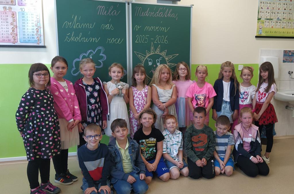 Medvíďátka zahájila nový školní rok plná elánu a radosti. Nejprve jsme se všichni srdečně přivítali a hned poté děti dostaly nové učebnice a sešity. Každý také obdržel svůj vlastní klíč k šatní skříňce. Teď už jen dávat pozor, aby se nikam nezatoulal. V komunikačním kruhu jsme společně sdíleli zážitky z prázdnin a nechyběla ani sladká odměna. Poté jsme si vyzkoušeli důležitou ak