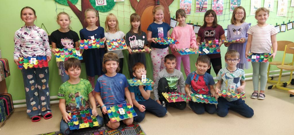 Medvíďátka si v rámci pracovních činností a výtvarné výchovy vyrobila matematickou hru, se kterou si mohou zábavnou formou procvičovat učivo z matematiky. K výrobě děti potřebovaly velké plato od vajíček, barevnou bodovou osnovu, temperové barvy a dva barevně odlišené pingpongové míčky. Pak už stačilo jen dostatek trpělivosti – nejprve s rozmisťováním barev podle společně vytvořené bodové osnovy, a poté s pečliv&