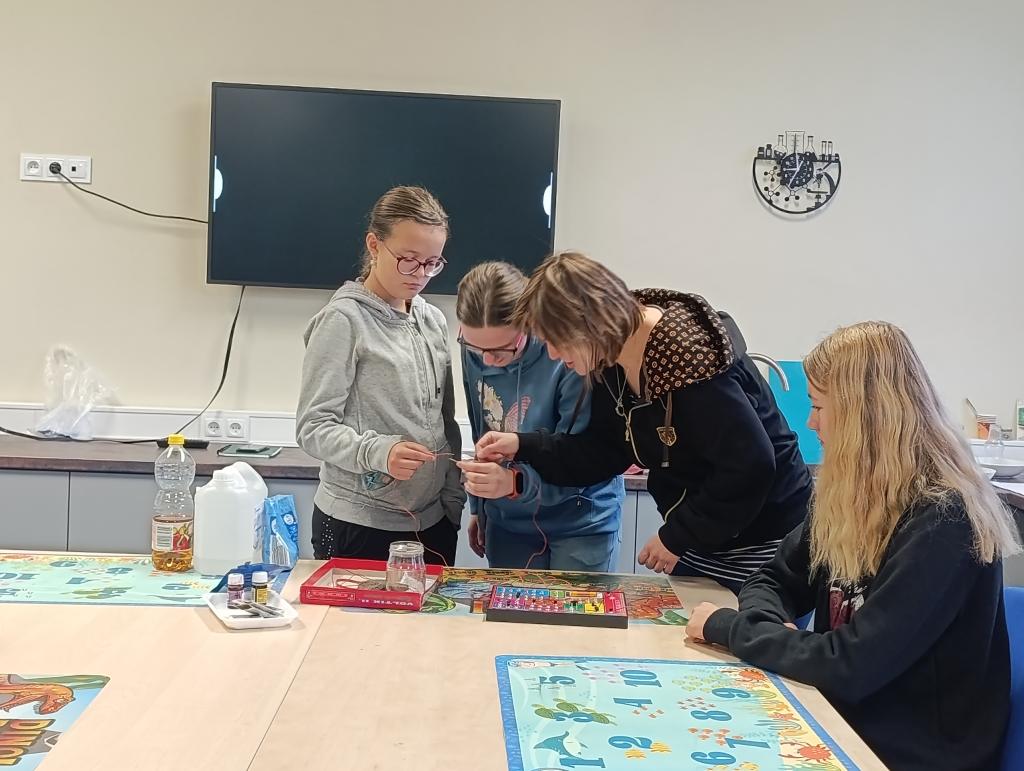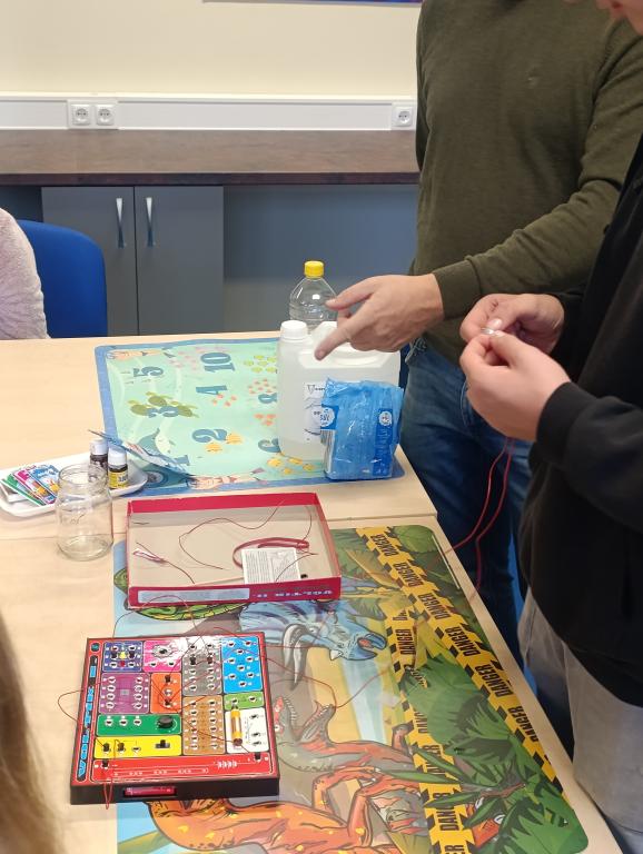 V další částim přednášky se žáci věnovali elektrickým obvodům, kde zjišťovali, které materiály vedou elektrický proud a které ne. Také se dozvěděli, že voda je vodivá, ale destilované ne. Při pokusu s destilovanou vodou zkoušeli rozpustit sůl a cukr. Tímto pokusem si žáci vyzkoušeli, zda´obohacená směs je vodivá.