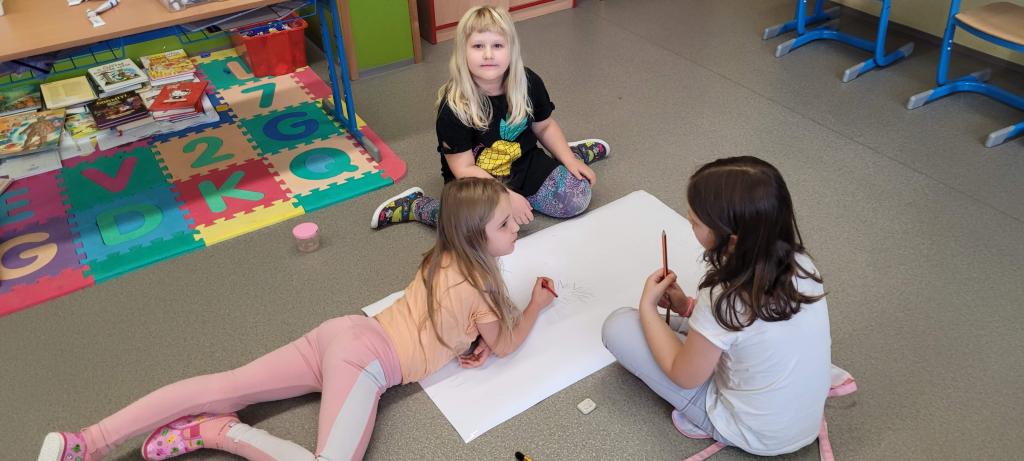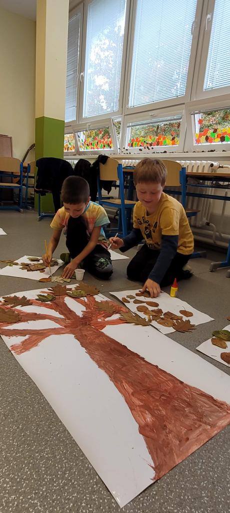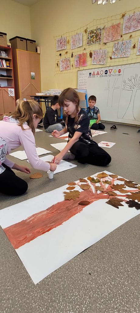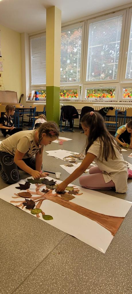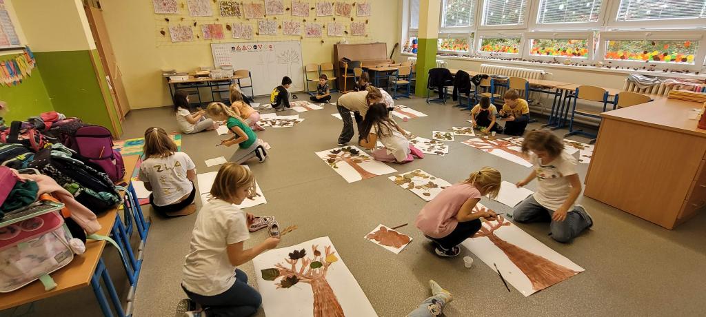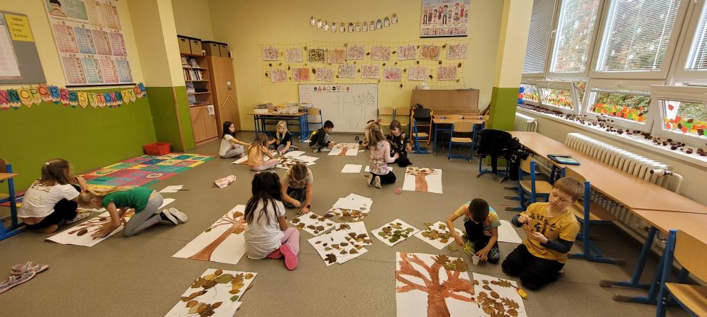 Podzim se k nám přišel s plnou kapsou barevných listů a my jsme je samozřejmě nenechali ležet jen tak v parku. Vyrazili jsme s druháky na „listovou výpravu“ do parku u školy a nasbírali poklady všech barev. Listy jsme pak týden lisovali pod tím, co máme ve škole nejspolehlivější, pod učebnicemi. Ve čtvrtek při výtvarce se děti rozdělily do dvojic, odklidily si lavice ke straně třídy a vytvořily si tak dostatečný prostor na svá umělecká díla. Kmeny a větve nám dali trošku zabrat, nemohli jsme pořád přijít na to, jak to udělat, aby to vypadalo jako větve a ne jako ruka s prsty. Pak už si vzaly do ruky štětce a začalo velké malování. Slovo dostaly temperky, míchaly se, dokud z toho nevznikla celá paleta hnědých odstínů potřebná na kmen. Musíme se přiznat, že občas bylo trochu hnědé nejen na podlaze, ale i na rukávech a kalhotách. Když byly stromy hotové, přišlo kouzlo – na větve jsme nalepili vylisované listy a modrými křídami jsme dotvořili oblohu. Naše třída se proměnila v opravdový podzimní park. Výsledná podzimní alej teď zdobí síť vzadu ve třídě a každý kdo k nám přijde, ji nemůže přehlédnout.