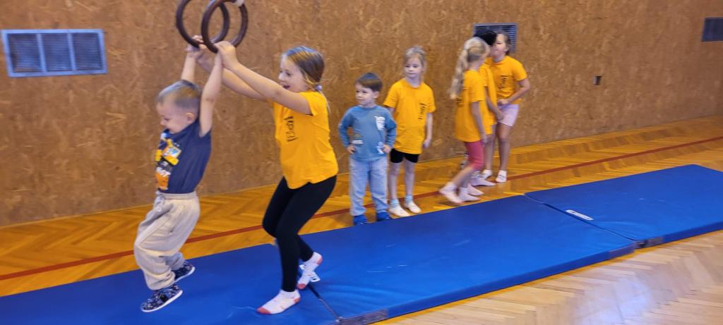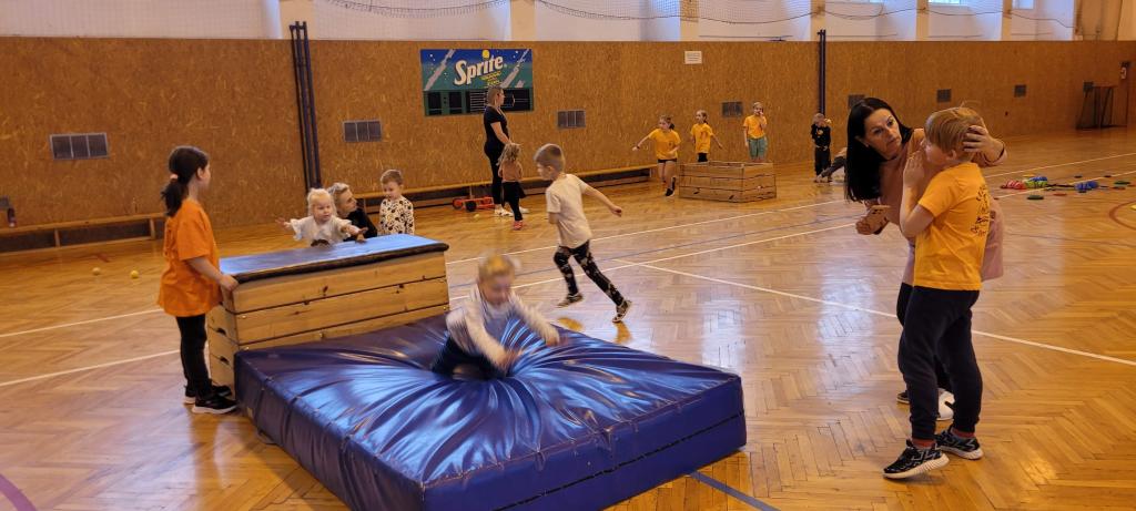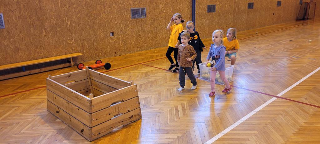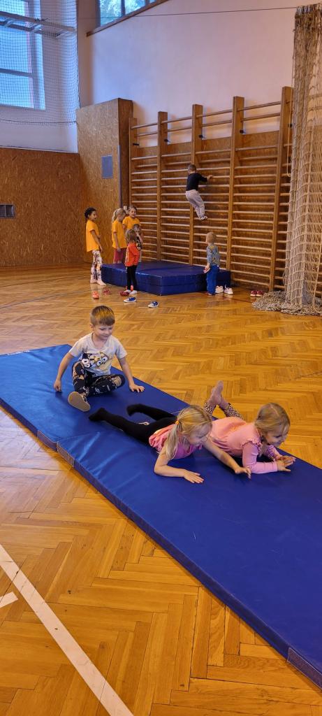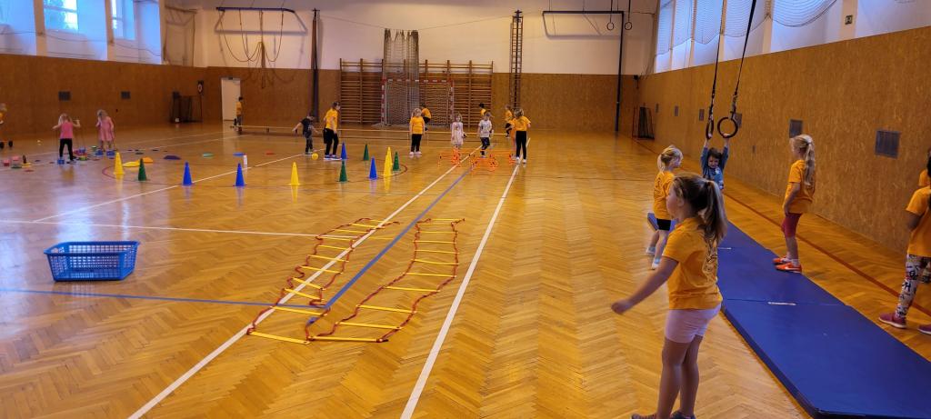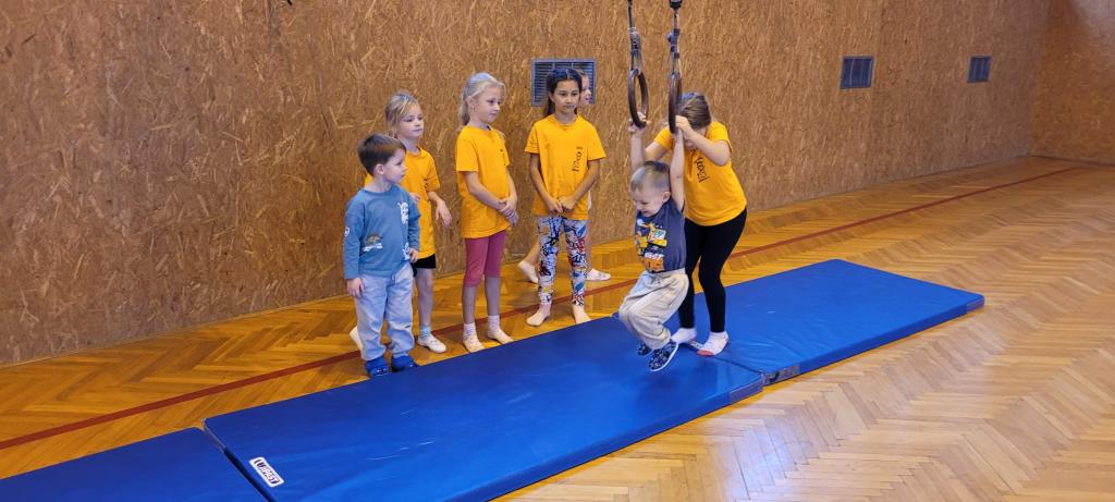 Do naší tělocvičny dorazila speciální návštěva, malí sportovci ze školky! Druháčci se proměnili v opravdové trenéry a s velkou zodpovědností a ještě větším nadšením si pro ně připravili pořádnou porci pohybu. Na stanovištích se děly věci. Houpání na kruzích jako v cirkuse, skoky ze švédské bedny jako odvážní akrobati, šplhání po žebřinách a skoky dolů jako horolezci, házení míčků do bedny, přeskakování překážek, slalom mezi kužely, kotouly na žíněnce, balancování po umělých kamenech, chození na chůdách a třeba i minifotbálek. Každý si mohl vybrat, co ho baví nejvíc. Někdo si zamiloval kruhy, jiný se zájmem trénoval neobvyklou chůzi na chůdách, a někteří prostě běhali od stanoviště ke stanovišti, aby stihli všechno. A když všichni odcházeli, bylo poznat, že si to pořádně užili nejen podle úsměvů, ale i podle unavených nožiček. Druháčci se o malé sportovce starali skvěle a zaslouží velkou pochvalu!