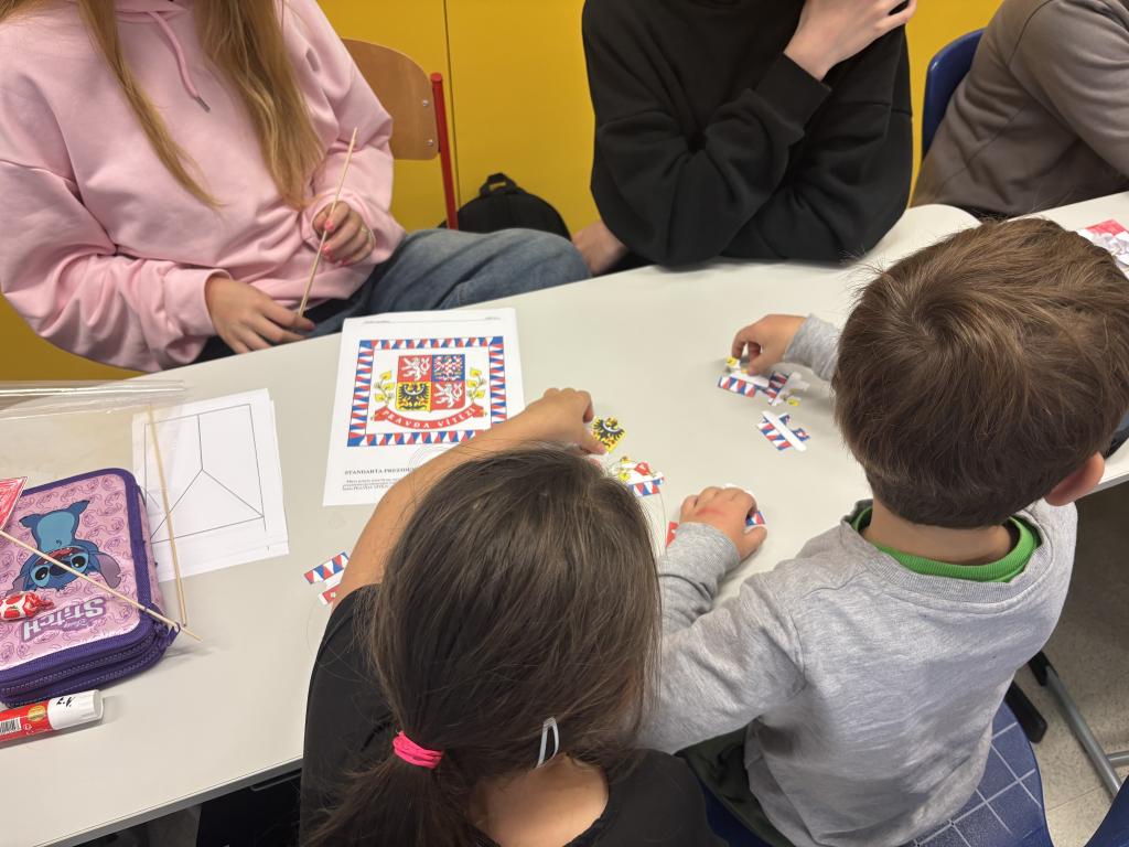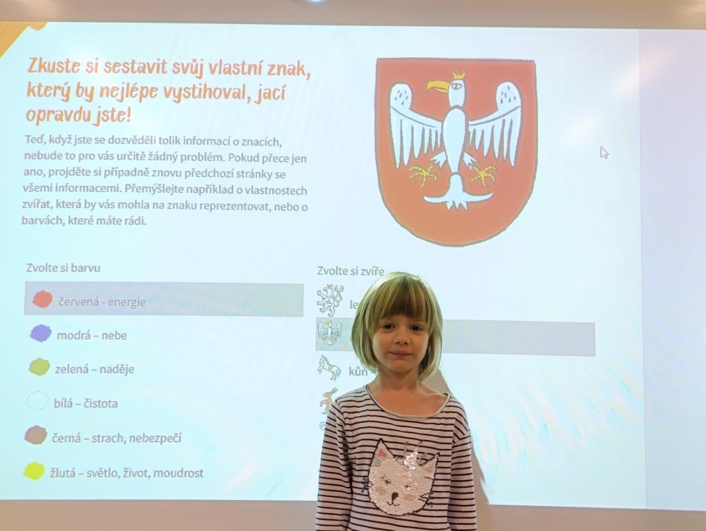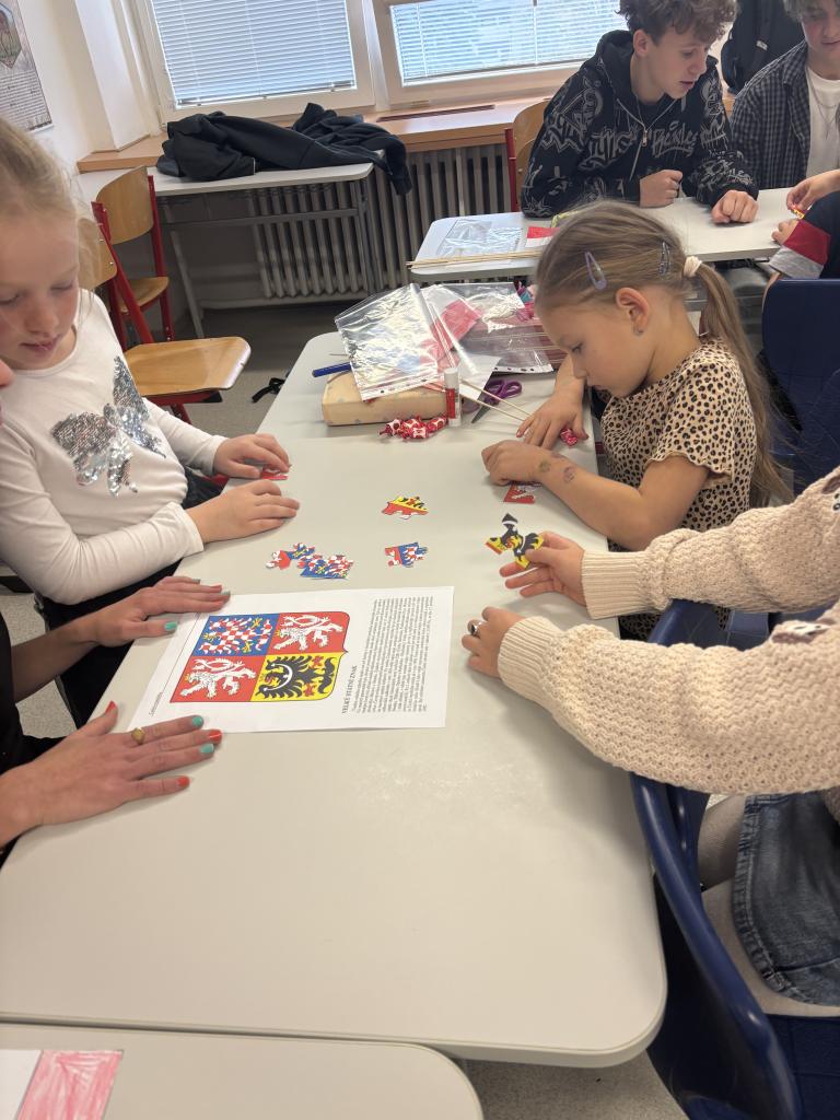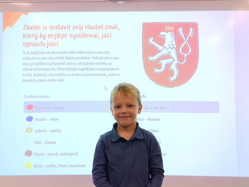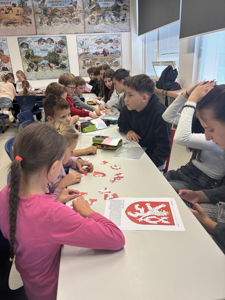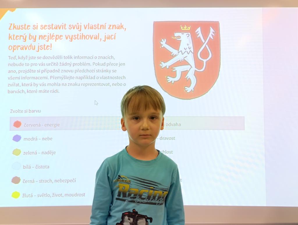 Prvňáci pracovali s interaktivní tabulí, kdy si navrzhovali jslastní malý znak, rozeznávali a určovali rozmístění barev a symbolů na velkém státním znaku, zpívali hymnu, skládali puzzle (velký a malý státní znak, standarta, vlajka, pečeť), vyrobili si vlaječku, apod.
