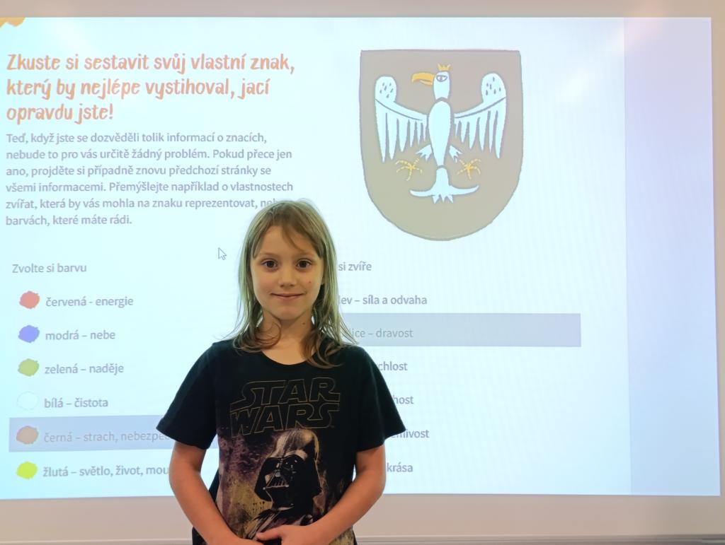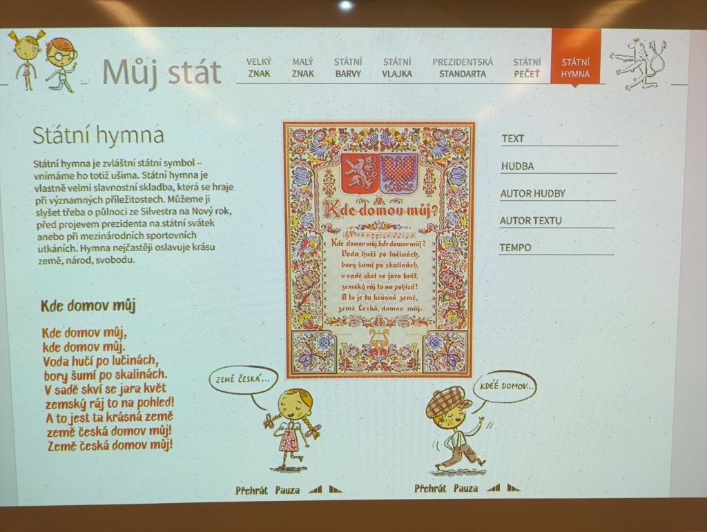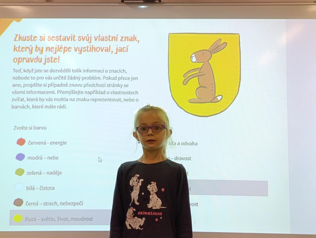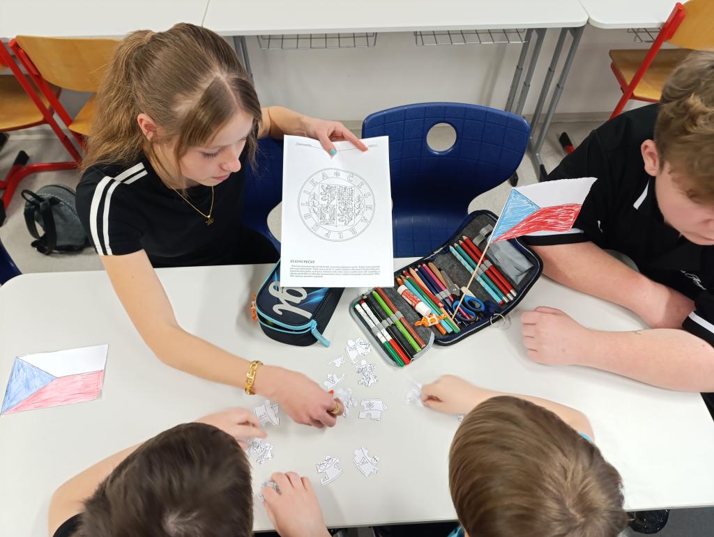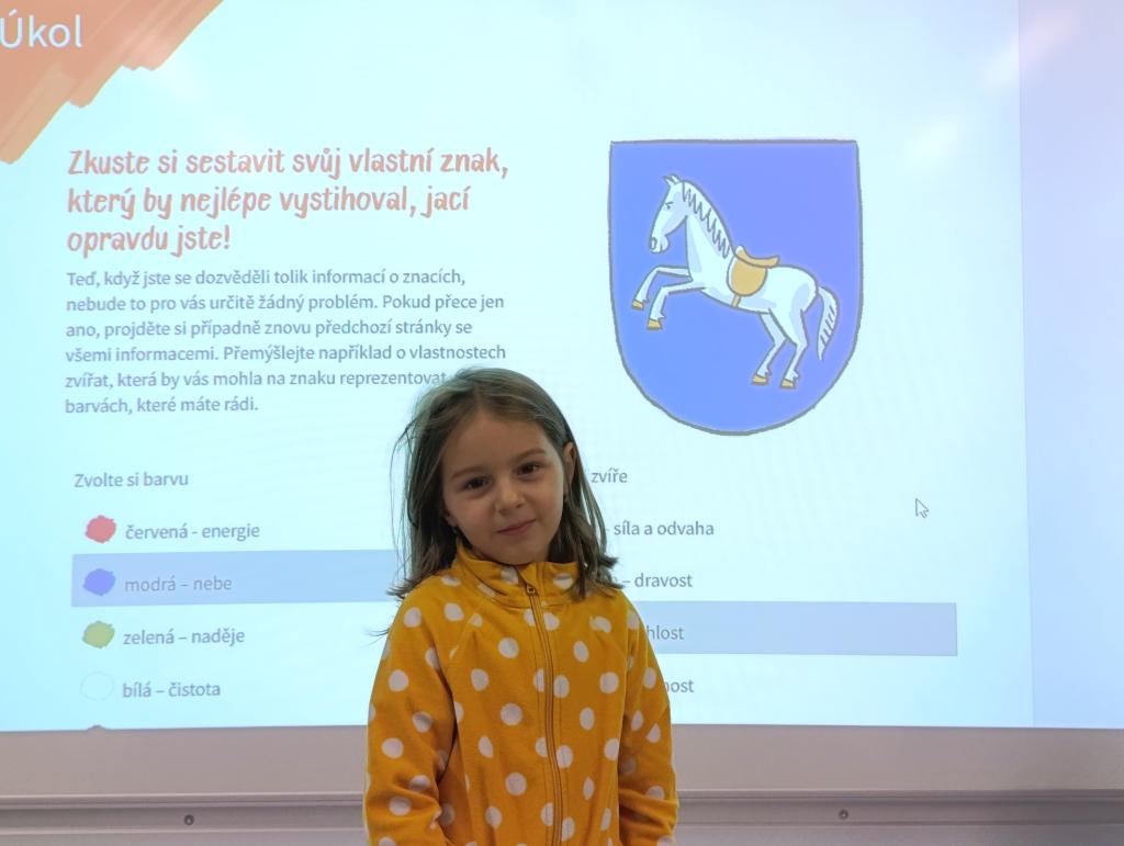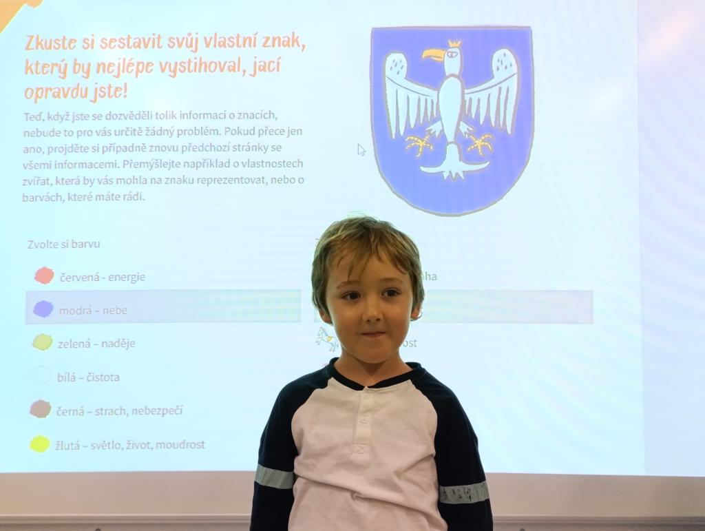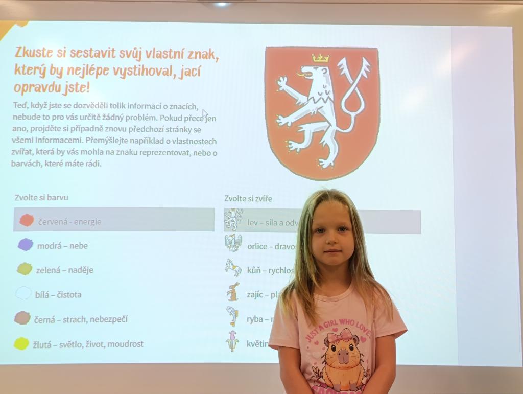 Prvňáci pracovali s interaktivní tabulí, kdy si navrzhovali jslastní malý znak, rozeznávali a určovali rozmístění barev a symbolů na velkém státním znaku, zpívali hymnu, skládali puzzle (velký a malý státní znak, standarta, vlajka, pečeť), vyrobili si vlaječku, apod.