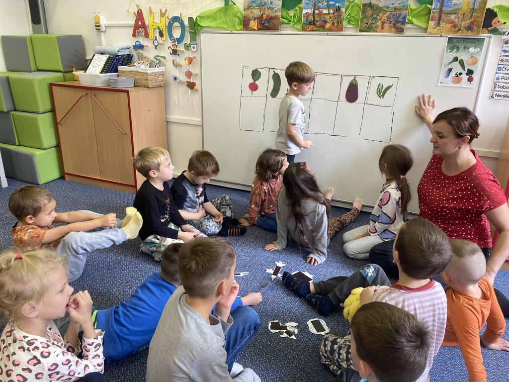 V uplynulých dnech jsme si s našimi předškoláčky povídali o ovoci a zelenině. Děti se učily básničky, písničky a hravou formou poznávaly a pojmenovávaly různé druhy ovoce a zeleniny. Zapojením smyslů (chuť, čich, hmat) rozlišovaly, jak ovoce a zelenina vypadá, voní a chutná. Nezapomněli jsme ani na výtvarné tvoření a dramatizaci. Pohádka O veliké řepě se dětem moc líbila. Měli jsme také možnost vyzkoušet si nákup ovoce a zeleniny v rodinném obchodě u Novotných. Děti dostaly obrázkový nákupní seznam s uvedeným počtem kusů. V obchodě se chopily košíku a vyrazily nakupovat. Z nákupu byly nadšené a měly radost, že ho zvládly. Toto téma nám poskytlo spoustu důležitých informací a děti se dozvěděly, že je důležité ovoce a zeleninu jíst, abychom byli všichni zdraví.