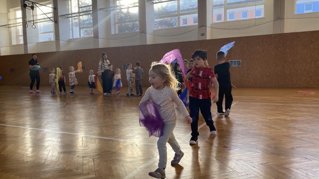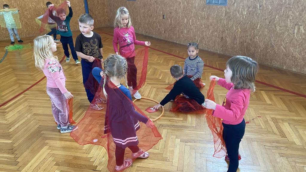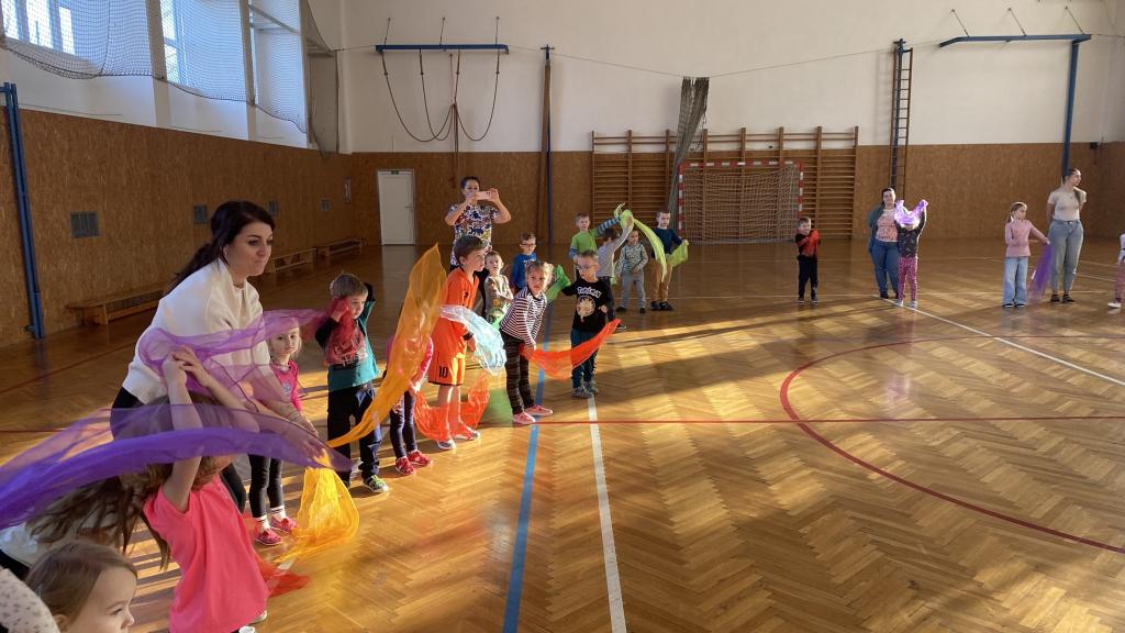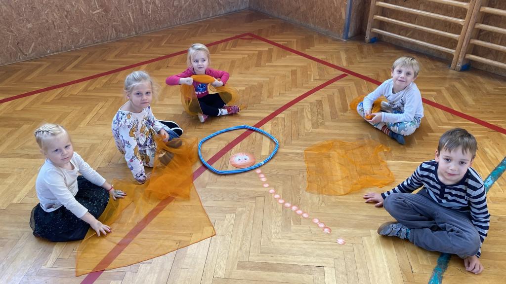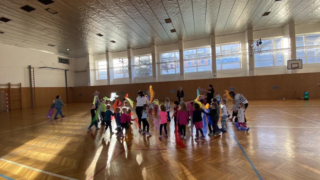 V pátek 14. 11. nás potěšily svoji návštěvou děti z MŠ Budovatelů. Společně jsme se vydali do naší oblíbené tělocvičny, kde nás čekala hodina plná pohybových her motivovaná tematikou Dráčků. Děti si zacvičily s barevnými šátky za doprovodu veselých písniček. Hrály pohybovou hru s tvary, ze kterých skládaly dračí ocásky. Trénovaly svoji obratnost při lezení na žebřinách a houpání na kruzích. Nechyběly ani míčové hry a dostatek volného pohybu. Společné cvičení se nám moc líbilo a už teď se těšíme, až nás mladší kamarádi zase navštíví.