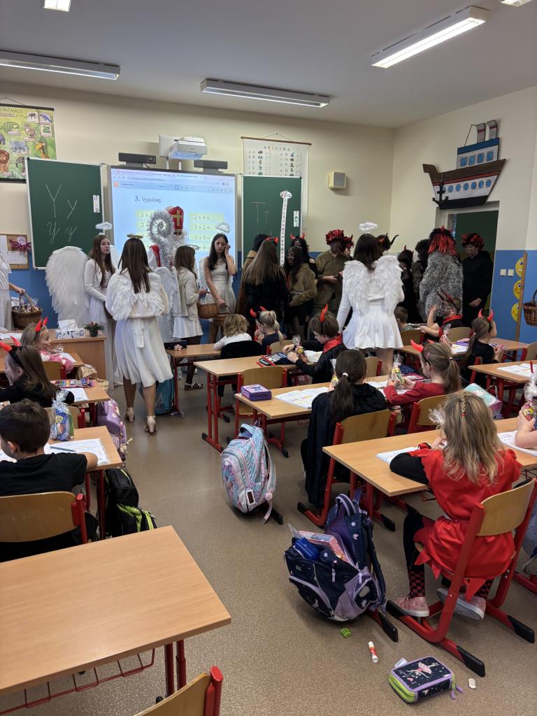 O velké zpestření se postarali žáci devátých tříd, kteří k nám přišli převlečení za opravdové čerty, anděly a Mikuláše. Prvňáčci statečně přednesli básničku a ukázali, že si pochvaly od Mikuláše zaslouží. Za statečnost dostali i baliček plný dobrot.