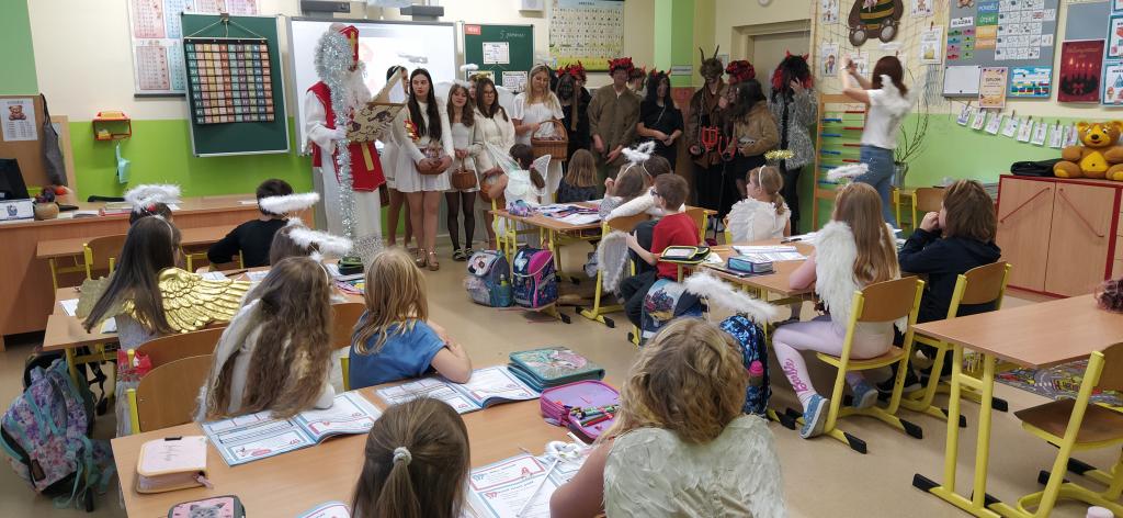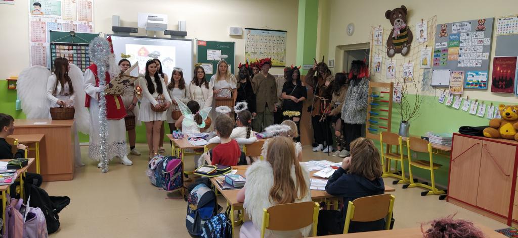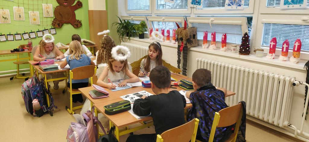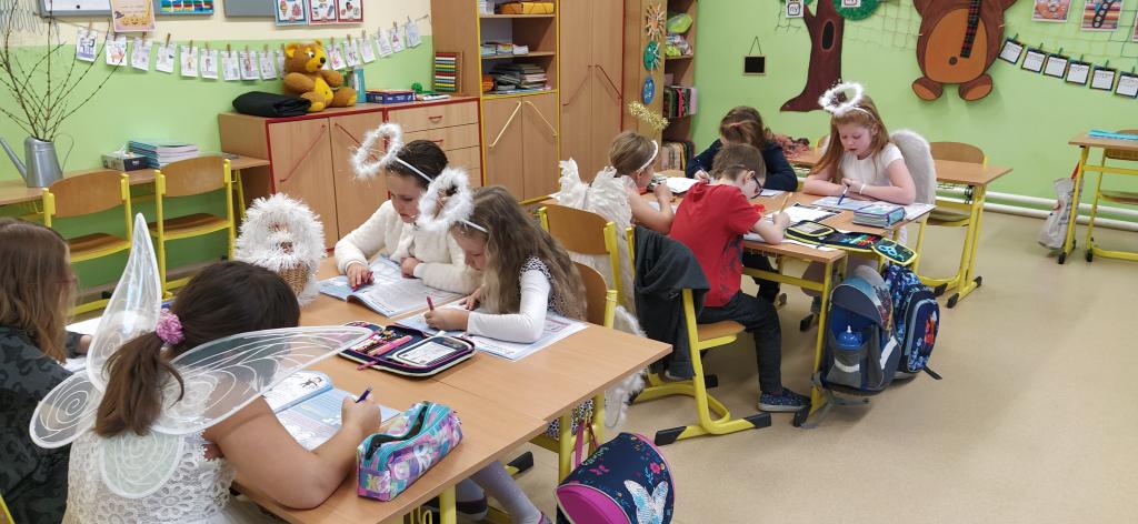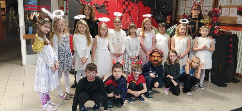 v andělsko-čertovskou školu. Děti plnily zábavné úkoly ve skupinách, zpívaly, recitovaly a těšily se na vzácnou návštěvu andělů, čertů a samozřejmě i samotného Mikuláše.