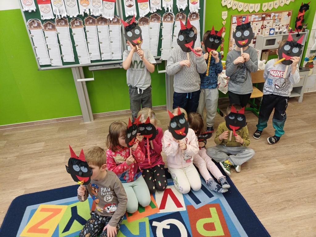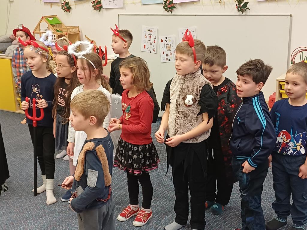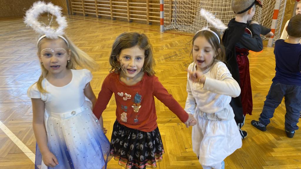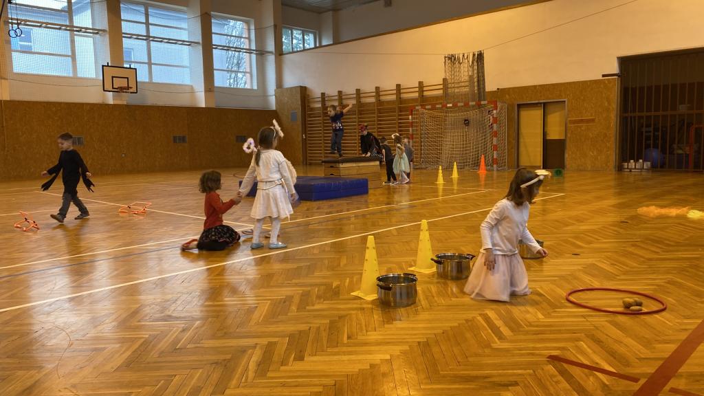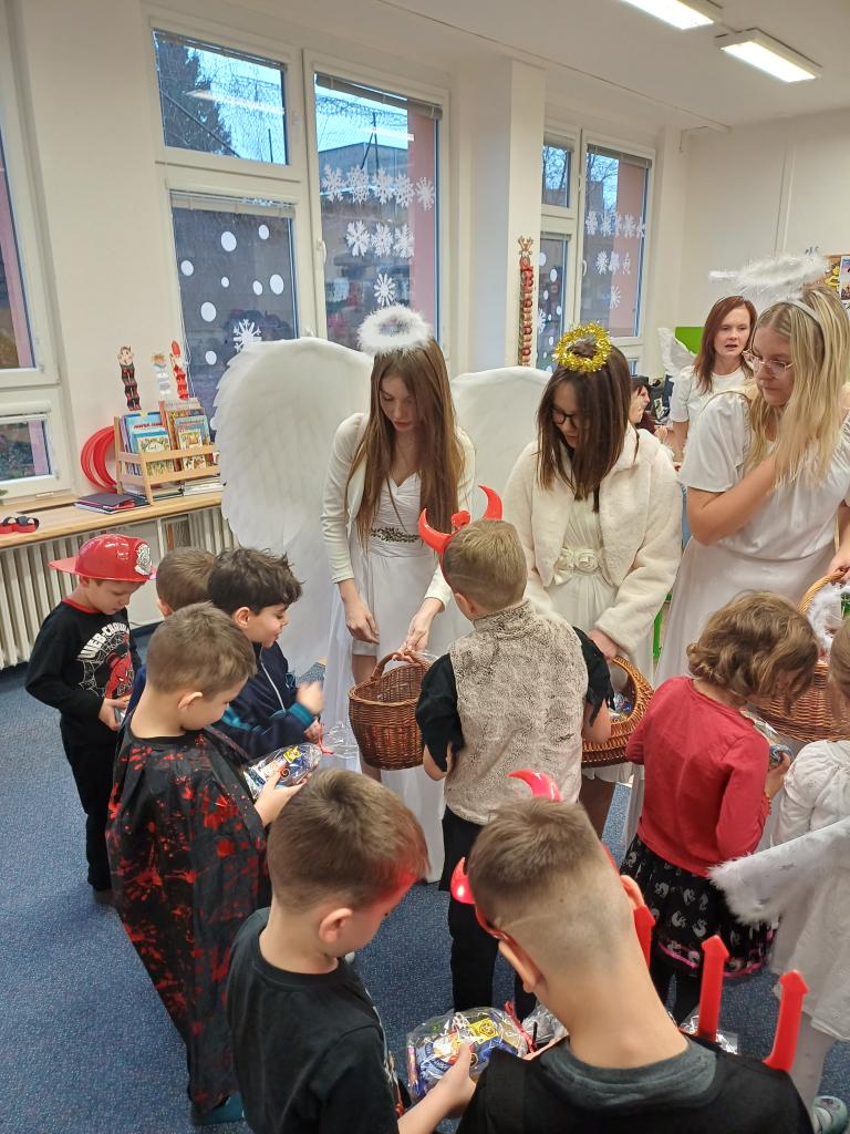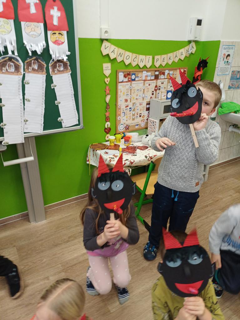 V uplynulém týdnu jsme si v přípravné třídě užili opravdu pohádkovou atmosféru, která se nesla v duchu čertů, andělů a Mikulášů. Celé naše čertovské řádění jsme zahájili návštěvou v Mateřské škole Budovatelů, kam nás pozvaly paní učitelky Radka a Mirka. Děti zde čekalo velké překvapení – peklo ve sklepě, které si pro nás paní učitelky připravily. Uvnitř nás přivítal hodný čertík, jenž si s dětmi zahrál karty. Tímto bychom chtěli paní učitelkám za milé pozvání srdečně poděkovat. Na tuto návštěvu jsme ve třídě navázali pestrými aktivitami. Děti si zpívaly čertovsko-andělské písničky, výtvarně tvořily a plnily tematické úkoly, které rozvíjely jejich fantazii, jemnou motoriku. Velkým zážitkem bylo čertí dopoledne v tělocvičně, kde jsme připravili řadu zábavných sportovních her. Děti si vyzkoušely skákání v pytli, zdolávaly pekelnou překážkovou dráhu, sestavovaly velkou hlavu čerta a také soutěžily v oblíbené hře - hod bramborou do hrnce.