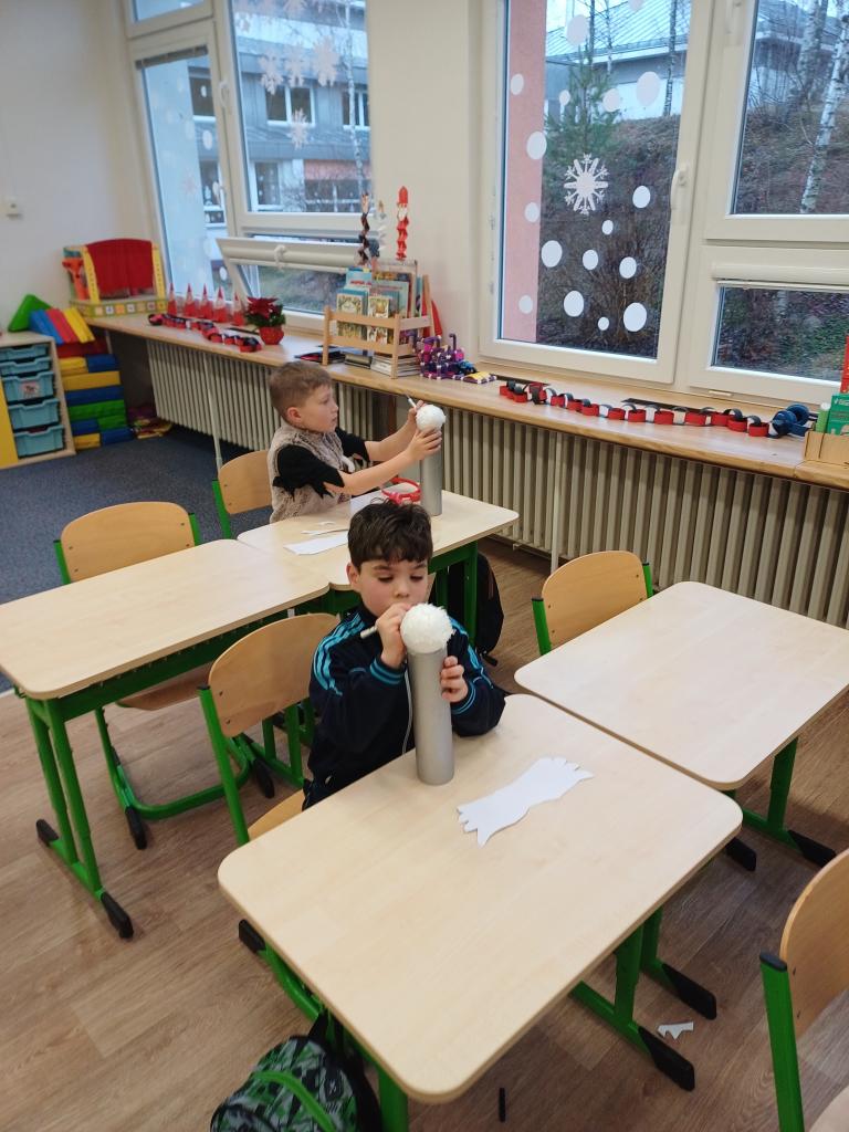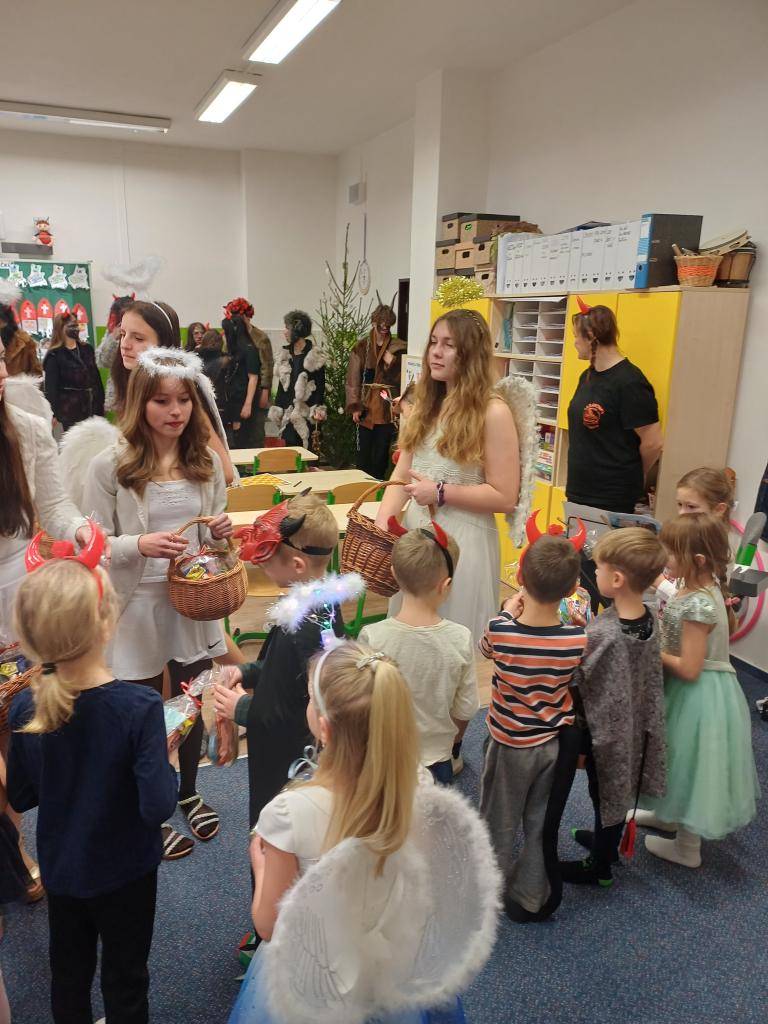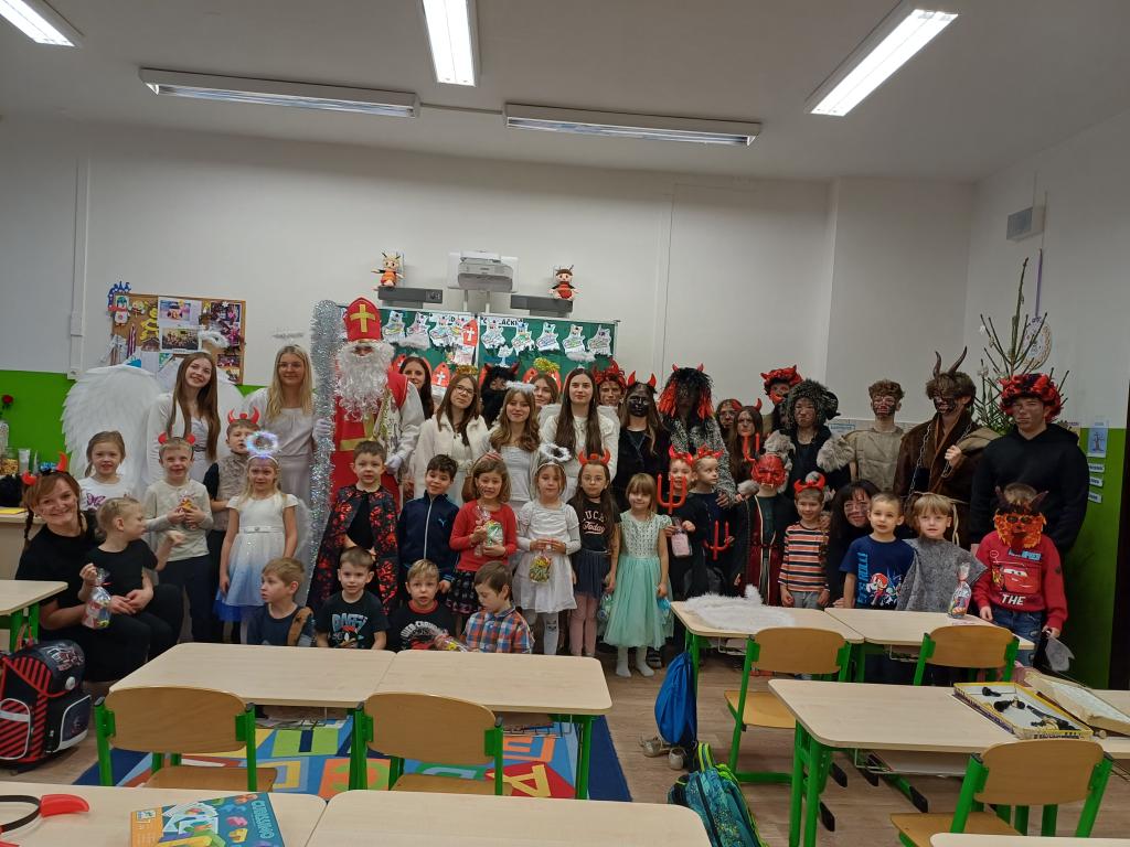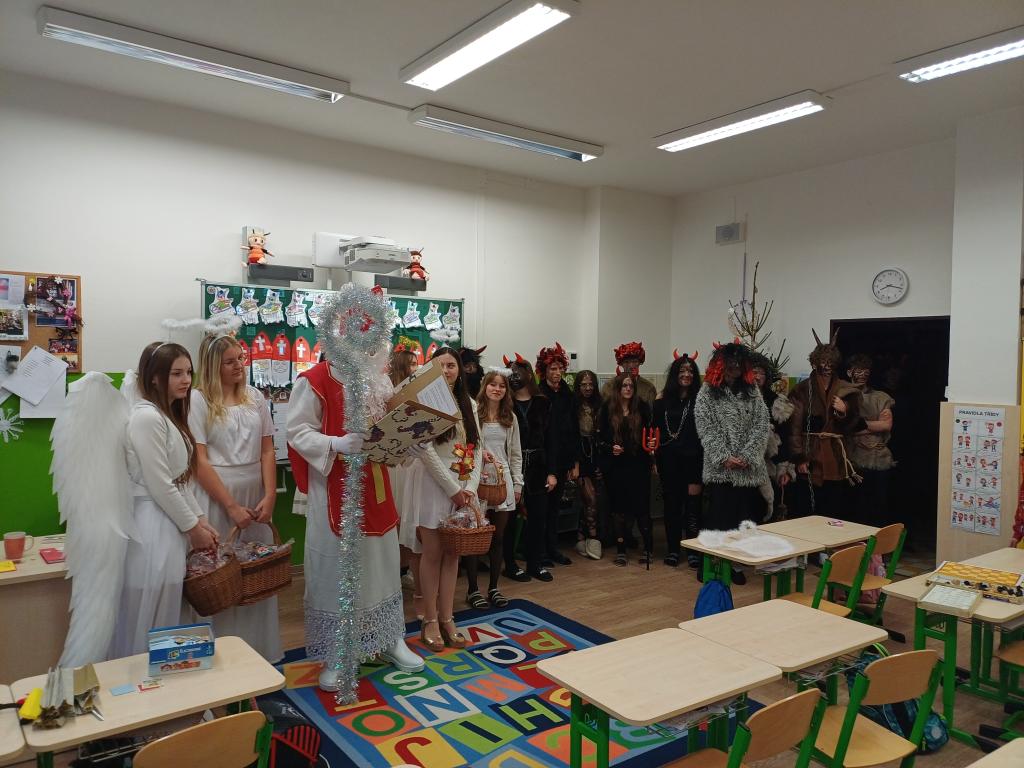 Vyvrcholením celého týdne byla návštěva Mikuláše, andílka a čerta přímo v naší třídě. Přišli se podívat, co všechno děti zvládly, a za jejich snahu je odměnili sladkými dobrotami. Atmosféra byla přátelská a milá, a i když se pár dětí zpočátku trochu bálo, díky podpoře kamarádů a paní učitelek vše proběhlo bez slziček.