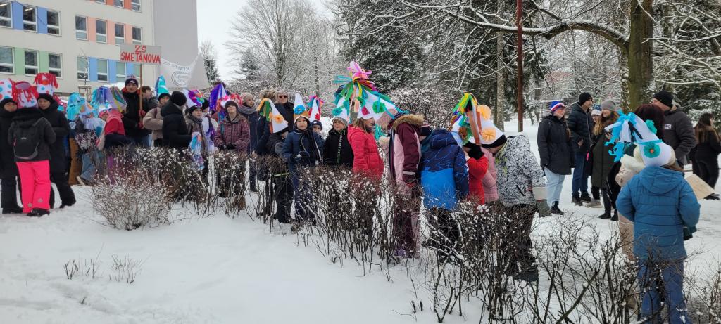 Program začal v dopoledních hodinách, a to před Základní školou Smetanova, kde se o půl 10 shromáždily děti ze všech hlineckých základních a mateřských škol v nádherných originálních čepicích. Po zahájení se dlouhý průvod vydal za doprovodu dechové kapely Mrákotínka na cestu hlineckými ulicemi. Krátká zastávka potěšila i obyvatele Domova seniorů Drachtinka, kde si děti zatančily a za odměnu dostaly bonbon. Odtud pak průvod pokračoval přes Wilsonovu a Komenského ulici na Betlém. Děti si vysloužily za svou účast a nápaditost při výrobě masopustních čepic výborné masopustní koblihy.