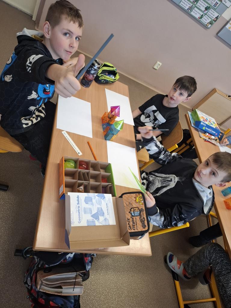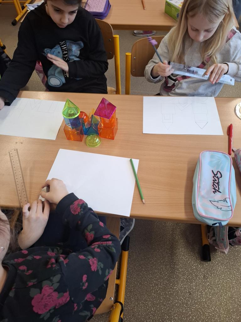 Dále se Mravenečci v hodinách matematiky věnovali stavbám. Z různých geometrických těles stavěli