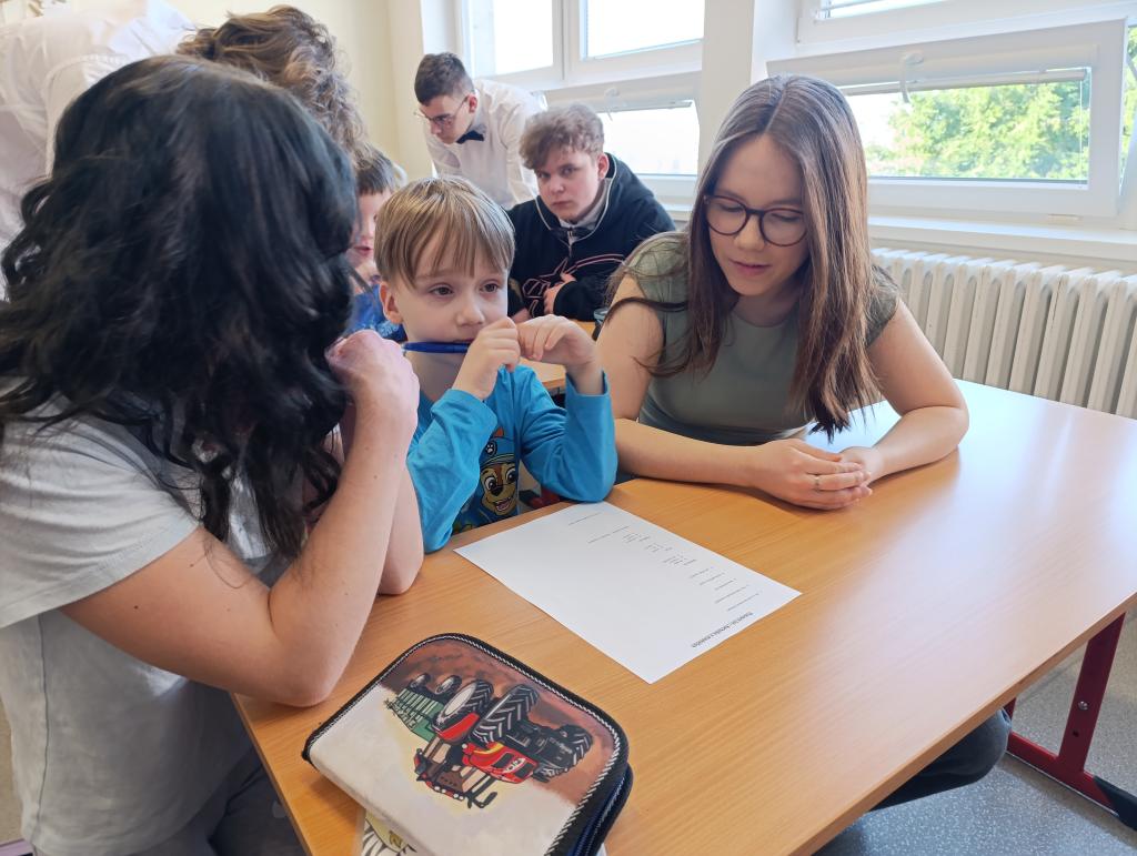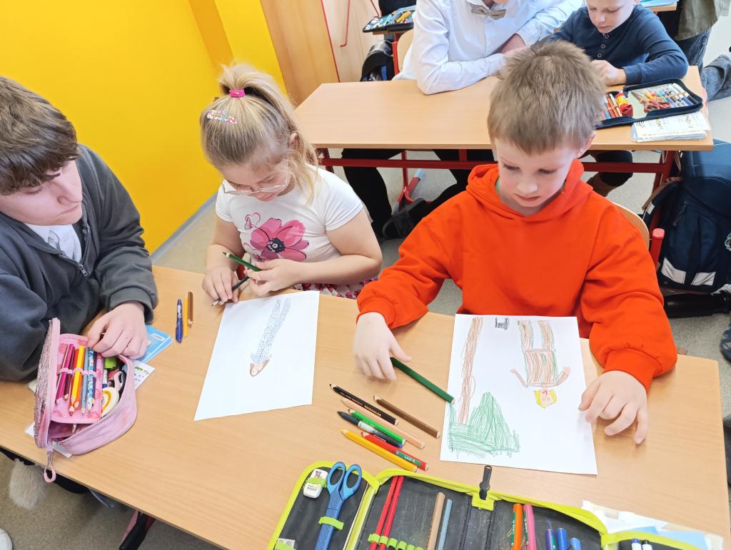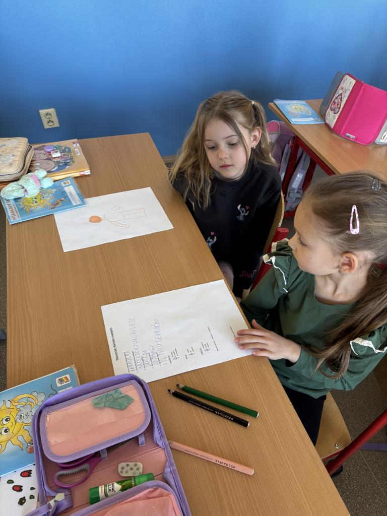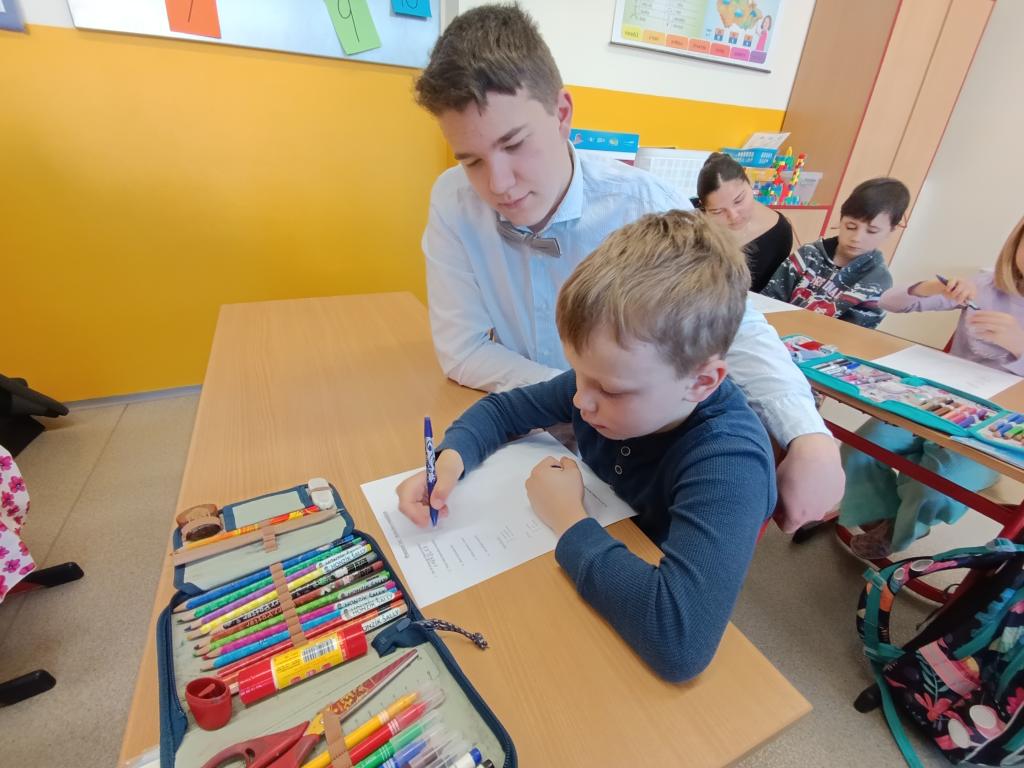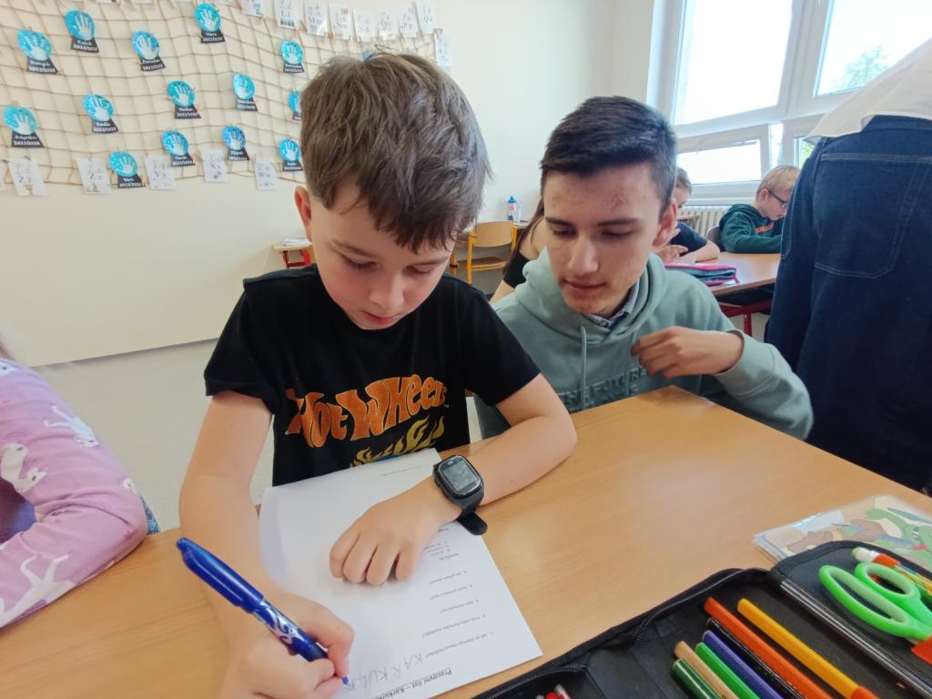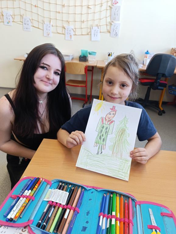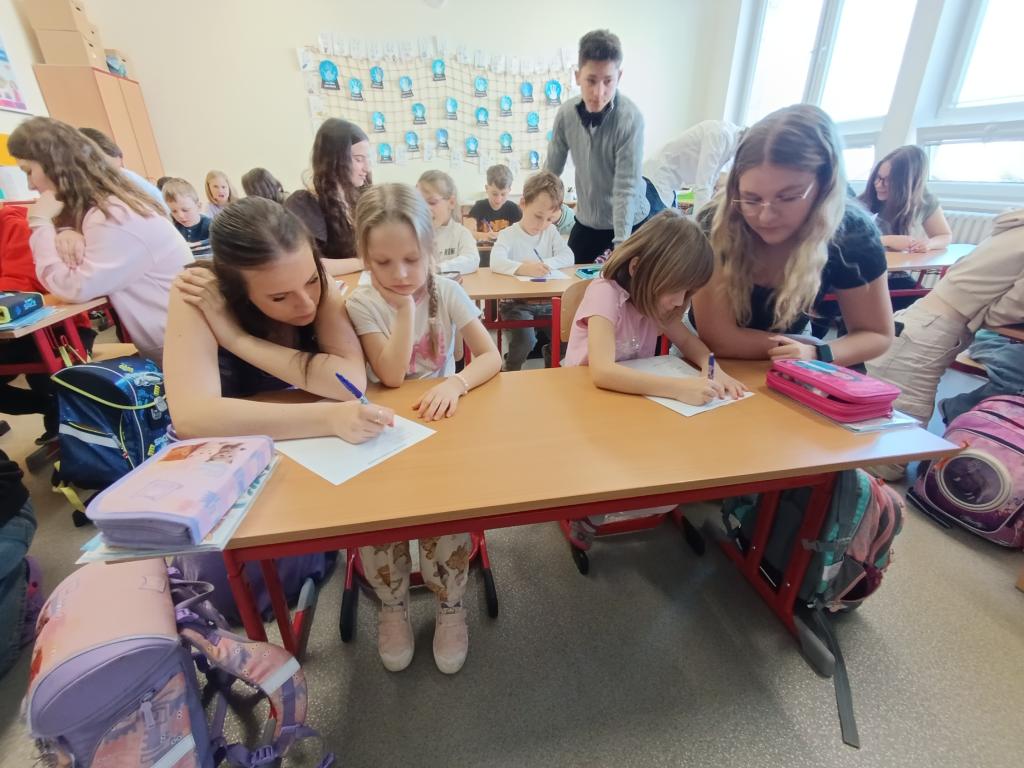 Po čtení následovala výtvarná aktivita, při které prvňáčci malovali Karkulku podle své fantazie. Vznikla spousta krásných a originálních obrázků, které ukázaly, jak děti příběh vnímají. Deváťáci jim při malování pomáhali a společně si užili i tuto tvořivou část programu.