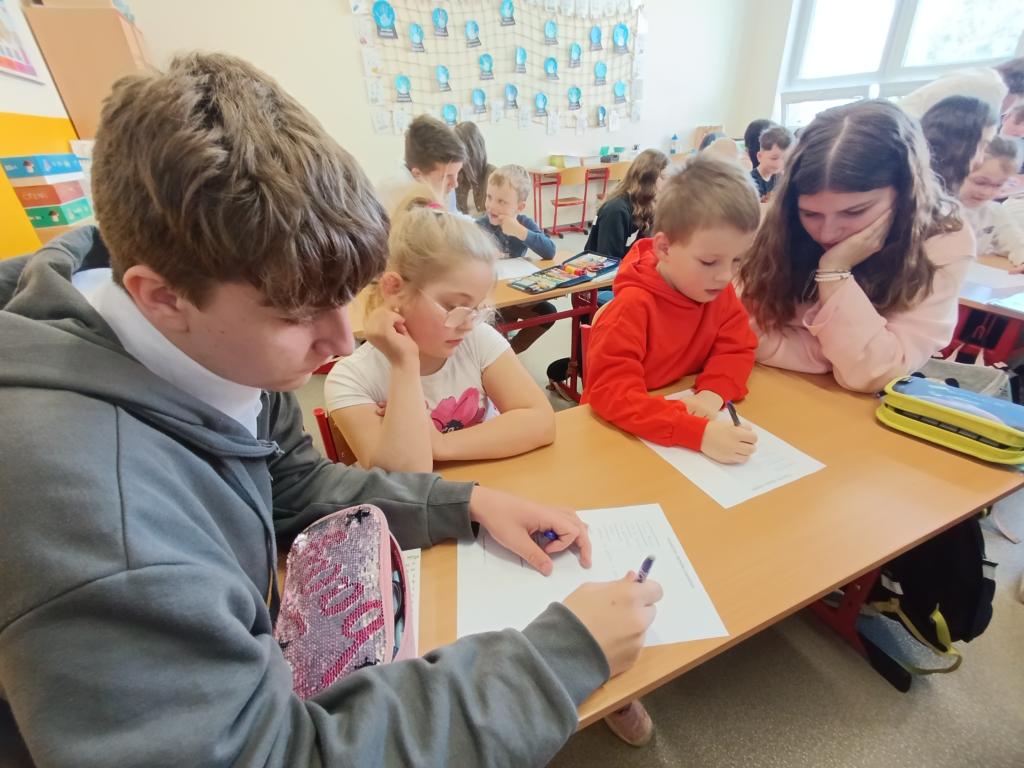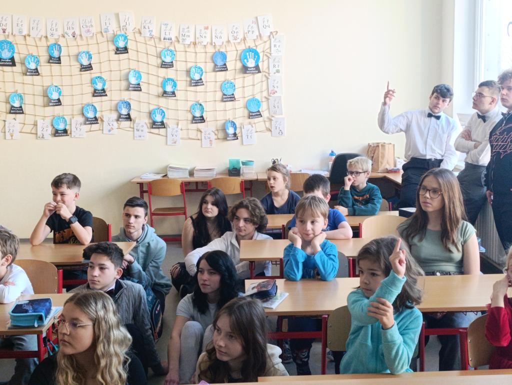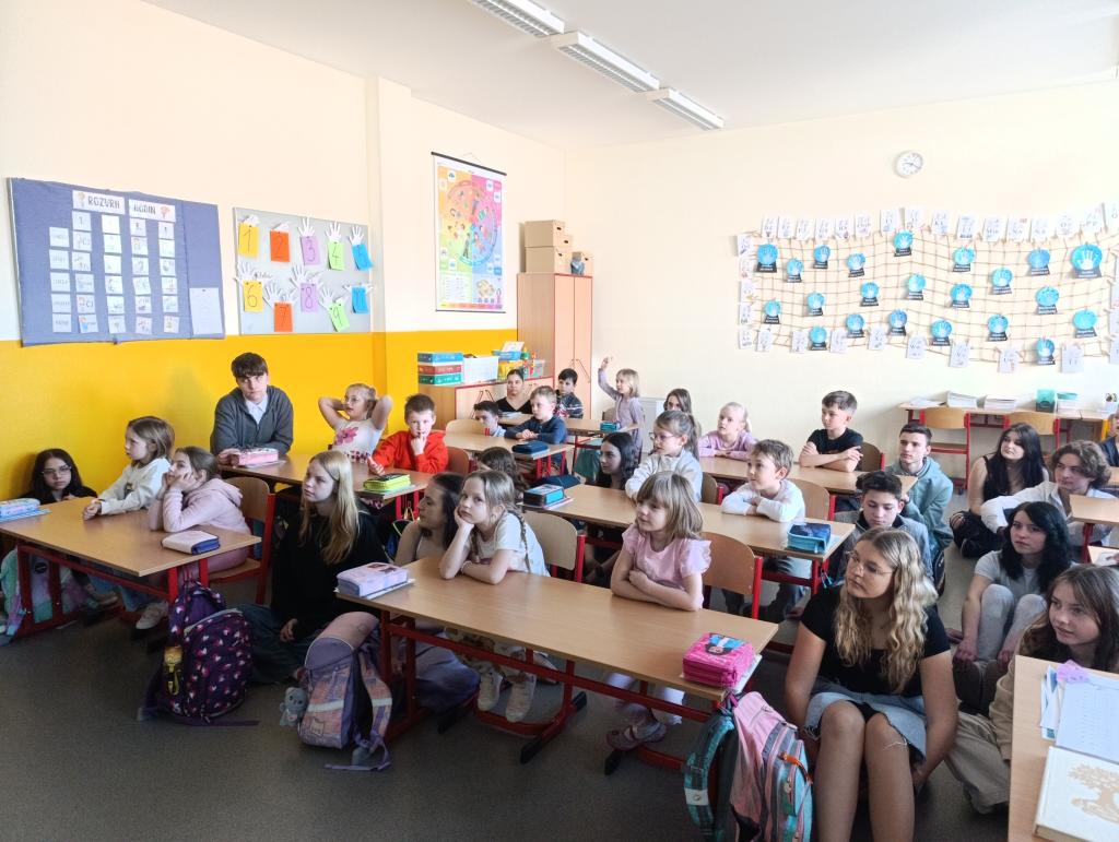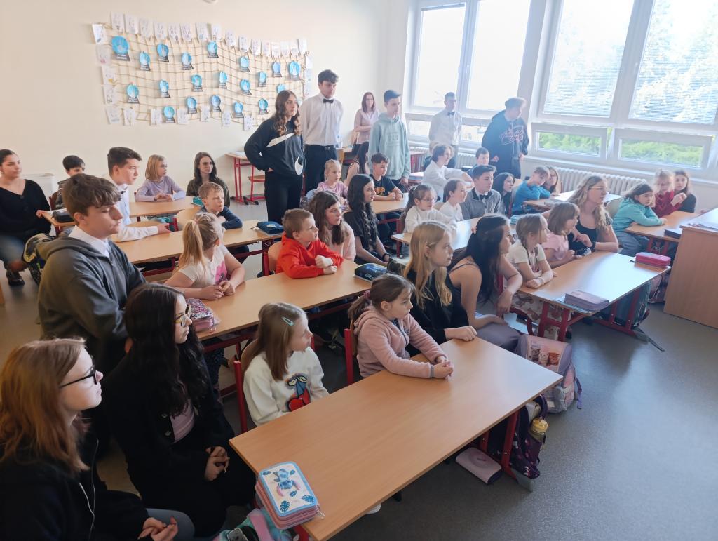 Součástí programu bylo také poslechové čtení v podání známého herce a vypravěče Miroslava Donutila, jehož nahrávka děti velmi pobavila. Prvňáčci se zaujetím poslouchali a deváťáci jim pomáhali lépe porozumět příběhu.