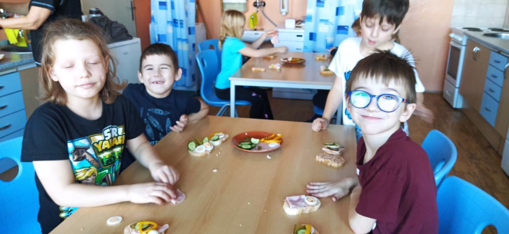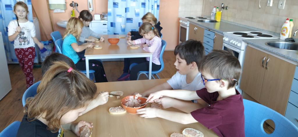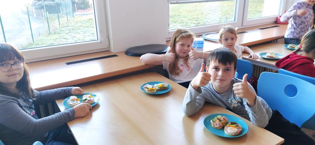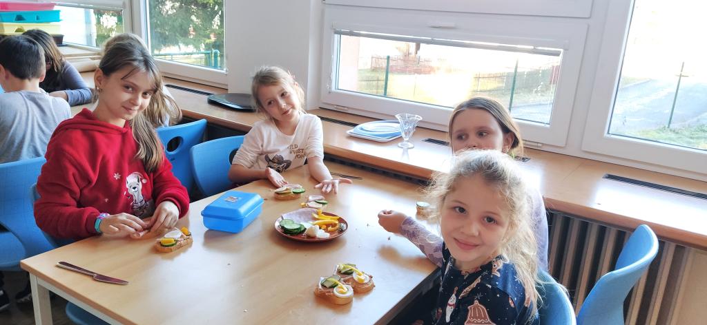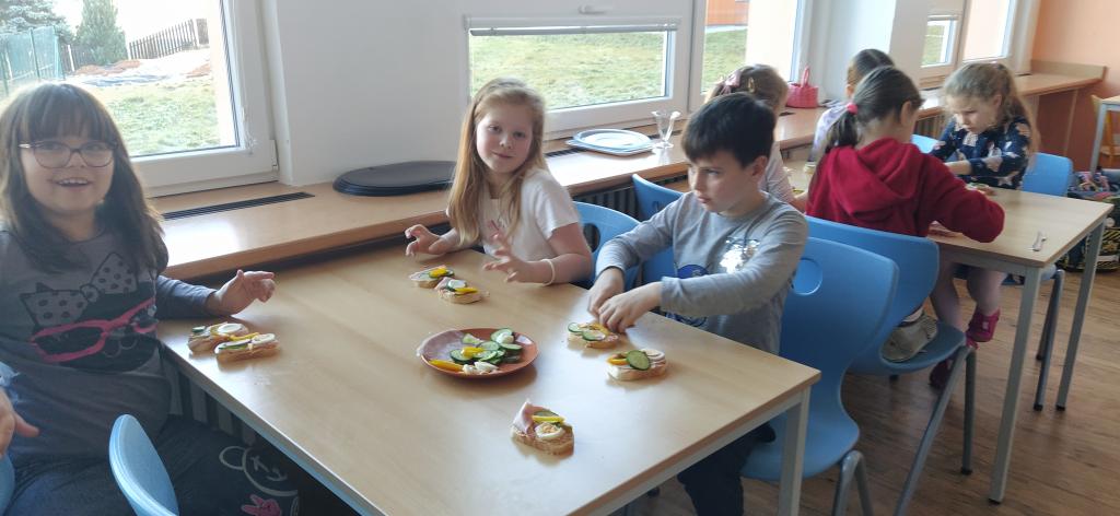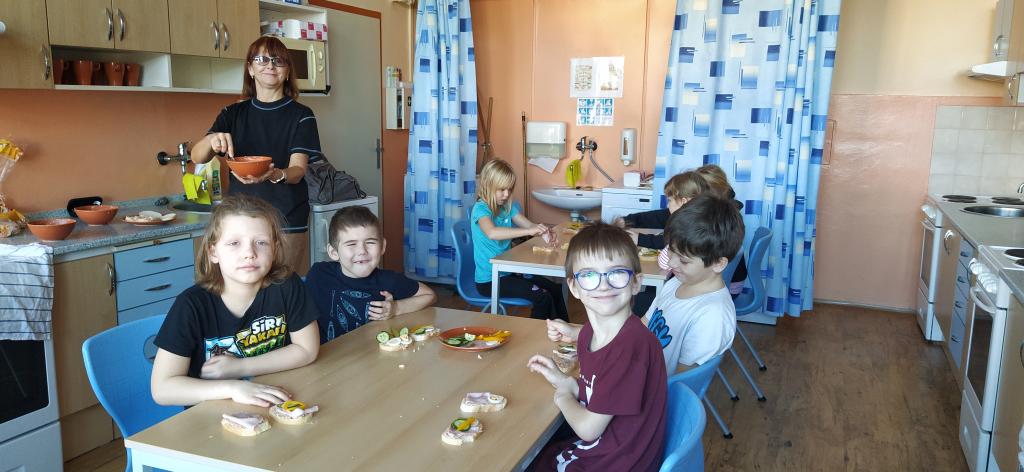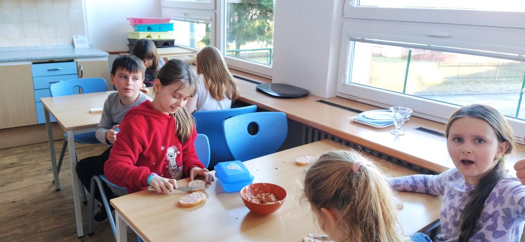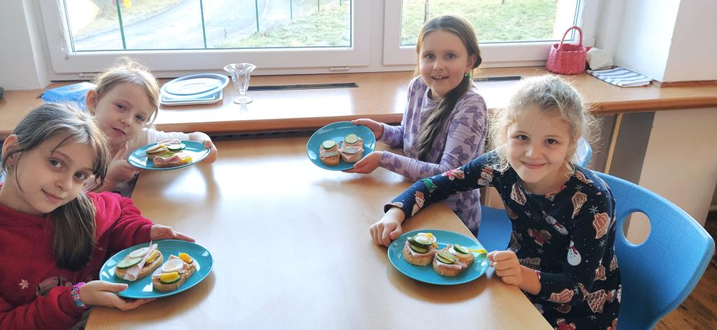V předvánočním čase jsme si s Medvíďátky užili příjemné a radostné dopoledne plné pohody, zpěvu a tvoření. Nejprve jsme se sešli u vánočního stromečku, kde jsme si společně s dětmi z celé školy zazpívali vánoční koledy a naladili se na sváteční atmosféru. Poté jsme se přesunuli do kuchyňky, kde na děti čekala praktická a velmi oblíbená činnost – vaření. Vzhledem k blížícím se vánočním svátkům a Silvestru se děti učily připravit pomazánku na chlebíčky – dovednost, která se jim v tomto svátečním období jistě bude hodit. S radostí se děti pustily do práce, která je bavila. Každý si tvořil své vlastní chlebíčky, které si dozdobil podlé vlastní fantazie. Hotové pochoutky si s chutí snědly a některé děti si je odnesly domů, aby je mohly ochutnat i s rodiči. Celé dopoledne bylo nabité radostí, spoluprací a vánoční atmosférou.