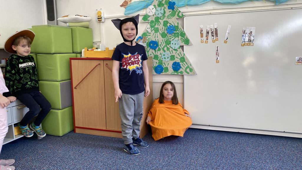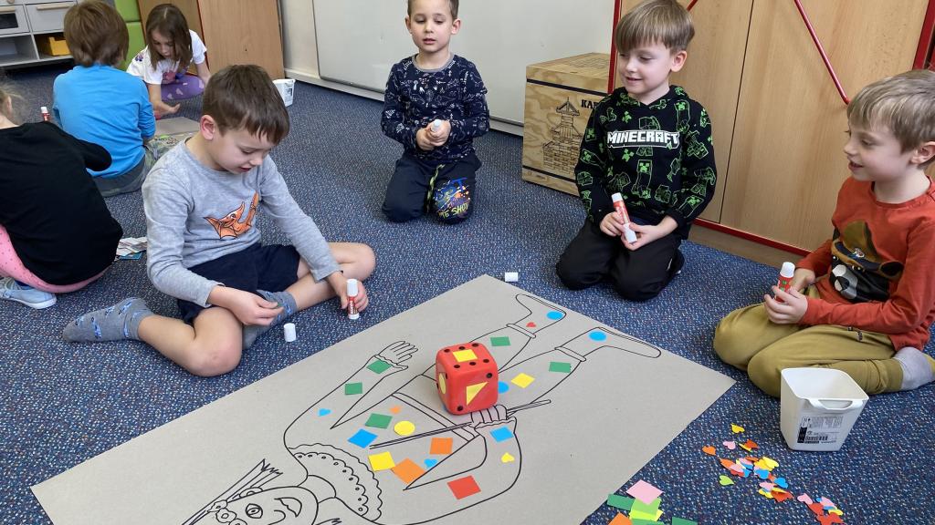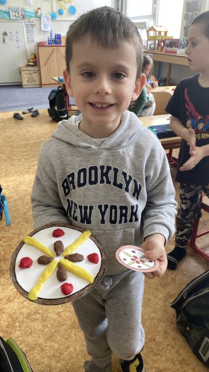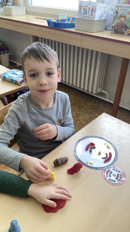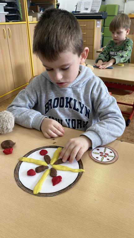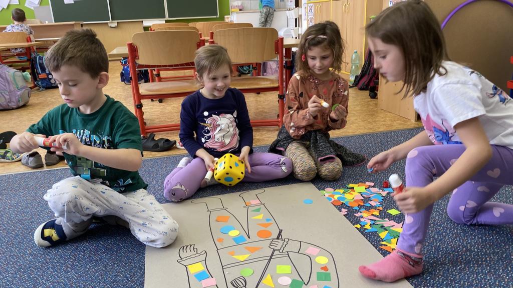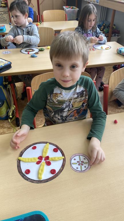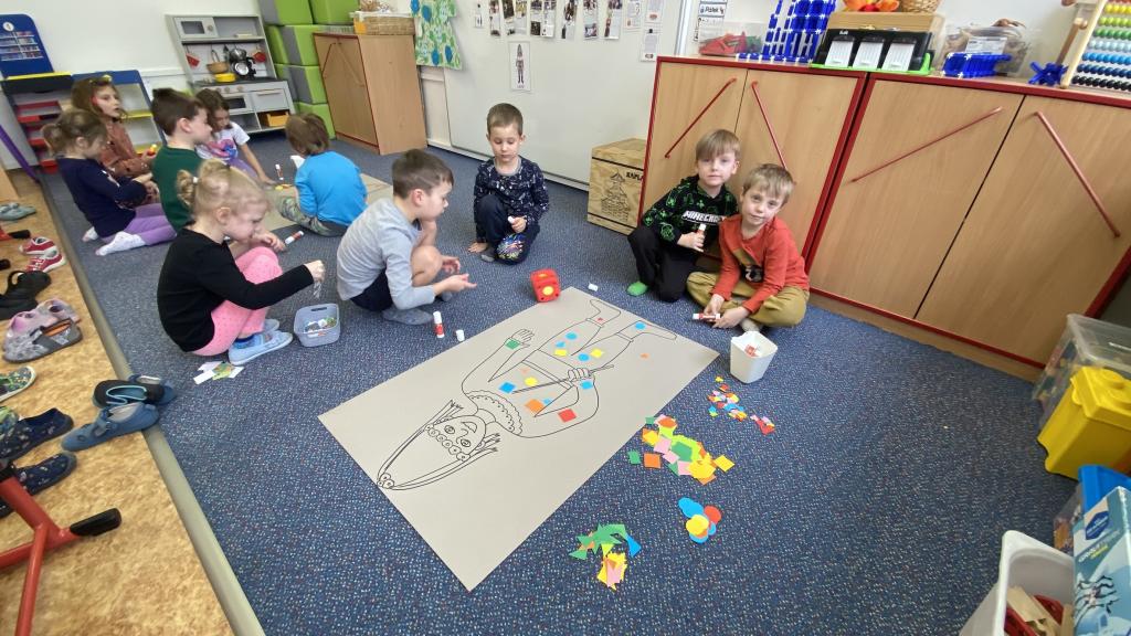 Program jsme zahájili pohádkou O koblížkovi, protože právě koblihy, koláče a další dobroty jsou neodmyslitelnou součástí masopustního období. Povídali jsme si o tom, proč se masopust slaví a jaké zvyky k němu patří. Děti si poté vyrobily barevné čepice, jaké nosí Laufr, a naučily se také jeho veselý taneček. Nechybělo ani tvoření z modelíny – modelovali jsme koláče a společně je počítali. Při této aktivitě jsme si procvičili nejen jemnou motoriku, ale i předmatematické dovednosti.Společně jsme si představili jednotlivé masopustní postavy, které si děti vybarvily podle vlastní fantazie. Na závěr jsme procvičili geometrické tvary, kterými jsme ozdobili postavu Laufra.