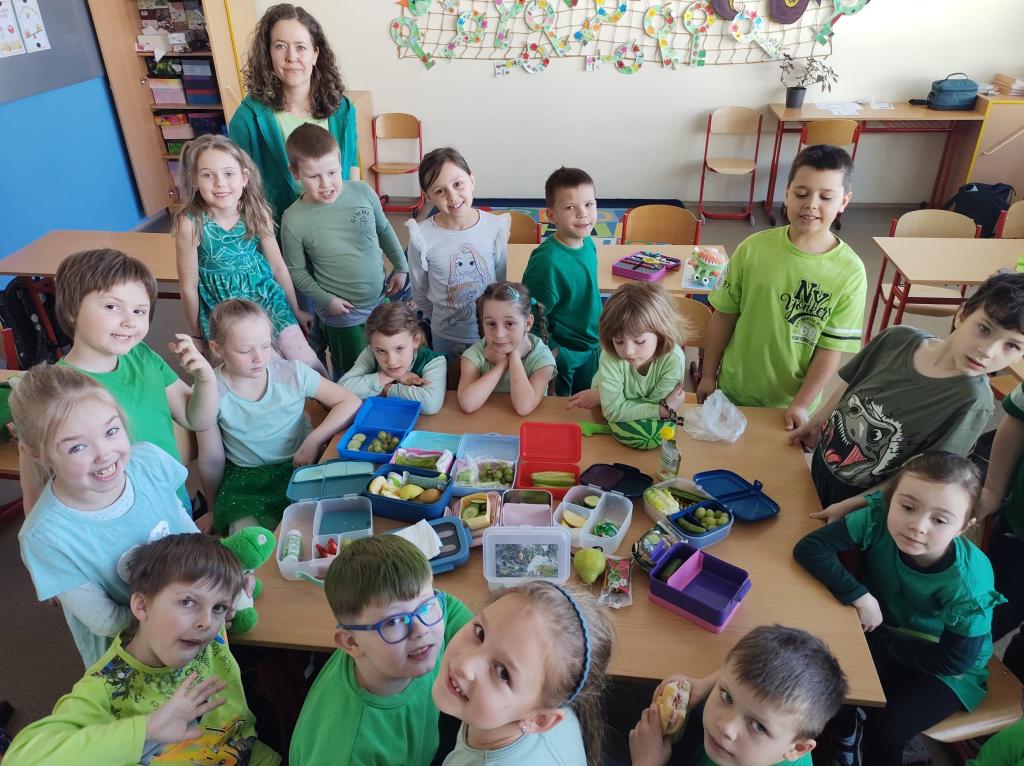 Děti přišly oblečené do různých odstínů zelené barvy a některé si dokonce přinesly i zelené svačinky, které nám zpestřily společné chvíle. Velkou radost nám udělali také jejich zelení plyšáci, kteří nás po celý týden doprovázeli při aktivitách ve třídě.