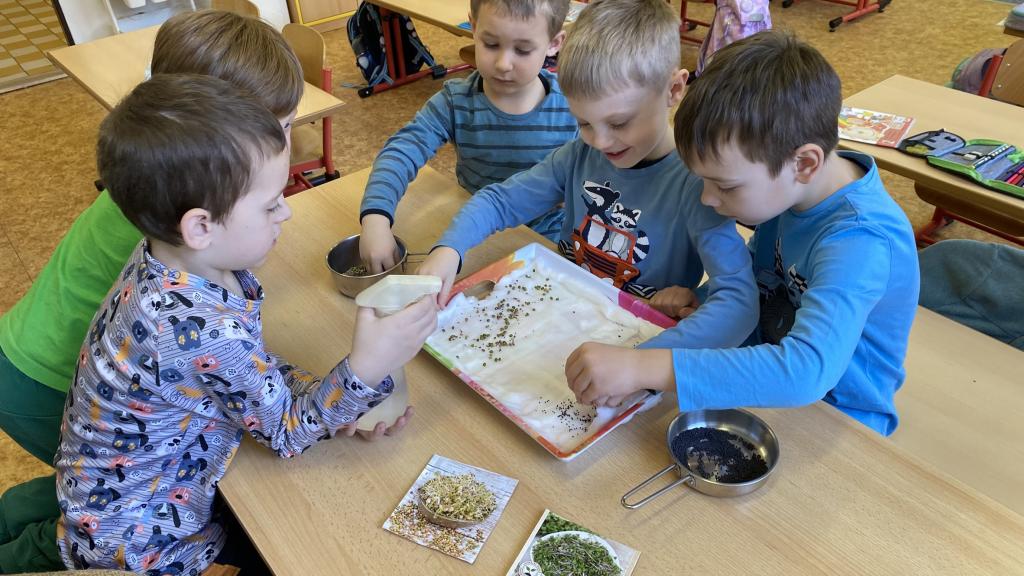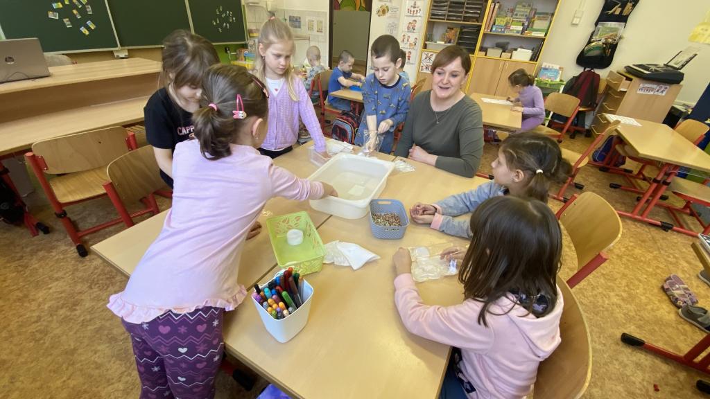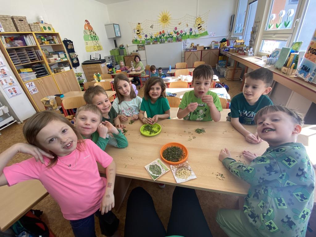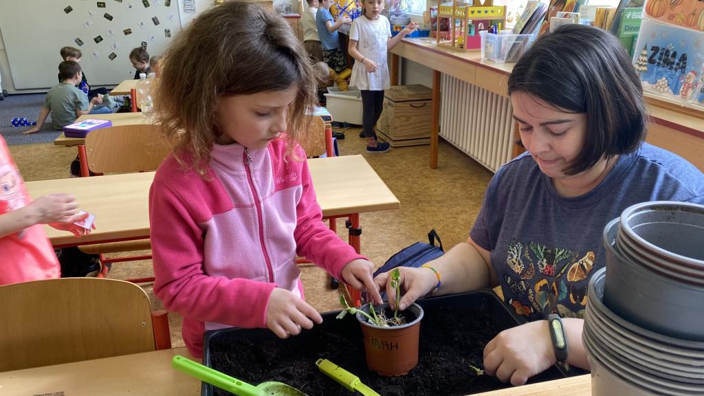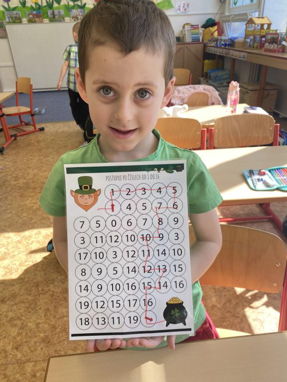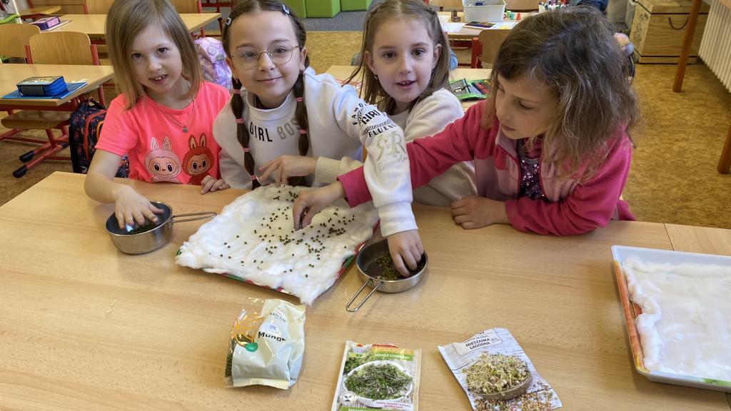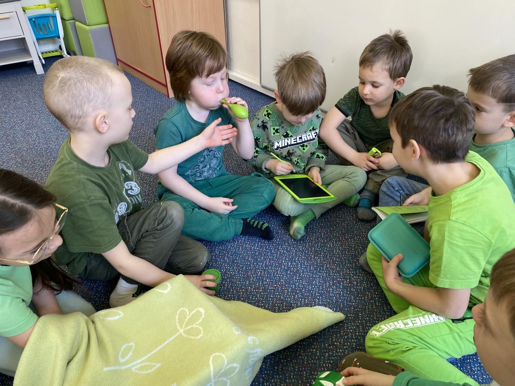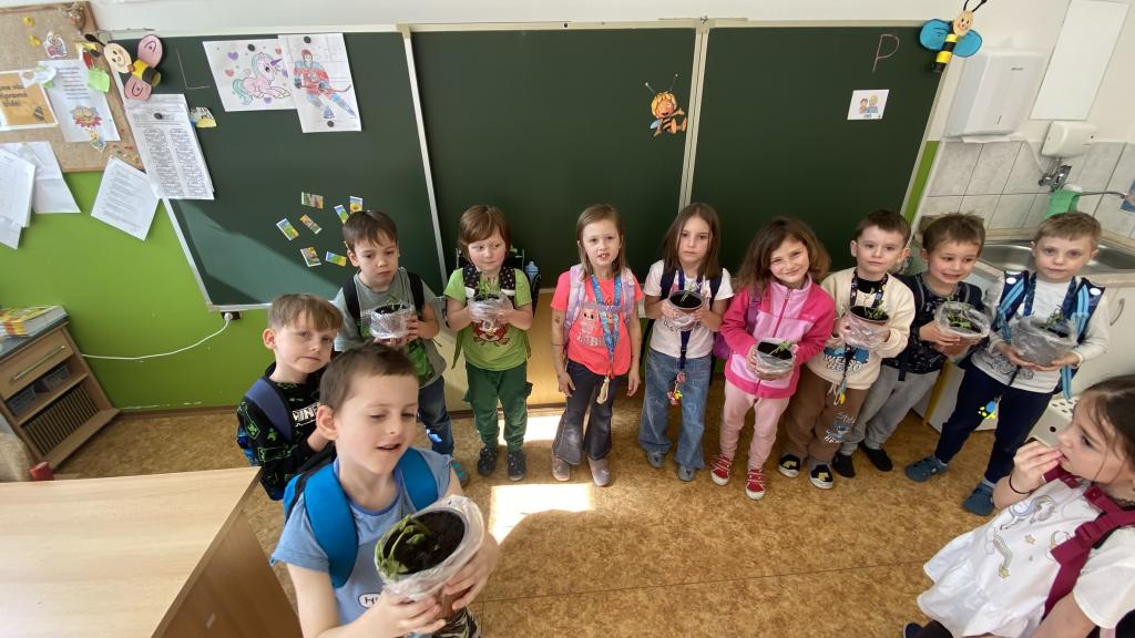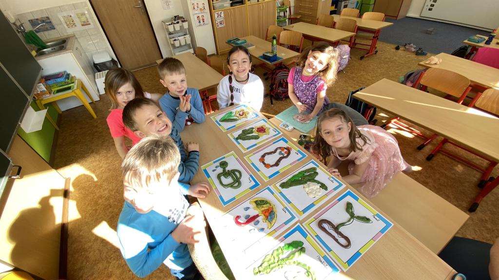 V pondělí 16. března odstartoval projektový týden, který rozzářil nejen naše přípravné třídy, ale i celou školu barvami jara. Objevování, dobrá nálada a společné aktivity nás těšily celý týden. Děti chodily v zeleném oblečení a přinesly dokonce i zelené svačiny, které jim moc chutnaly. Jako všechny učebny ve škole, tak i naše dostaly symbolický jarní klíč, který se objevil na dveřích naší třídy. Nebyl to obyčejný klíč — reagoval na splněné jarní výzvy. A že jich bylo! S dětmi jsme se starali o rostlinky – vyseté hrášky a fazolky. Děti měly radost, jak vše klíčí a roste. Po přesazení do hlíny si děti odnesly zelené květináčky domů. Na vatu jsme nechali také vyklíčit kadeřávek, čočku a mungo klíčky, na kterých jsme si s radostí po týdnu pěstování všichni pochutnali. Ve třídě jsme dělali další pestré aktivity spojené se zeleným týdnem – modelovali jarní obrázky, zpívali písničky o jaru, kreslili, vyráběli, četli příběhy a hráli si. Povídali jsme si o svátku svatého Patrika a plnili úkoly skřítka Leprikóna. Na památku jsme si namalovali kouzelné trojlístky, které nám budou připomínat důležité mezilidské hodnoty, jakými jsou láska, přátelství a pomoc druhým. Zelený týden jsme si všichni moc užili. Doufáme, že nám přinesl nejen radost, ale i zdraví a plno jarní energie!