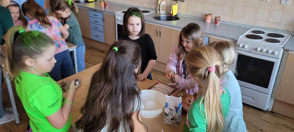 S plnými taškami jsme se vrátili do školy a přesunuli se do kuchyňky. Každá skupinka dostala svou pracovní plochu a mohlo se začít. Nadšení dětí bylo obrovské, vždyť si všechno dělaly samy! Odměřovaly mouku a cukr, vysypávaly plech, připravovaly drobenku a dokonce i krájely ovoce. Jen jeden paleček to odnesl, ale statečně to zvládl a mohl pokračovat dál. Málem jsme zapomněli na naše „zelené kouzlo“, protože v kuchyňce bylo chvílemi tak rušno a hlučno, že jsme nevěděli, čí jsme. Když je v jedné malé kuchyni 18 kuchaříčků, vzniká něco mezi profesionální kuchyní a mraveništěm. Když bylo hotovo, vložili jsme koláče do trouby, popřáli jim hodně štěstí a šli se posilnit na oběd, protože i cukráři potřebují energii.
