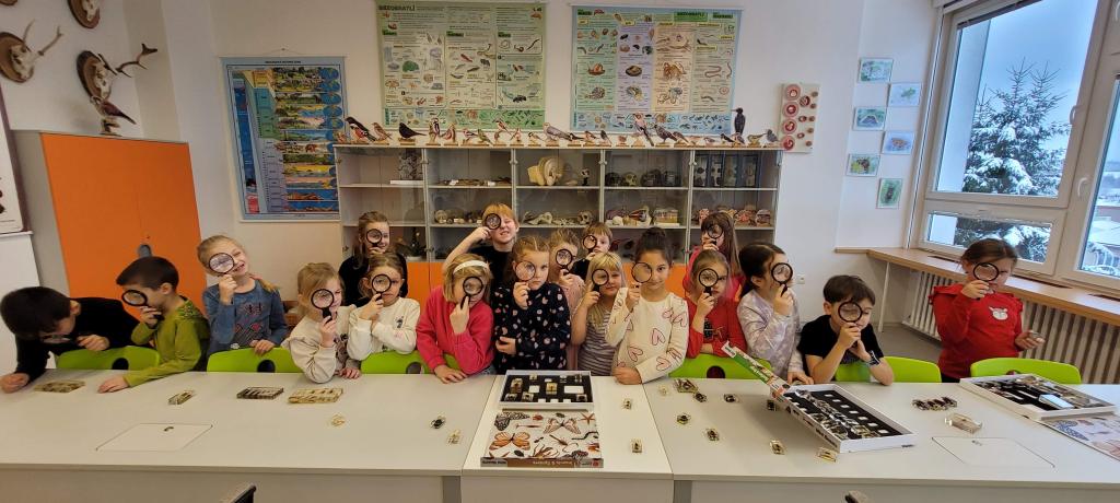 Žirafky už dva měsíce pravidelně poctivě čtou knížky podle svého výběru. Za 25 přečtení v měsíci si prvních deset čtenářů vybírá z karet aktivit. Tento měsíc si jednu kartu vybral i Ondra. Byla to karta Hodina na přání. Místo českého jazyka si přál jít do učebny přírodopisu a vyprávět nám o hmyzu. Nejprve si spolužáky vyzkoušel, co patří do hmyzu a pak už se děti chopily připravených lup začaly zkoumat