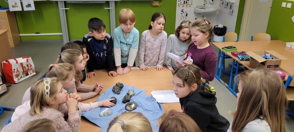 Žirafky už tři měsíce pravidelně poctivě čtou knížky podle svého výběru. Za 25 přečtení v měsíci si prvních deset čtenářů vybírá z karet aktivit. Tento měsíc si jednu kartu vybrala i Terinka. Byla to karta Hodina na přání. Místo českého jazyka si přála dětem ukázat horniny a nerosty, které přinesla od svého taťky tuneláře (razí tunel pro metro v Praze). Připravila si krátké povídání o každ&