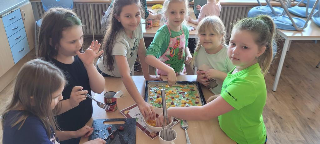 Ve čtvrtek 19. března jsme se s druháčky rozhodli, že se na jeden den proměníme v cukráře a upečeme si vlastní ovocný koláč. A protože celý týden probíhal v duchu zelené barvy, bylo jasno, i náš koláč bude zelený. Nejprve jsme si v hodině českého jazyka společně přečetli recept, povídali si o potřebných surovinách i pracovním postupu. A aby to nebyla nuda, zkusili jsme si postup předvést i pomocí pantomimy, takže jsme rozťuk&aacu