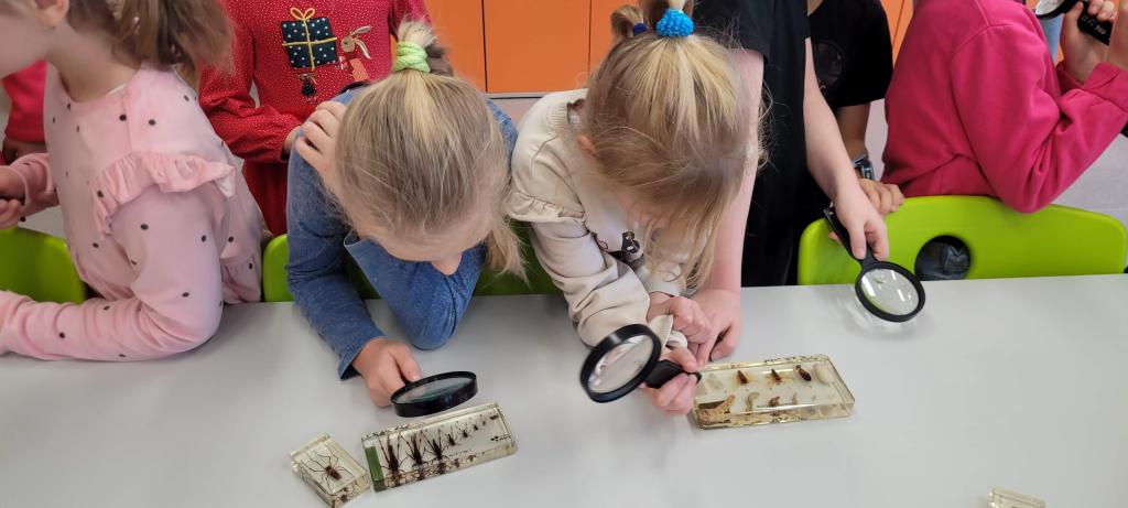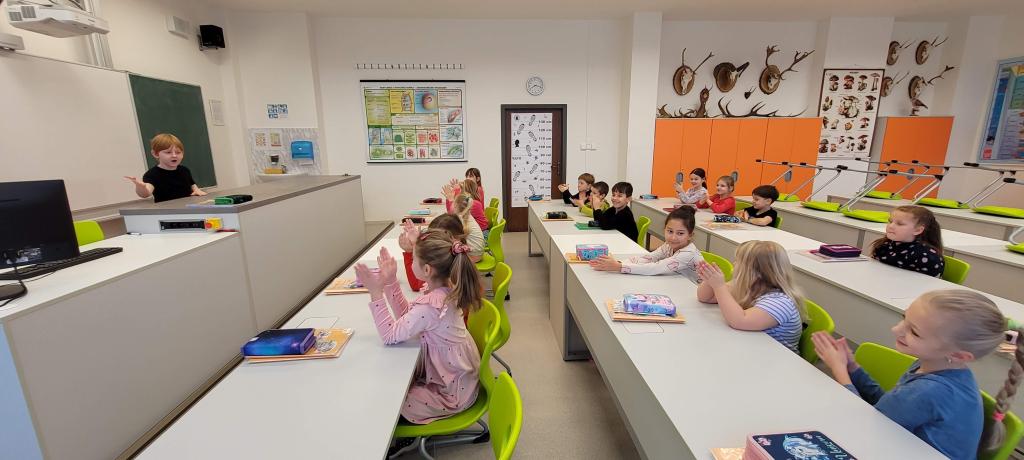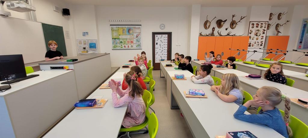 Žirafky už dva měsíce pravidelně poctivě čtou knížky podle svého výběru. Za 25 přečtení v měsíci si prvních deset čtenářů vybírá z karet aktivit. Tento měsíc si jednu kartu vybral i Ondra. Byla to karta Hodina na přání. Místo českého jazyka si přál jít do učebny přírodopisu a vyprávět nám o hmyzu. Nejprve si spolužáky vyzkoušel, co patří do hmyzu a pak už se děti chopily připravených lup začaly zkoumat zblízka i z dálky různé hmyzáky. V odborné učebně máme ve sbírce veliké množství nejen hmyzu, děti tak mohly vidět vývoj motýla od vajíčka, spočítat mravenci všechny nohy, či zblízka prozkoumat kusadla včely. Bylo to opravdu zajímavé bádání. Hodina na přání měla úspěch.