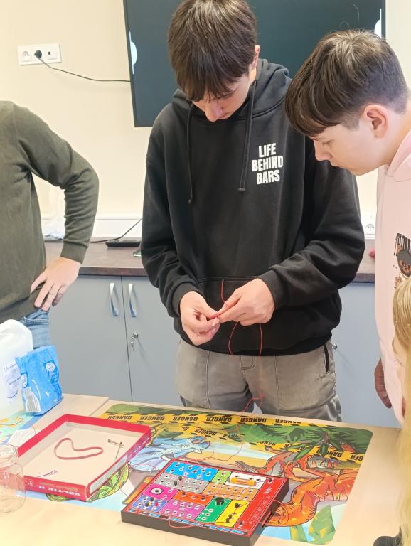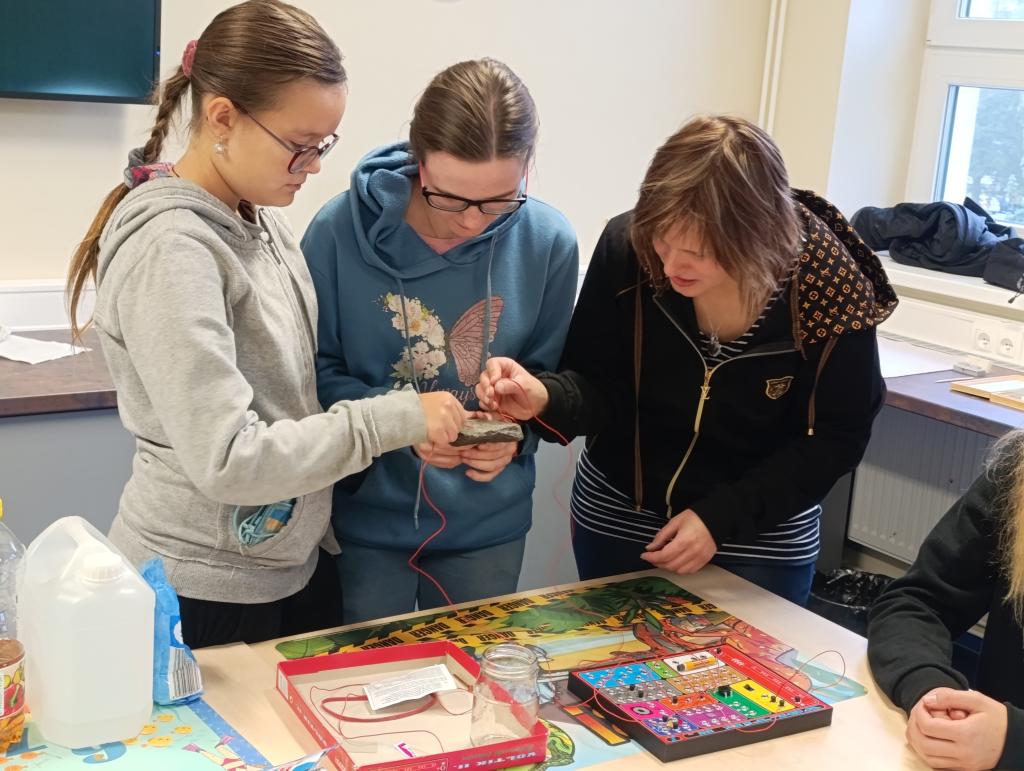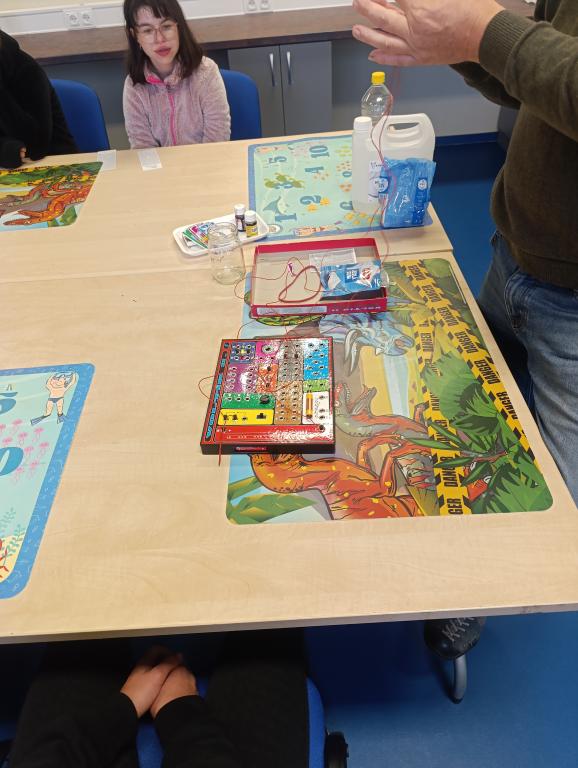V další částim přednášky se žáci věnovali elektrickým obvodům, kde zjišťovali, které materiály vedou elektrický proud a které ne. Také se dozvěděli, že voda je vodivá, ale destilované ne. Při pokusu s destilovanou vodou zkoušeli rozpustit sůl a cukr. Tímto pokusem si žáci vyzkoušeli, zda´obohacená směs je vodivá.