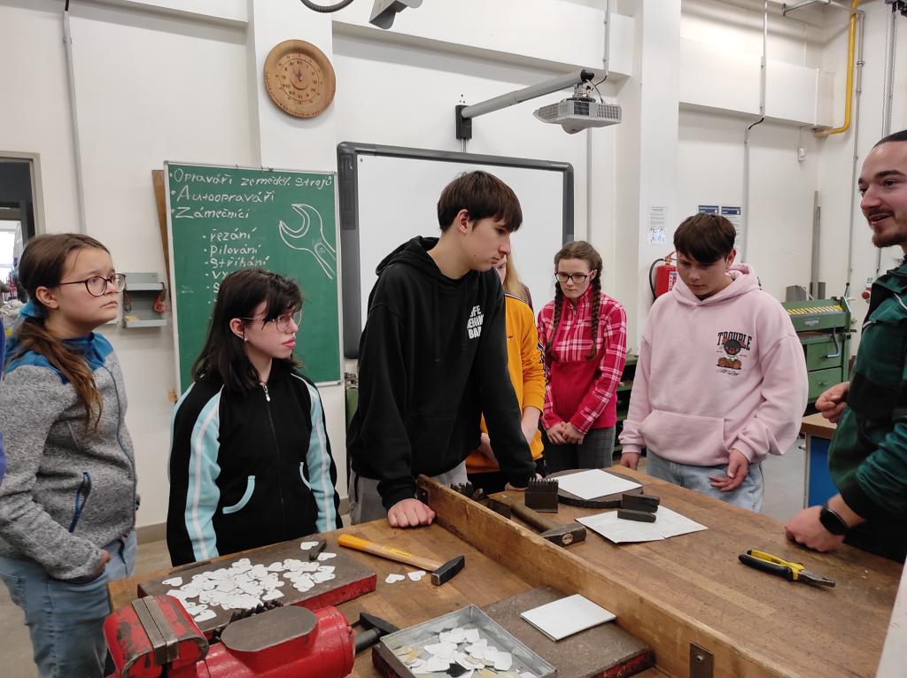 Dne 4. 11. se žáci ze ZŠ Poličská již po několikáté zúčastnili projektového dne v Odborném učilišti Chroustovice, kde si během dopoledne vyzkoušeli nejrůznější řemesla a obory, které škola nabízí. Celý den se nesl ve znamení tvořivosti a dobré nálady. První zastávkou byl obor módní dekoratér, kde si žáci vyrobili vlastního „dýňového skřítka“, zkusili si práci se šicím strojem a mohli si vyžehlit stuhu. U pečovatelů si měli možnost vyzkoušet přebalování figuríny miminka a zájemcům byl změřen krevní tlak – všichni tak nahlédli do péče o druhé z trochu jiného úhlu. Velký zájem vzbudila i návštěva truhlářů, zedníků a dřevařů. Zde si žáci vyzkoušeli práci se dřevem a stavbu chodníku z dlažebních kostek. Na památku si každý odnesl krásný dřevěný stojánek na mobil. Příjemná vůně nás poté zavedla ke kuchařům a cukrářům. Žáci si vyváleli a vytvarovali preclíky, ozdobili perníčky a jednohubky, které si následně s chutí snědli. Nechyběla ani návštěva chovatelů, kde na nás čekali tři krásní hnědouši. Další zastávkou byli aranžéři, kteří žákům umožnili vytvořit si květinovou dekoraci podle vlastní fantazie. Každý si svoji květinu mohl odnést domů. Den zakončila návštěva autoopravářů a zámečníků – zde si žáci vyzkoušeli opravu propíchnuté duše, výměnu kol u auta a do kovového srdce si vyťukali své monogramy. Celým programem nás provázely zábavné soutěže. Po dni plném aktivit jsme se vraceli příjemně unavení, ale bohatší o nové zážitky, vědomosti i dovednosti – a také s plnými taškami vlastních výrobků.