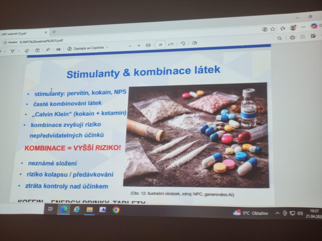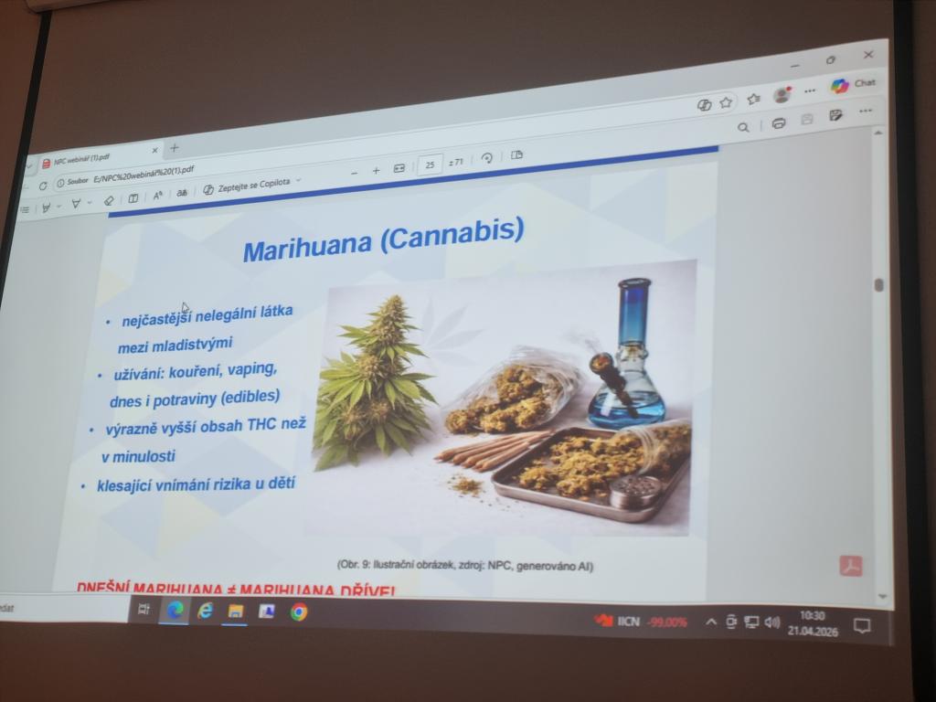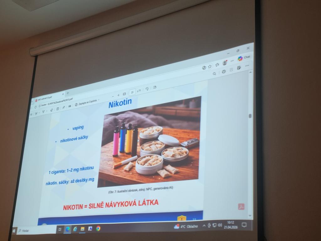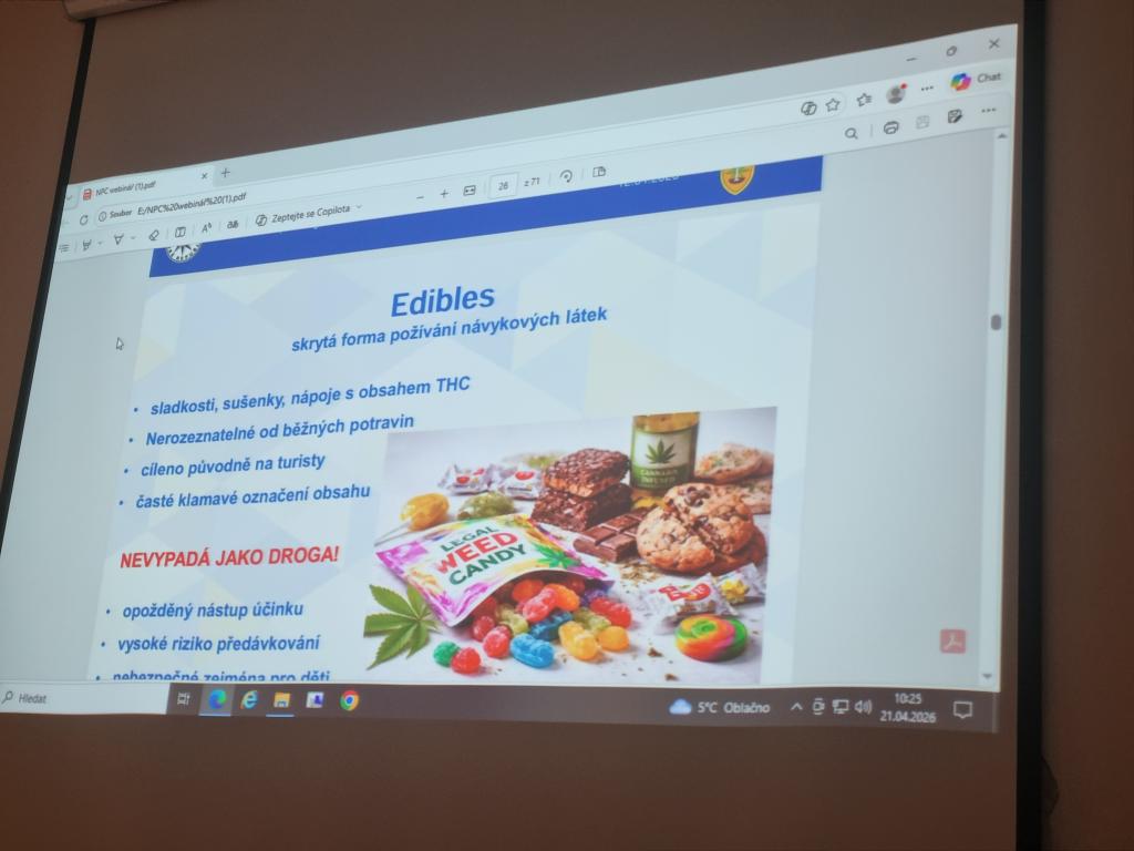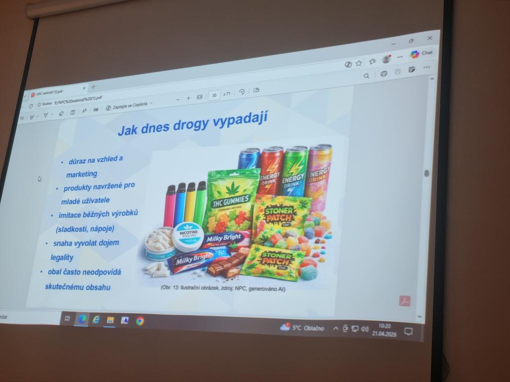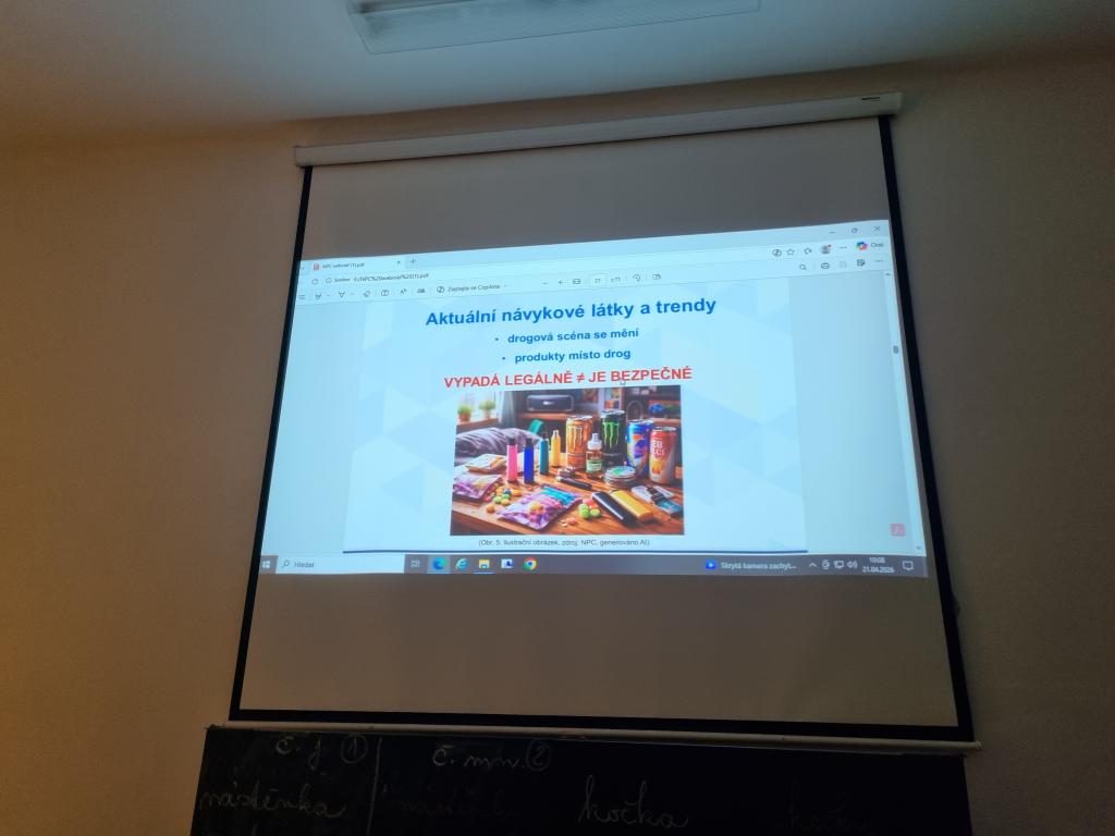 V úterý 21. dubna proběhla na naší škole přednáška o drogách a závislostech. Přednášku s prezentací si připravil pan učitel Rakouš, ukázal žákům na konkrétních příkladech návykové látky, se kterými se mohou v současnosti setkat, i jakým způsobem ohrožují jejich zdraví. Představil žákům i rozdíl mezi přestupkem a trestným činem např. při pěstování konopí. V dnešní době se návykové látky skrývají v na první pohled, běžných pochutinách, kouření cigaret vystřídaly nikotinové sáčky apod.. Žáci si tak odnesli z přednášky nové informace, které jim snad budou i nápomocny v předcházení závislostem.