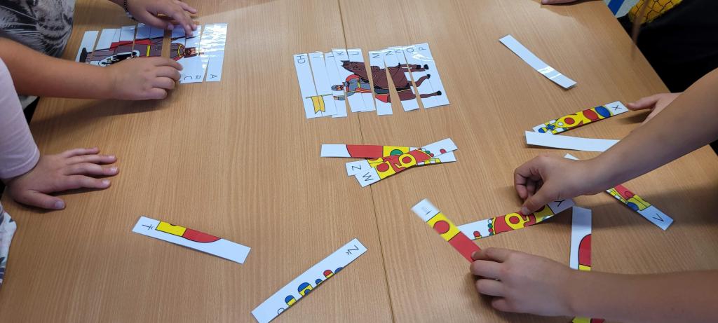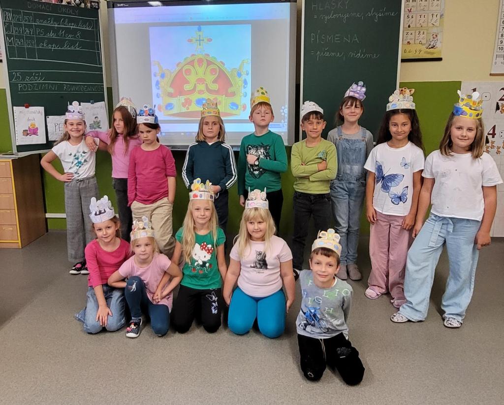 Při hodině českého jazyka jsme se rozdělili do čtyř skupin. Každá skupina dostala obálku s obrázkem rozstříhaným na proužky. Na každém proužku bylo jedno písmeno a děti měly za úkol seřadit písmena správně podle abecedy. Když se jim to podařilo, na složeném obrázku se objevil svatý Václav s kopím a štítem, svatý Václav na koni, jednoduchá královská koruna a nakonec ta nejvzácnější – svatováclavská koruna, česká královská koruna nejstarší a nejvýznamnější součást českých korunovačních klenotů, kterou nechat zhotovit Karel IV.