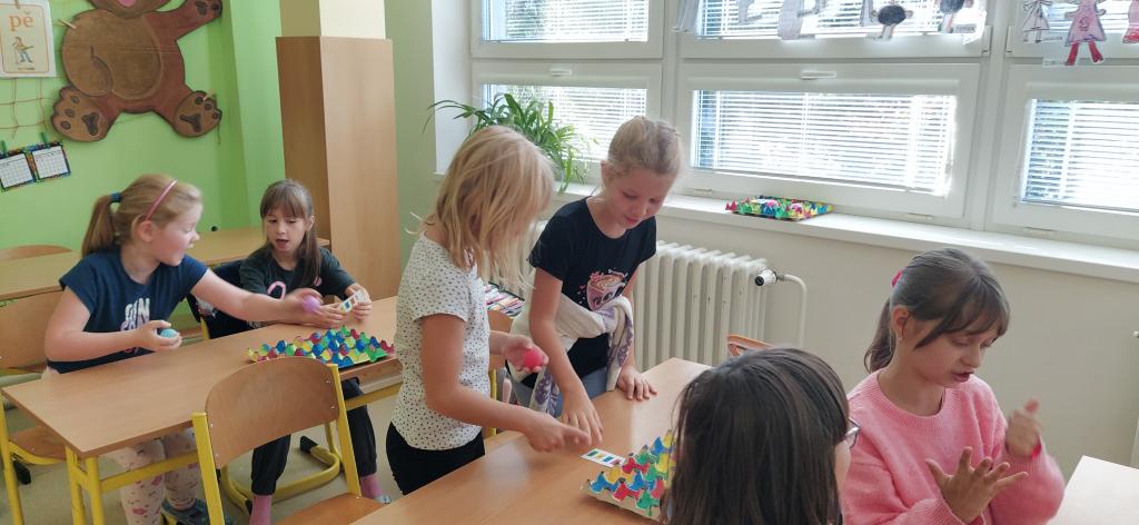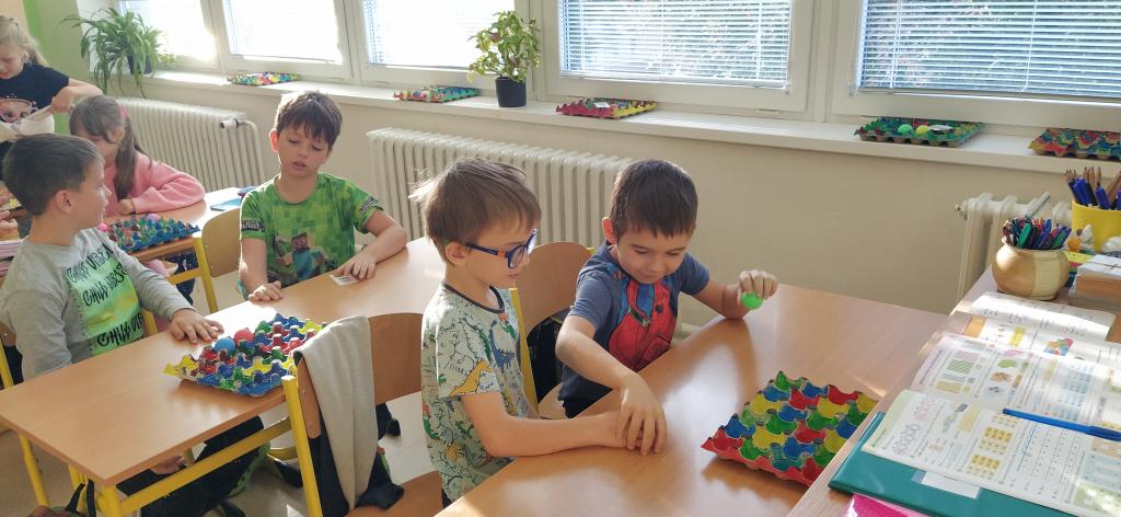 K výrobě děti potřebovaly velké plato od vajíček, barevnou bodovou osnovu, temperové barvy a dva barevně odlišené pingpongové míčky. Pak už stačilo jen dostatek trpělivosti – nejprve s rozmisťováním barev podle společně vytvořené bodové osnovy, a poté s pečlivým vybarvováním jednotlivých políček.