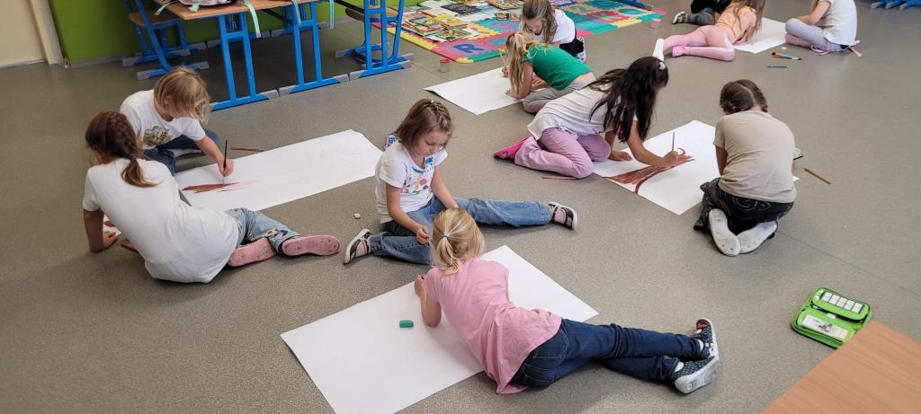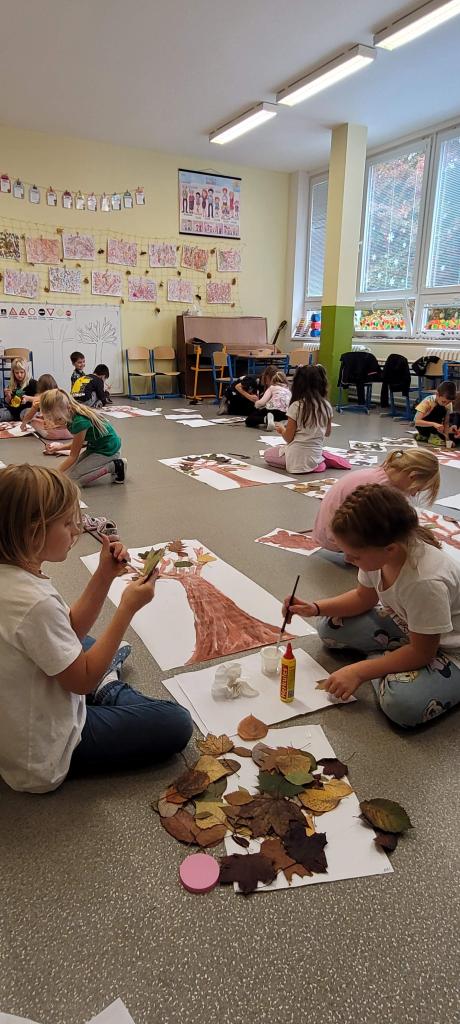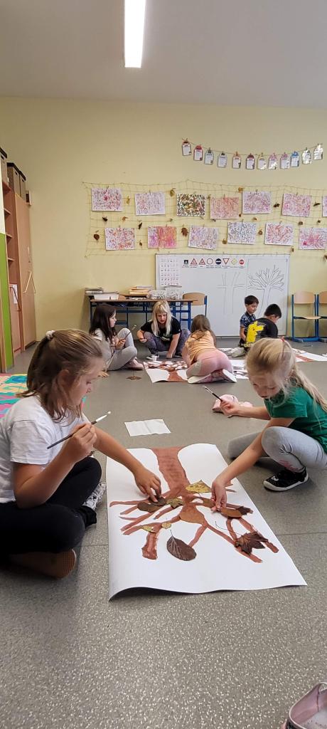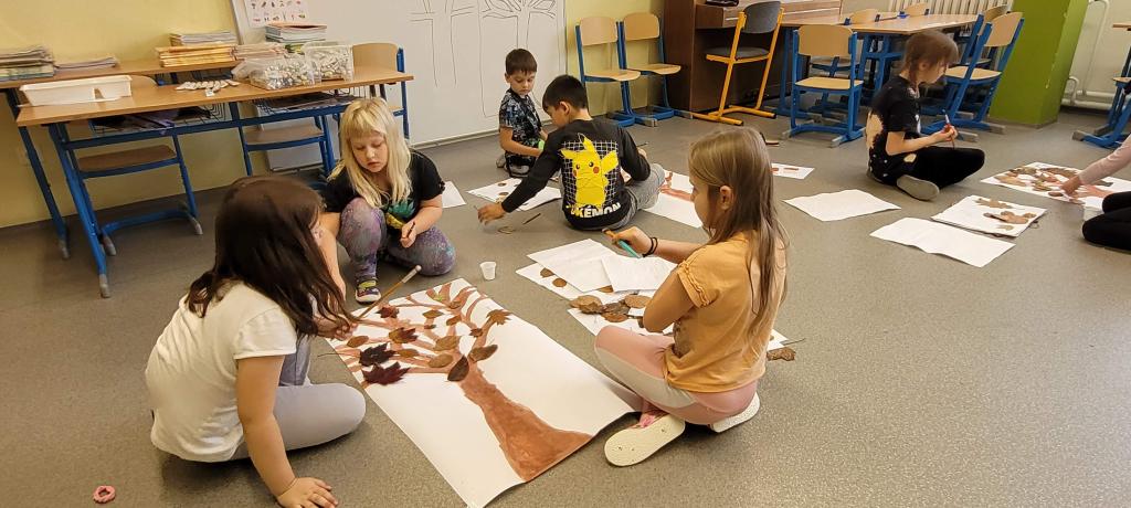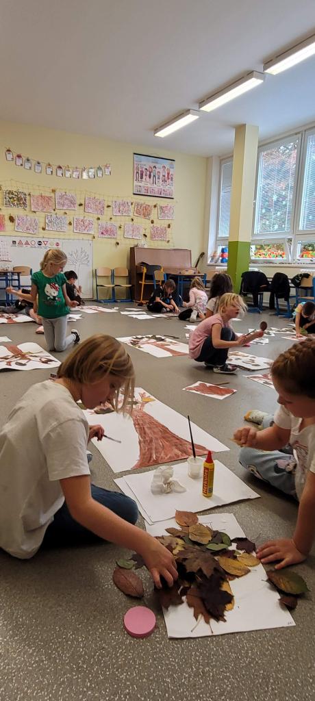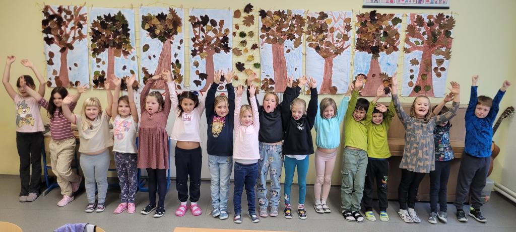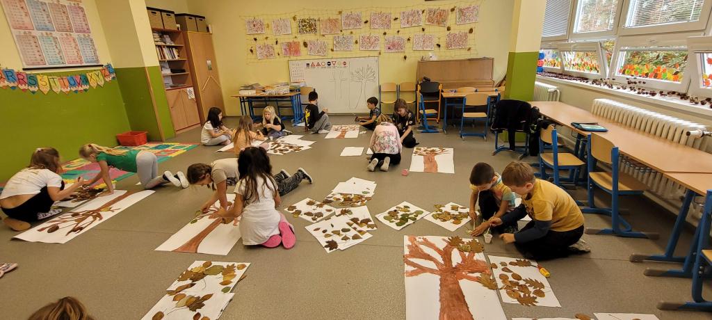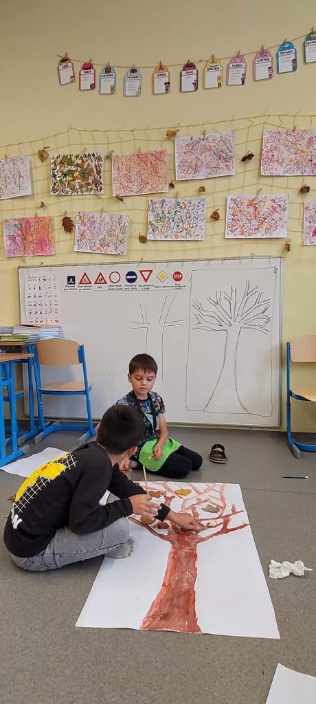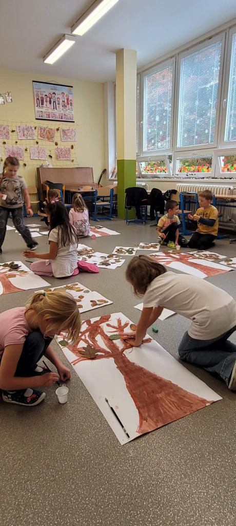 Podzim se k nám přišel s plnou kapsou barevných listů a my jsme je samozřejmě nenechali ležet jen tak v parku. Vyrazili jsme s druháky na „listovou výpravu“ do parku u školy a nasbírali poklady všech barev. Listy jsme pak týden lisovali pod tím, co máme ve škole nejspolehlivější, pod učebnicemi. Ve čtvrtek při výtvarce se děti rozdělily do dvojic, odklidily si lavice ke straně třídy a vytvořily si tak dostatečný prostor na svá umělecká díla. Kmeny a větve nám dali trošku zabrat, nemohli jsme pořád přijít na to, jak to udělat, aby to vypadalo jako větve a ne jako ruka s prsty. Pak už si vzaly do ruky štětce a začalo velké malování. Slovo dostaly temperky, míchaly se, dokud z toho nevznikla celá paleta hnědých odstínů potřebná na kmen. Musíme se přiznat, že občas bylo trochu hnědé nejen na podlaze, ale i na rukávech a kalhotách. Když byly stromy hotové, přišlo kouzlo – na větve jsme nalepili vylisované listy a modrými křídami jsme dotvořili oblohu. Naše třída se proměnila v opravdový podzimní park. Výsledná podzimní alej teď zdobí síť vzadu ve třídě a každý kdo k nám přijde, ji nemůže přehlédnout.