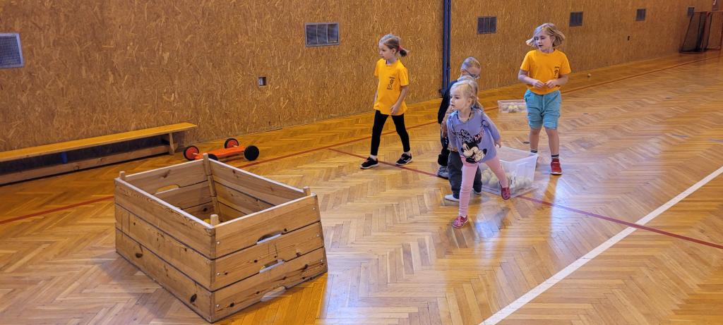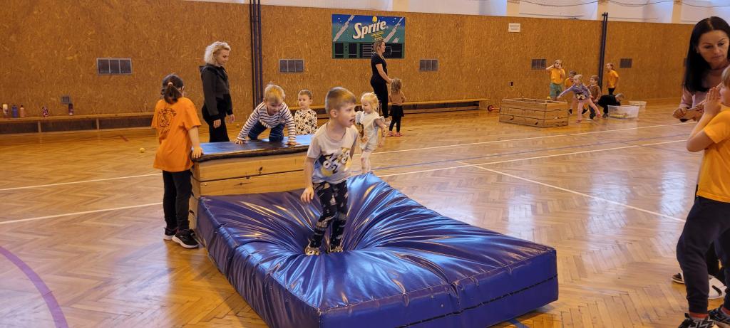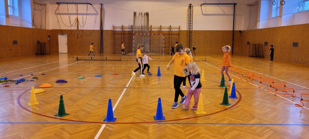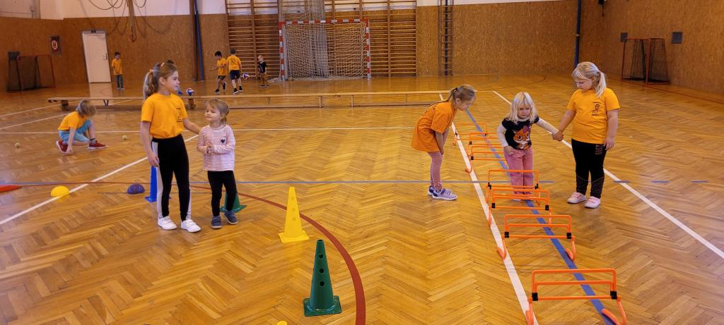 Do naší tělocvičny dorazila speciální návštěva, malí sportovci ze školky! Druháčci se proměnili v opravdové trenéry a s velkou zodpovědností a ještě větším nadšením si pro ně připravili pořádnou porci pohybu. Na stanovištích se děly věci. Houpání na kruzích jako v cirkuse, skoky ze švédské bedny jako odvážní akrobati, šplhání po žebřinách a skoky dolů jako horolezci, házení míčků do bedny, přeskakování překážek, slalom mezi kužely, kotouly na žíněnce, balancování po umělých kamenech, chození na chůdách a třeba i minifotbálek. Každý si mohl vybrat, co ho baví nejvíc. Někdo si zamiloval kruhy, jiný se zájmem trénoval neobvyklou chůzi na chůdách, a někteří prostě běhali od stanoviště ke stanovišti, aby stihli všechno. A když všichni odcházeli, bylo poznat, že si to pořádně užili nejen podle úsměvů, ale i podle unavených nožiček. Druháčci se o malé sportovce starali skvěle a zaslouží velkou pochvalu!