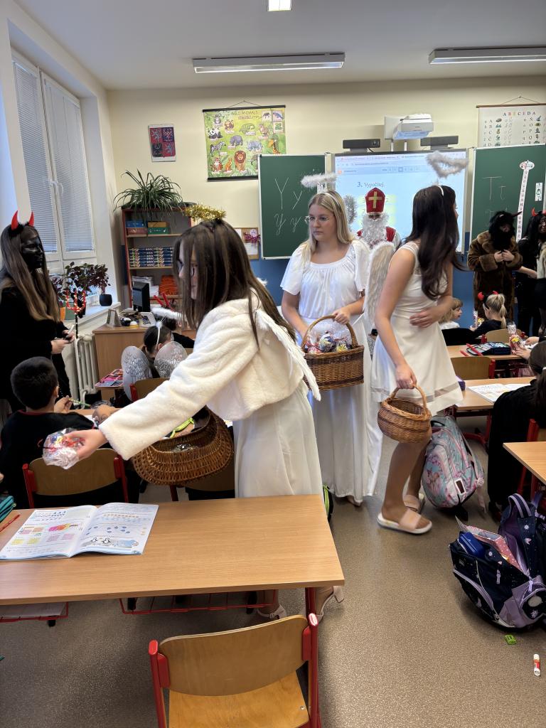 O velké zpestření se postarali žáci devátých tříd, kteří k nám přišli převlečení za opravdové čerty, anděly a Mikuláše. Prvňáčci statečně přednesli básničku a ukázali, že si pochvaly od Mikuláše zaslouží. Za statečnost dostali i baliček plný dobrot.
