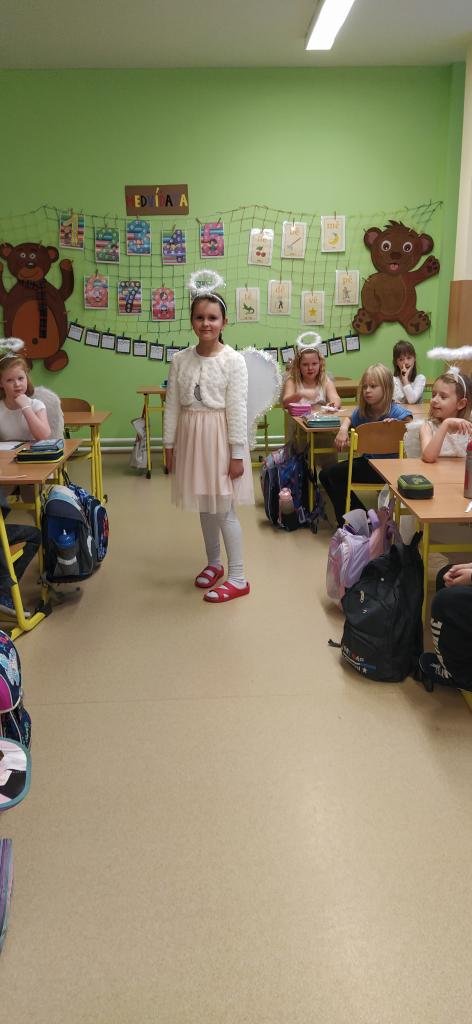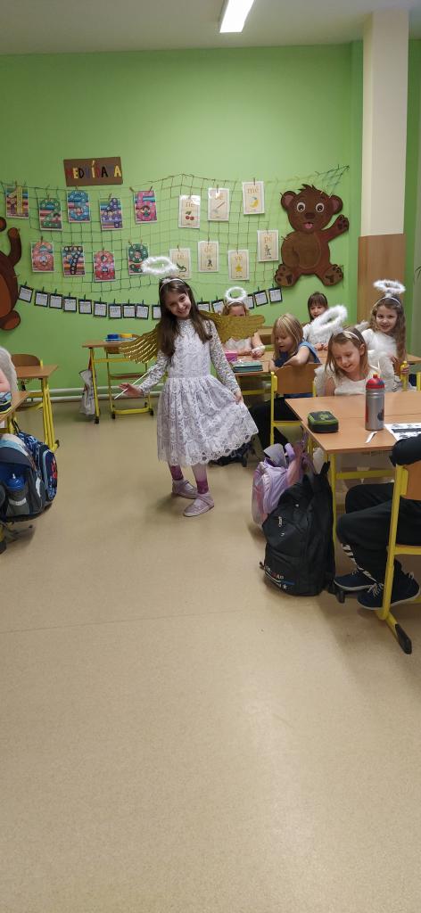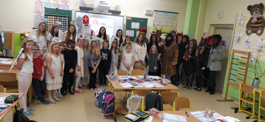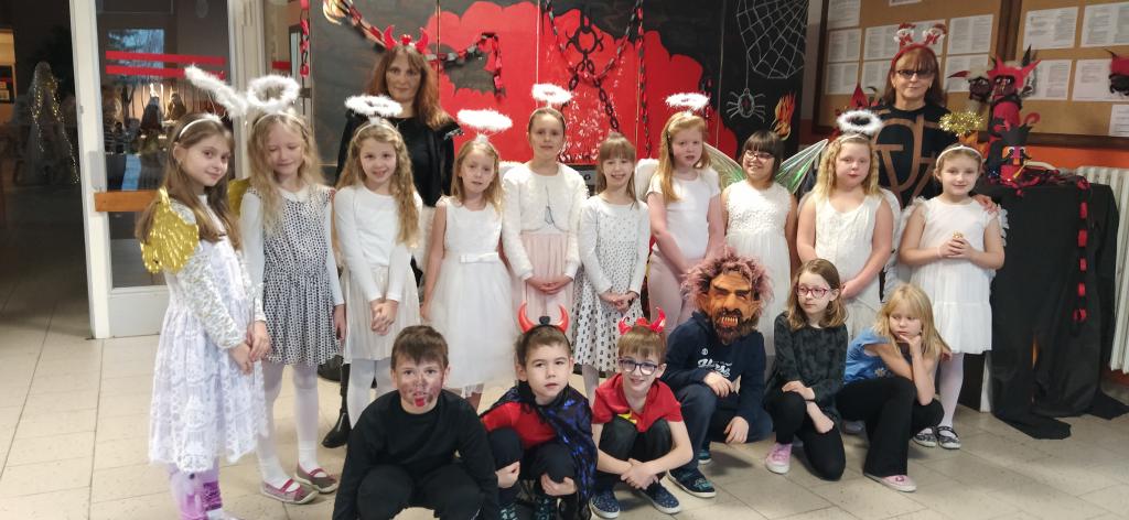 v andělsko-čertovskou školu. Děti plnily zábavné úkoly ve skupinách, zpívaly, recitovaly a těšily se na vzácnou návštěvu andělů, čertů a samozřejmě i samotného Mikuláše.