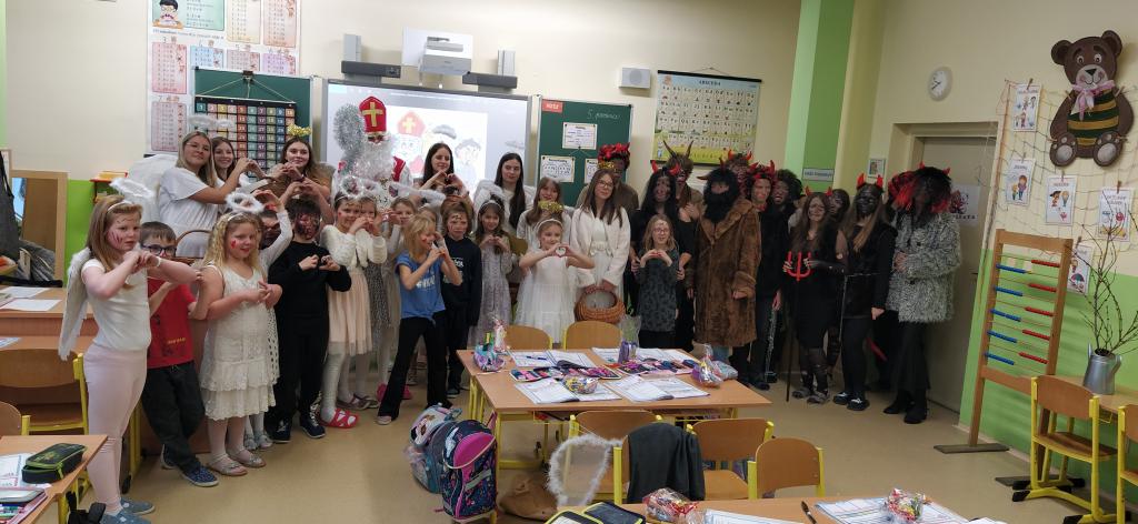 pro čerta“, kterou si dnes společně zazpívaly. V českém jazyce se zase věnovaly básničce „Mikuláš“, kterou se naučily zpaměti a s velkou radostí ji pak přednesly čertům, andělům i Mikulášovi. Ten je za jejich snahu odměnil pochvalou