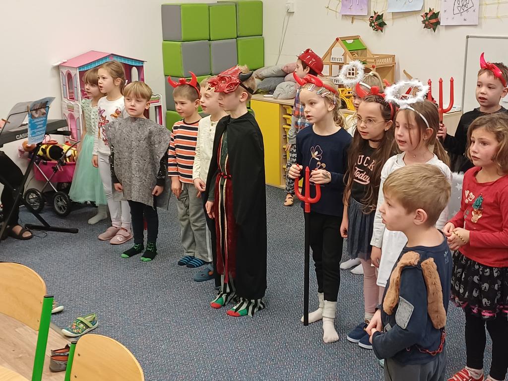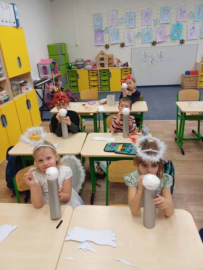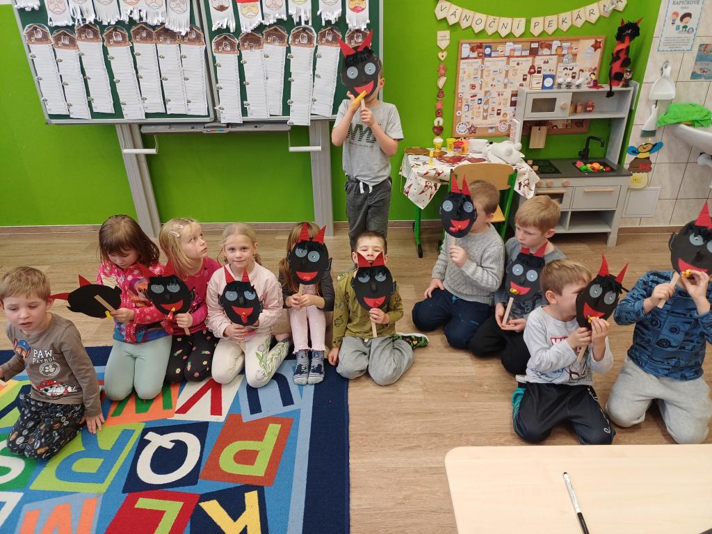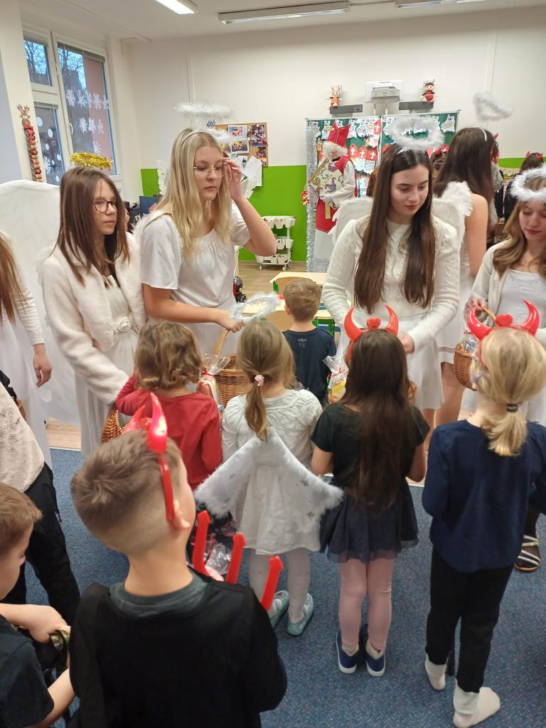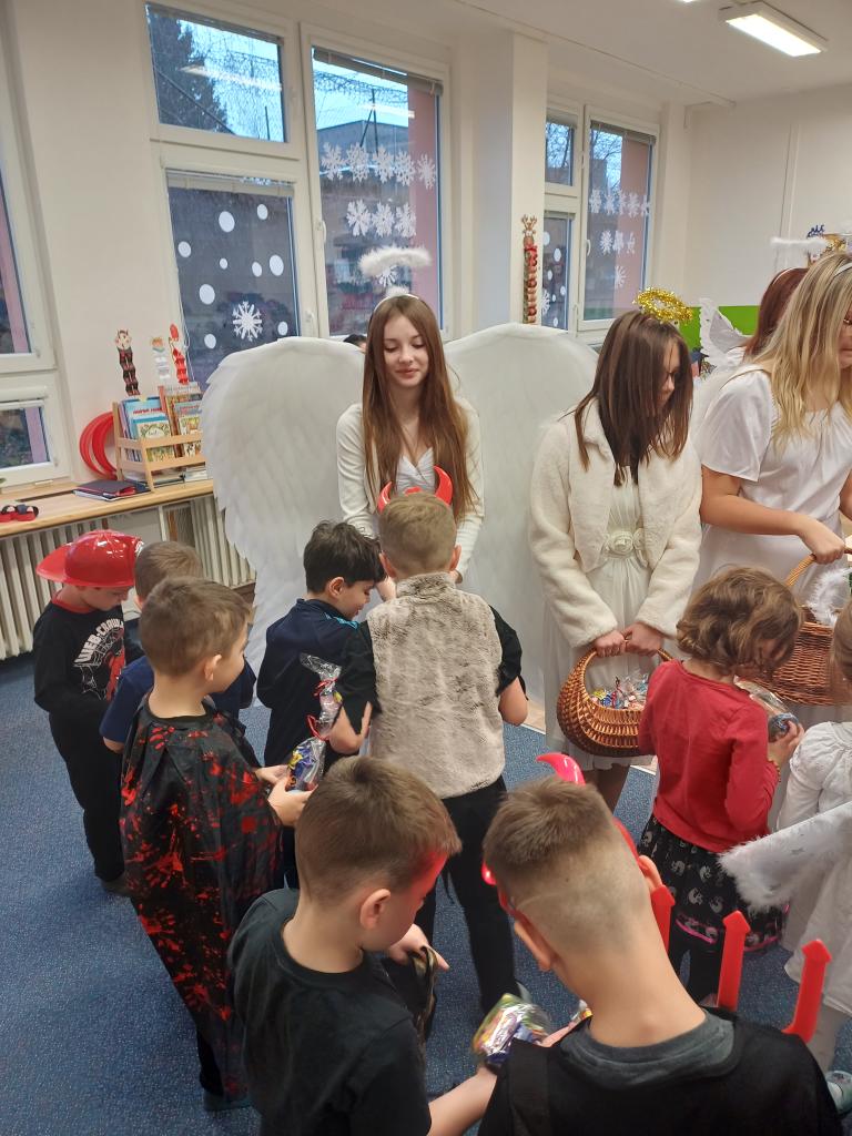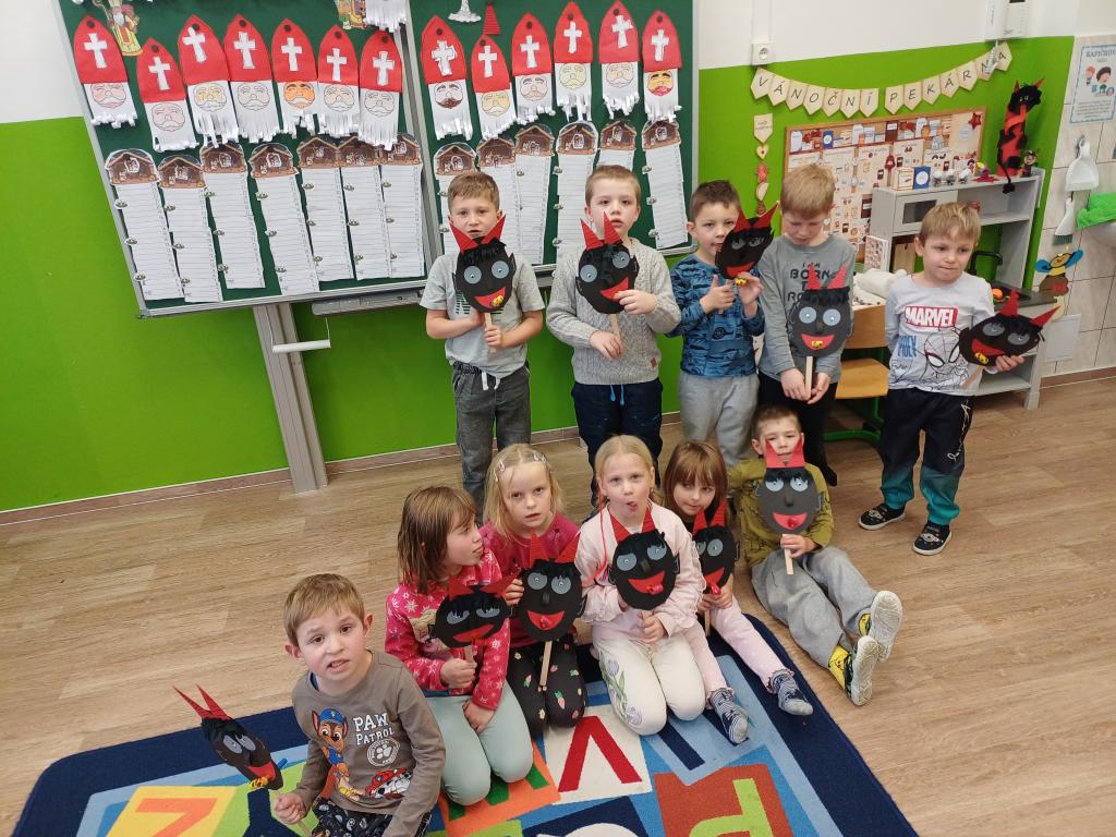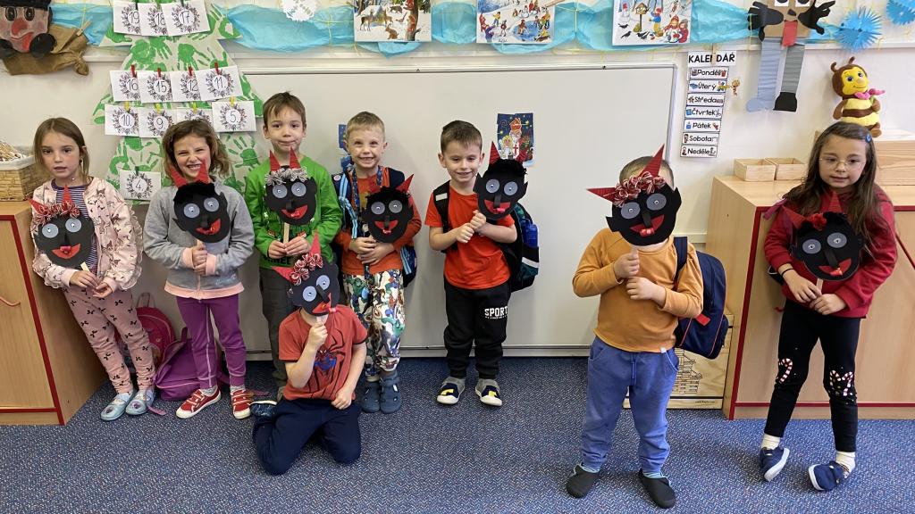 V uplynulém týdnu jsme si v přípravné třídě užili opravdu pohádkovou atmosféru, která se nesla v duchu čertů, andělů a Mikulášů. Celé naše čertovské řádění jsme zahájili návštěvou v Mateřské škole Budovatelů, kam nás pozvaly paní učitelky Radka a Mirka. Děti zde čekalo velké překvapení – peklo ve sklepě, které si pro nás paní učitelky připravily. Uvnitř nás přivítal hodný čertík, jenž si s dětmi zahrál karty. Tímto bychom chtěli paní učitelkám za milé pozvání srdečně poděkovat. Na tuto návštěvu jsme ve třídě navázali pestrými aktivitami. Děti si zpívaly čertovsko-andělské písničky, výtvarně tvořily a plnily tematické úkoly, které rozvíjely jejich fantazii, jemnou motoriku. Velkým zážitkem bylo čertí dopoledne v tělocvičně, kde jsme připravili řadu zábavných sportovních her. Děti si vyzkoušely skákání v pytli, zdolávaly pekelnou překážkovou dráhu, sestavovaly velkou hlavu čerta a také soutěžily v oblíbené hře - hod bramborou do hrnce.