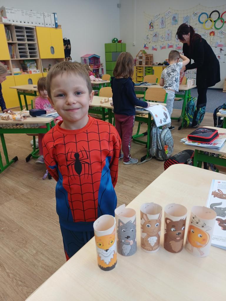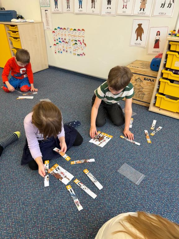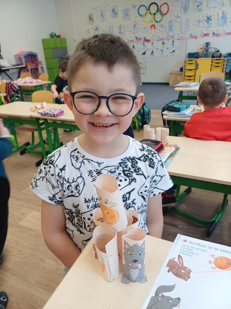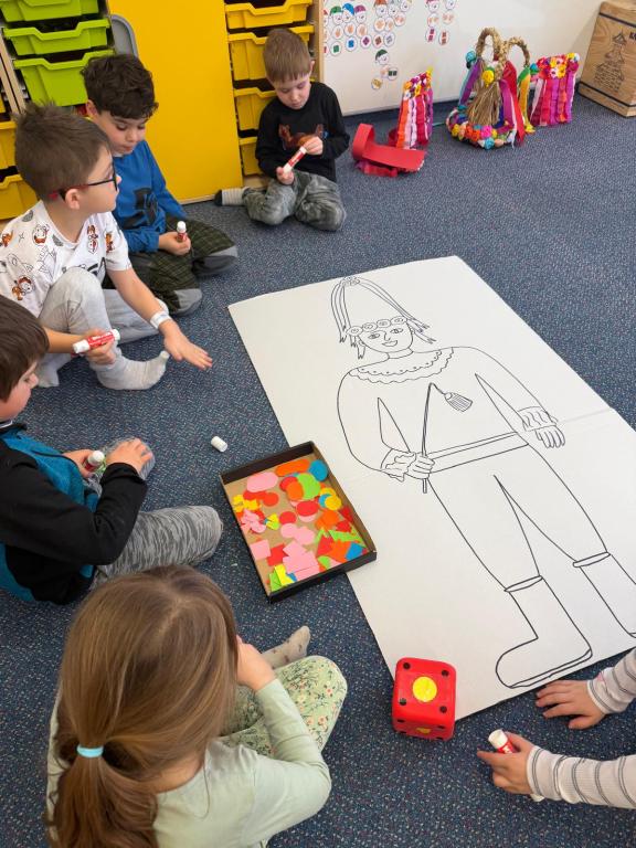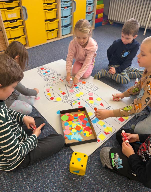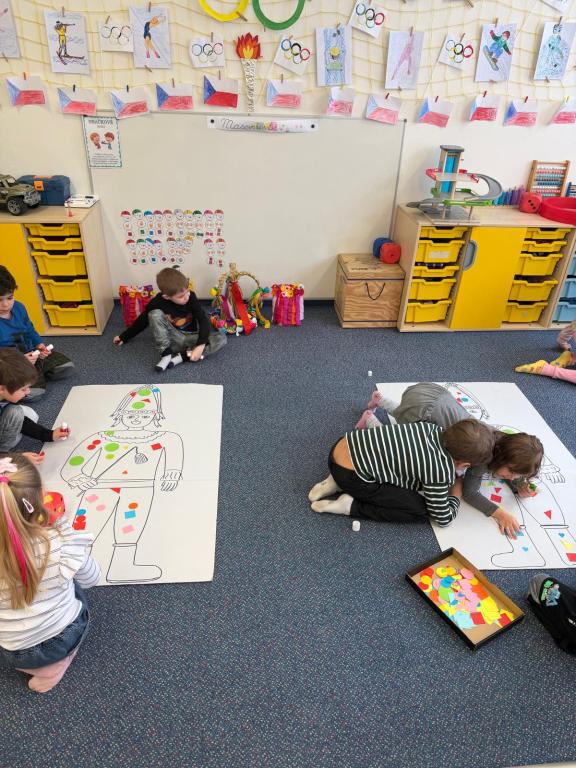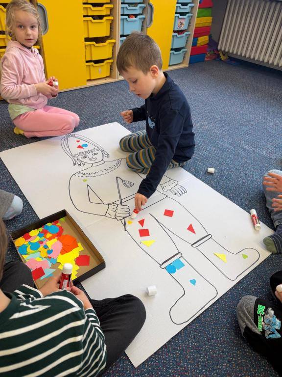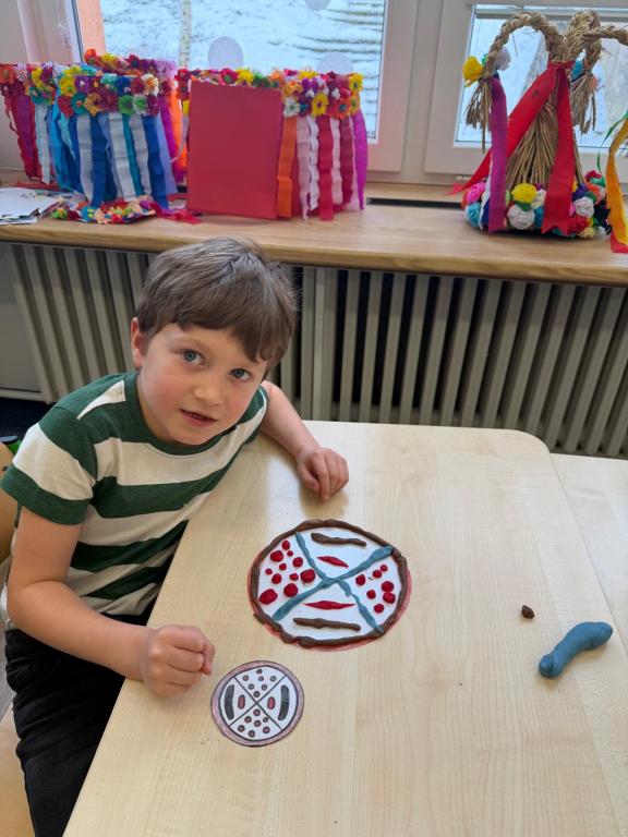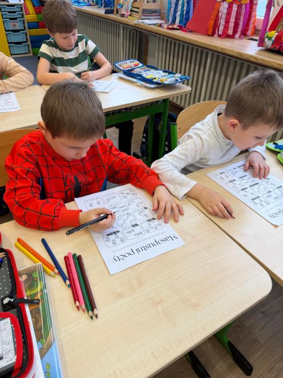 Program jsme zahájili pohádkou O koblížkovi, protože právě koblihy, koláče a další dobroty jsou neodmyslitelnou součástí masopustního období. Povídali jsme si o tom, proč se masopust slaví a jaké zvyky k němu patří. Děti si poté vyrobily barevné čepice, jaké nosí Laufr, a naučily se také jeho veselý taneček. Nechybělo ani tvoření z modelíny – modelovali jsme koláče a společně je počítali. Při této aktivitě jsme si procvičili nejen jemnou motoriku, ale i předmatematické dovednosti.Společně jsme si představili jednotlivé masopustní postavy, které si děti vybarvily podle vlastní fantazie. Na závěr jsme procvičili geometrické tvary, kterými jsme ozdobili postavu Laufra.