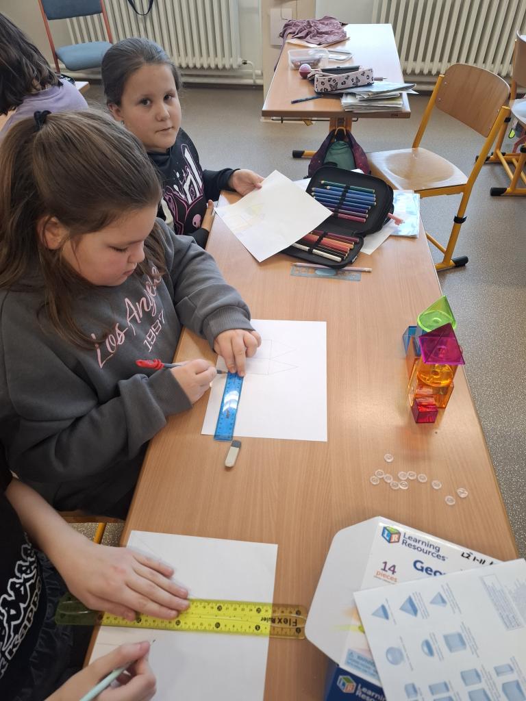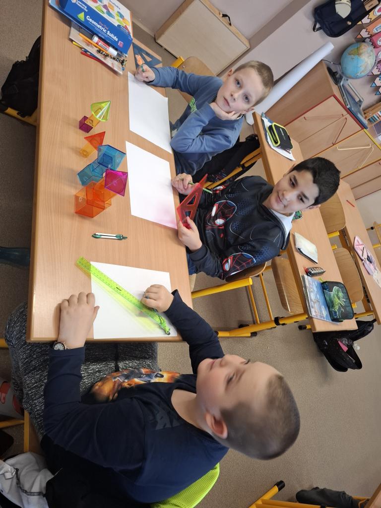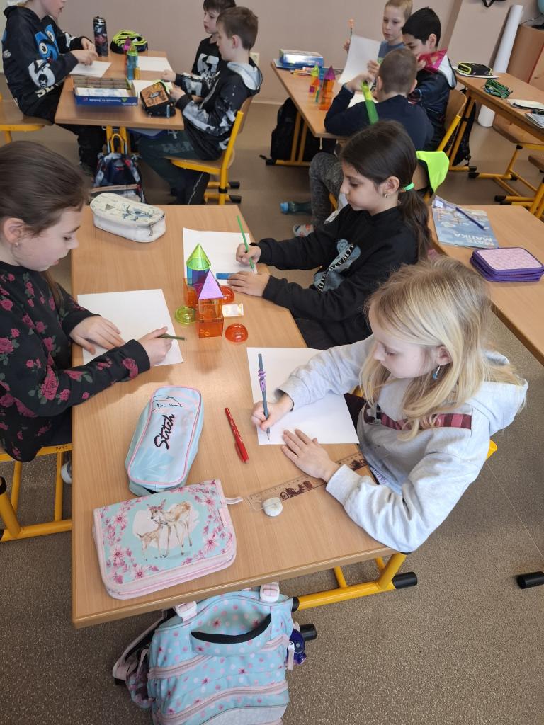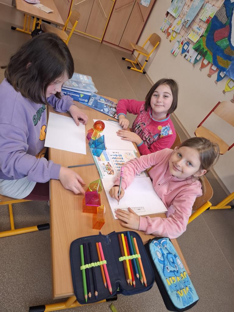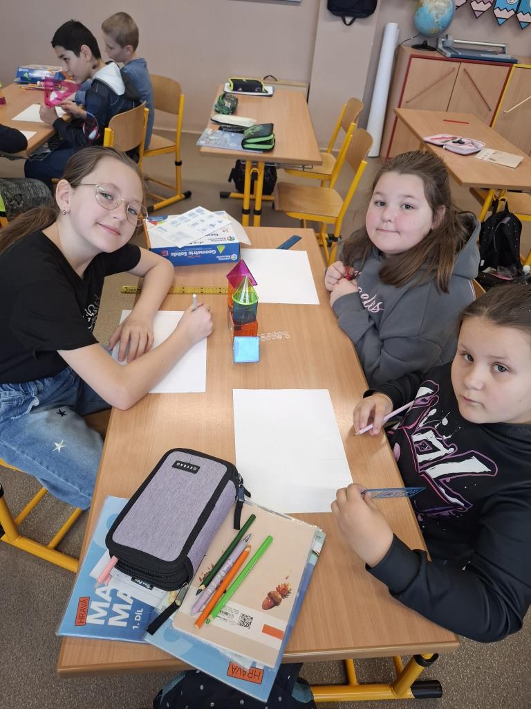 Dále se Mravenečci v hodinách matematiky věnovali stavbám. Z různých geometrických těles stavěli