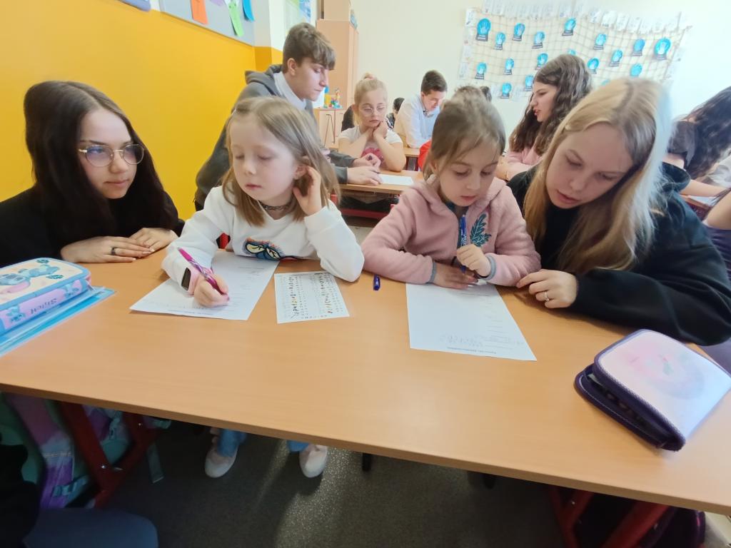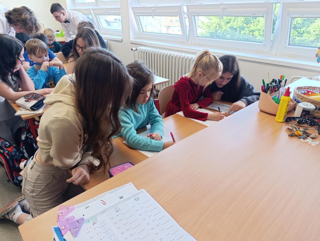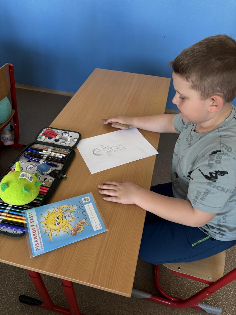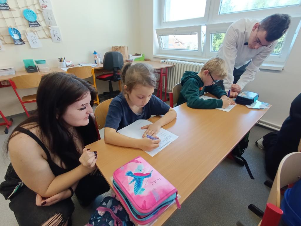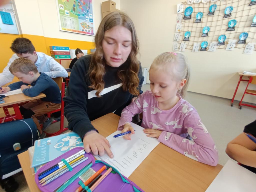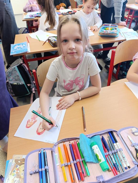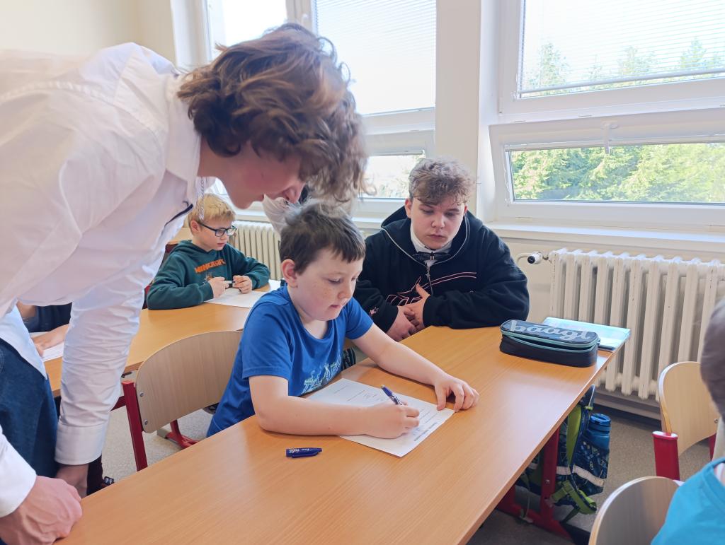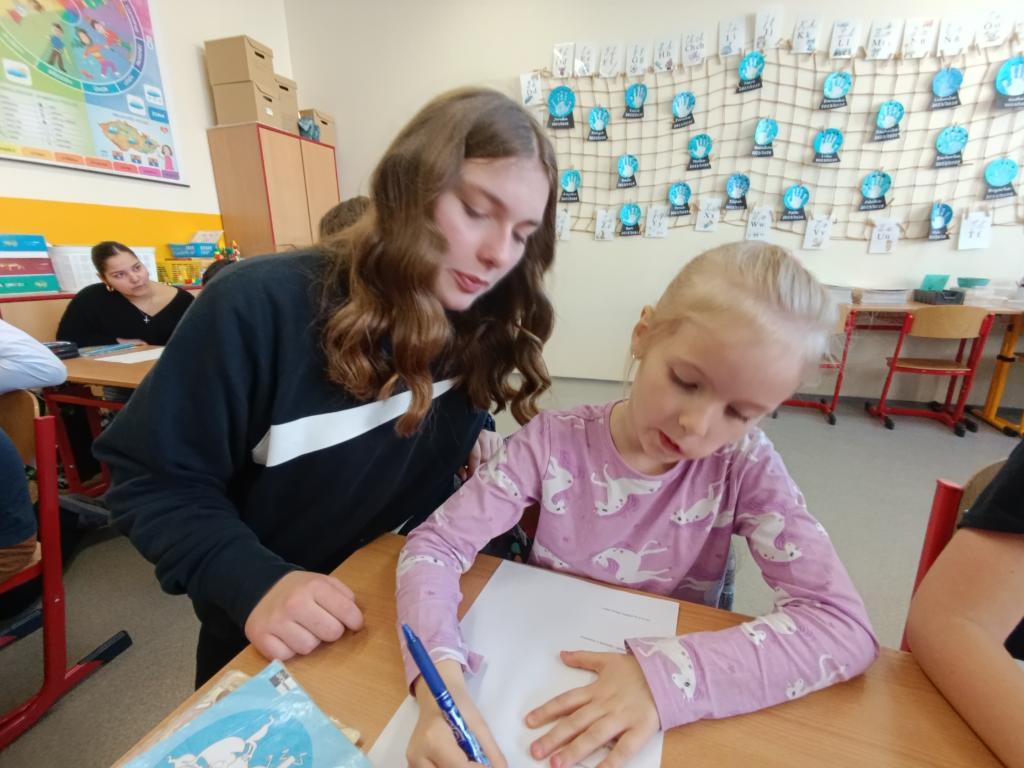 Po čtení následovala výtvarná aktivita, při které prvňáčci malovali Karkulku podle své fantazie. Vznikla spousta krásných a originálních obrázků, které ukázaly, jak děti příběh vnímají. Deváťáci jim při malování pomáhali a společně si užili i tuto tvořivou část programu.
