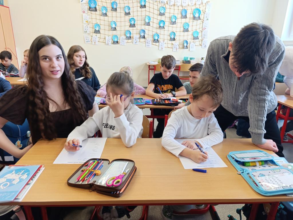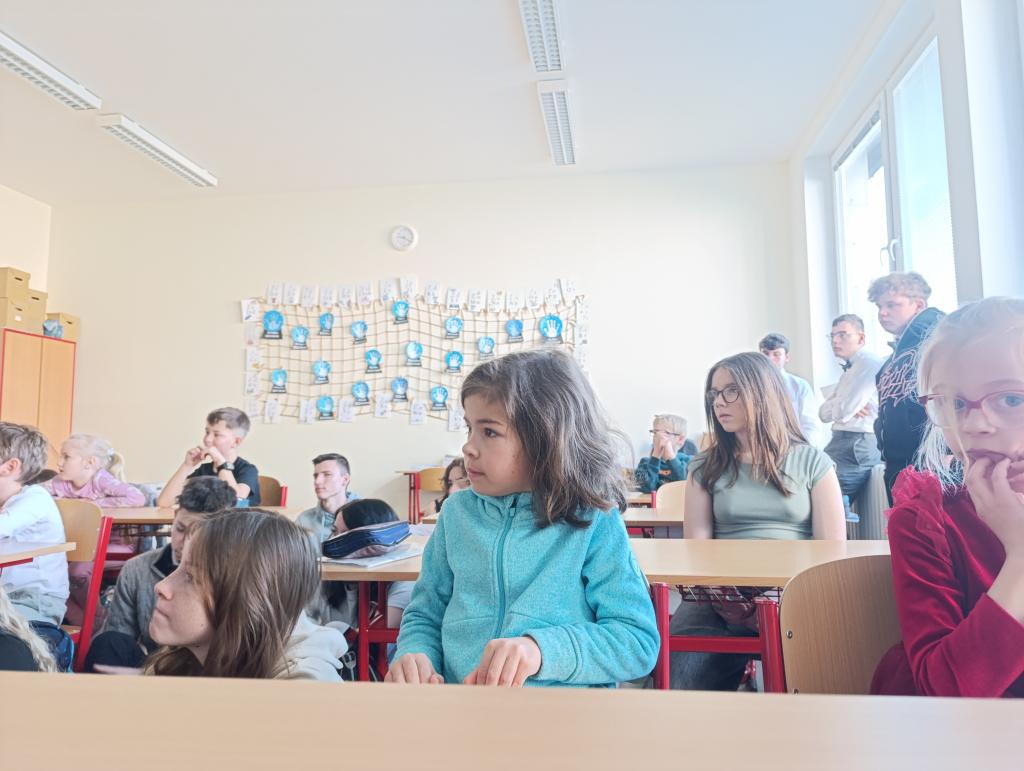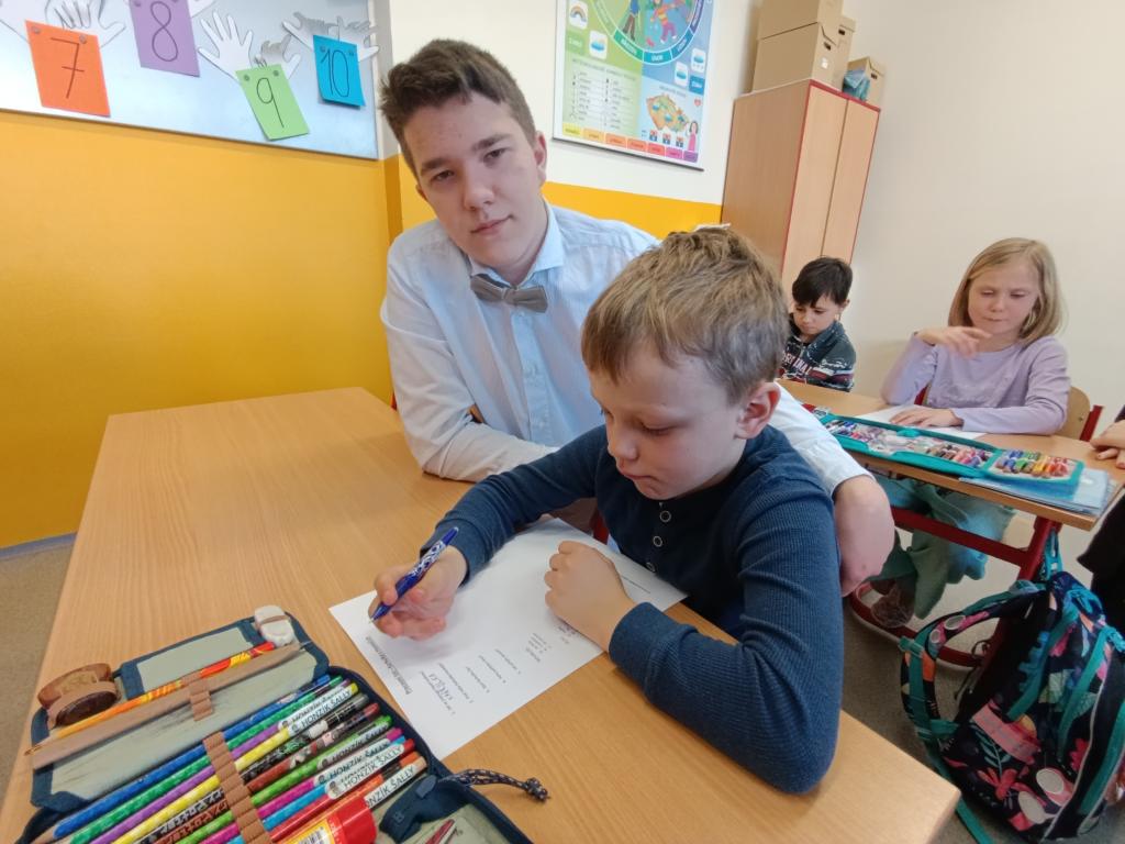 Součástí programu bylo také poslechové čtení v podání známého herce a vypravěče Miroslava Donutila, jehož nahrávka děti velmi pobavila. Prvňáčci se zaujetím poslouchali a deváťáci jim pomáhali lépe porozumět příběhu.