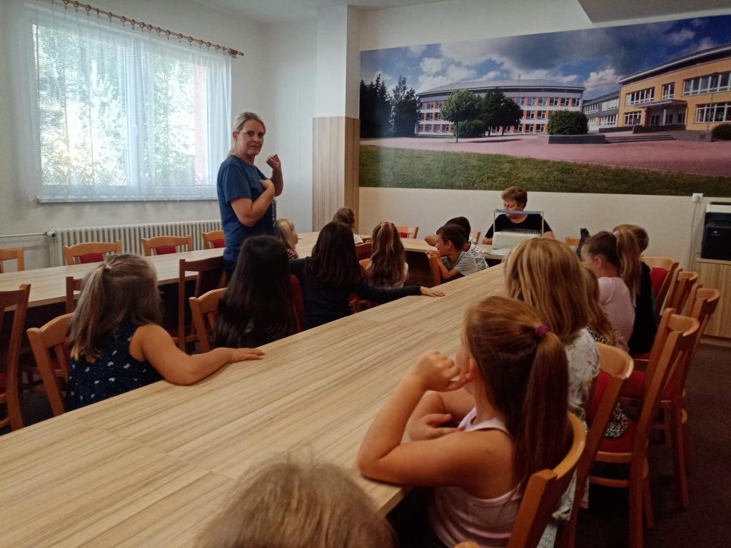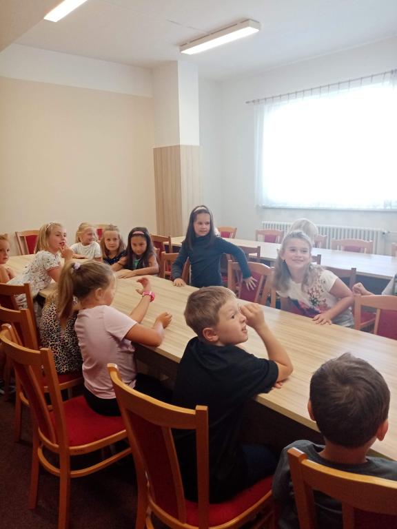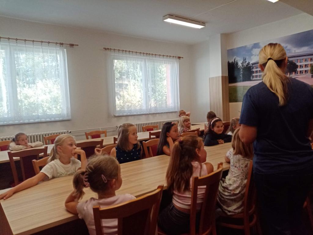 Prázdniny utekly a my jsme opět v lavicích. V prvním týdnu jsme zavzpomínali na různé zážitky z prázdnin, povyprávěli o táborech, dovolených a někdo i o svých letních úrazech, zahráli jsme si hry. Do naší žirafí party jsme přijali 2 nové spolužačky. A aby se nové spolužačky ve škole vyznaly, ukázaly jsme jim šatny, tělocvičnu a taky kde je ředitelna a sborovna. Do sborovny děti nejprve jen nakoukly a protože tam nikdo nebyl, vyzkoušely si, jak se sedí paním učitelkám na poradách. Všechny samozřejmě zajímalo, na kterém místě sedí. A tak jsme měly najednou místo spolužáků p.uč. Burešovou, p. uč. Křikavovou, p. uč. Staňkovou apod. Děti to moc bavilo. :-) V hodinách prvouky nás čeká po průzkumu školy ještě průzkum jejího okolí a také dopravní značky. V ostatních předmětech také nezahálíme a procvičujeme všechno, co jsme se naučili v první třídě - čtení, psaní, počítání do 20. Přeji všem druháčkům, ať se jim daří stejně tak dobře jako v první třídě.