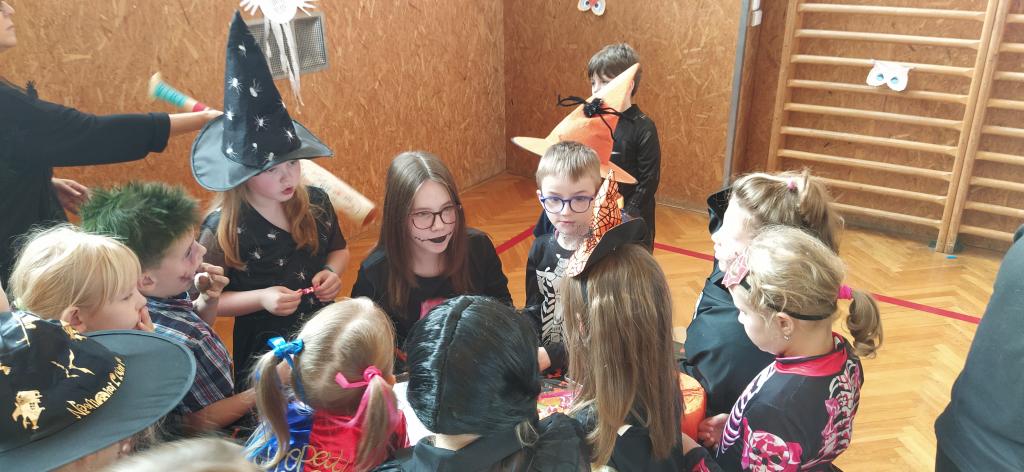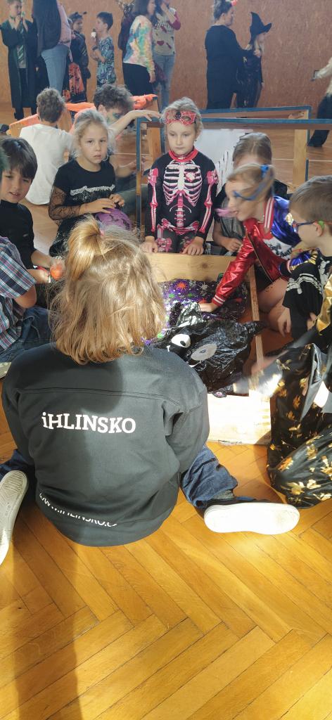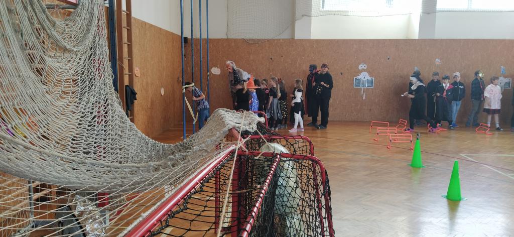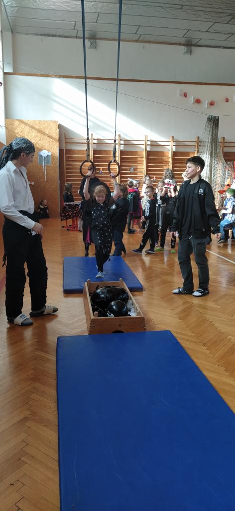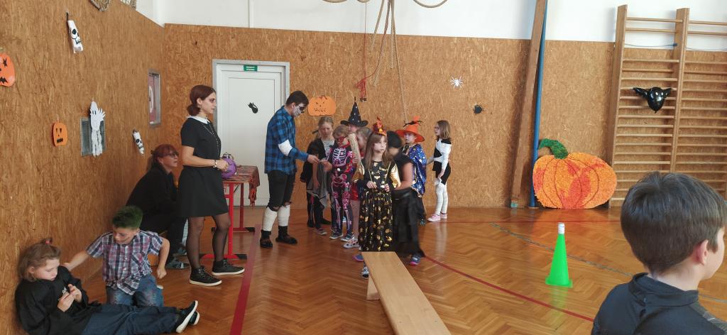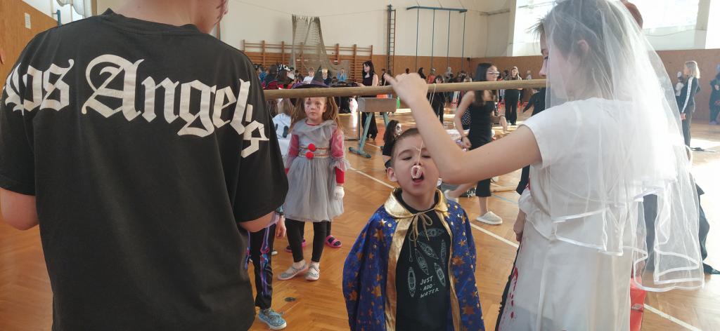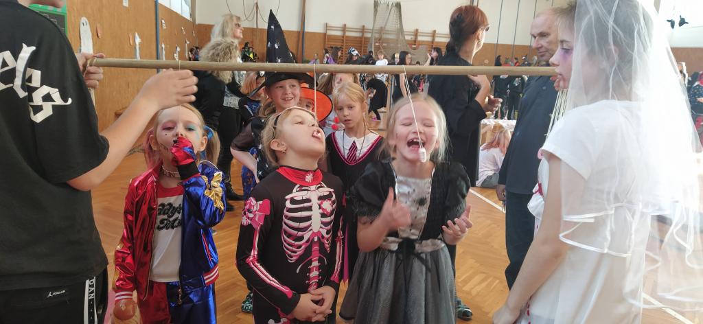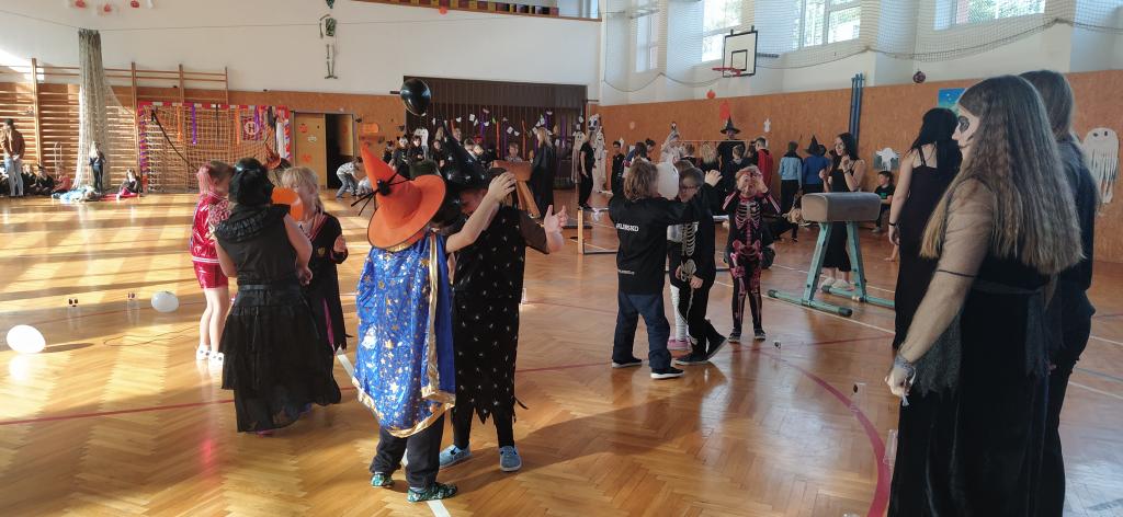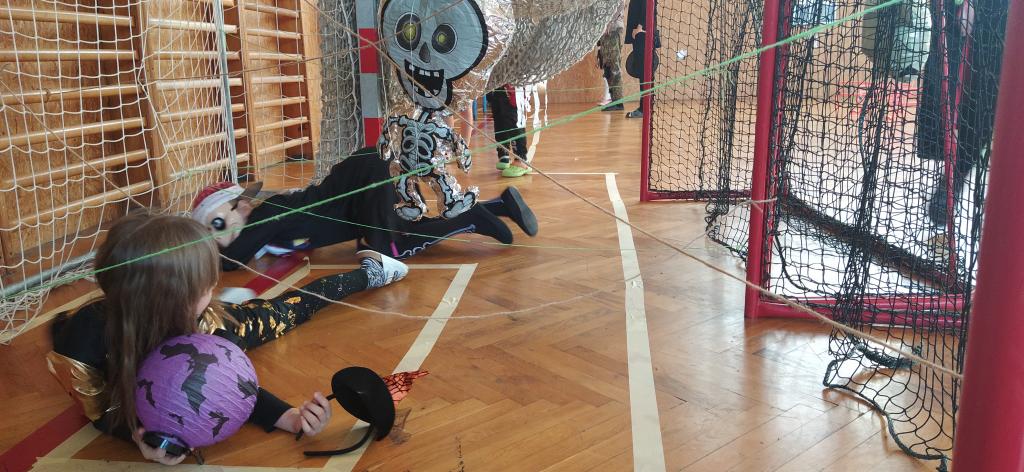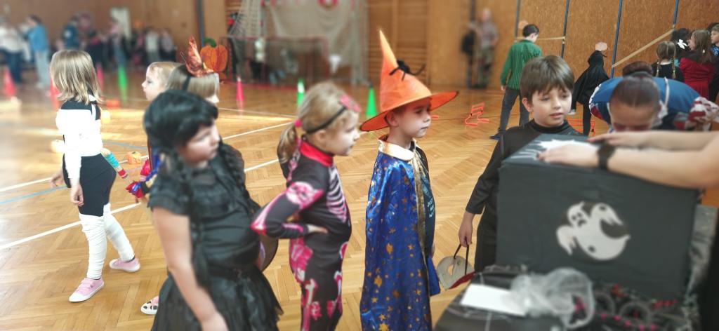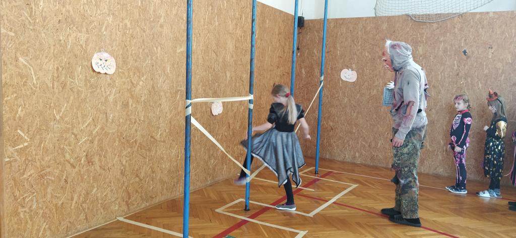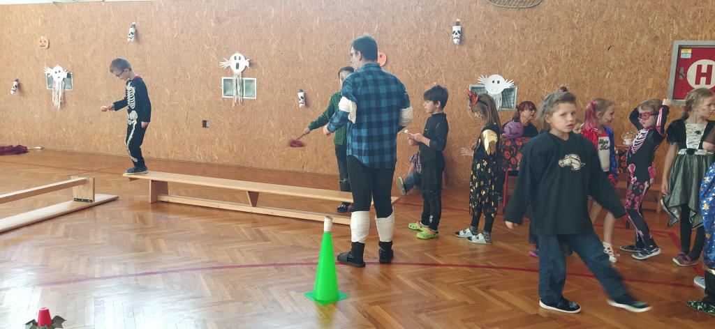 Po aktivitách ve třídě jsme se přesunuli do tělocvičny, kde na nás čekala spousta zábavných disciplín. Děti si vyzkoušely Závod s dýní, Pavučinový běh, Tanec duchů, Strašidelný slalom, Přeskoč pavoučky, ale také Halloweenský kvíz, Tajemnou krabici, Bonbón na provázku, Ochutnávací soutěž a Halloweenské bingo.