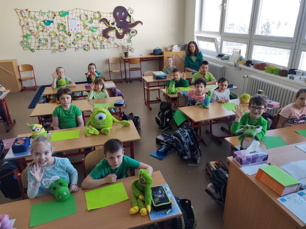 Děti přišly oblečené do různých odstínů zelené barvy a některé si dokonce přinesly i zelené svačinky, které nám zpestřily společné chvíle. Velkou radost nám udělali také jejich zelení plyšáci, kteří nás po celý týden doprovázeli při aktivitách ve třídě.