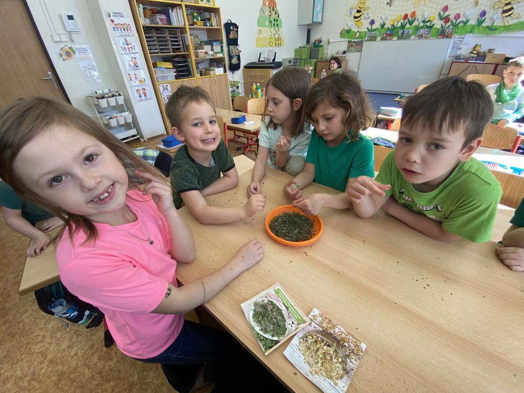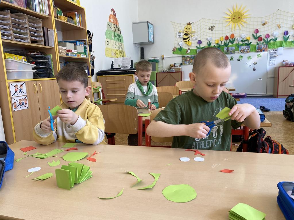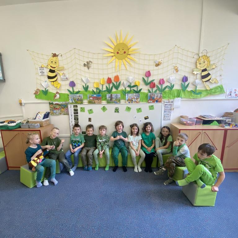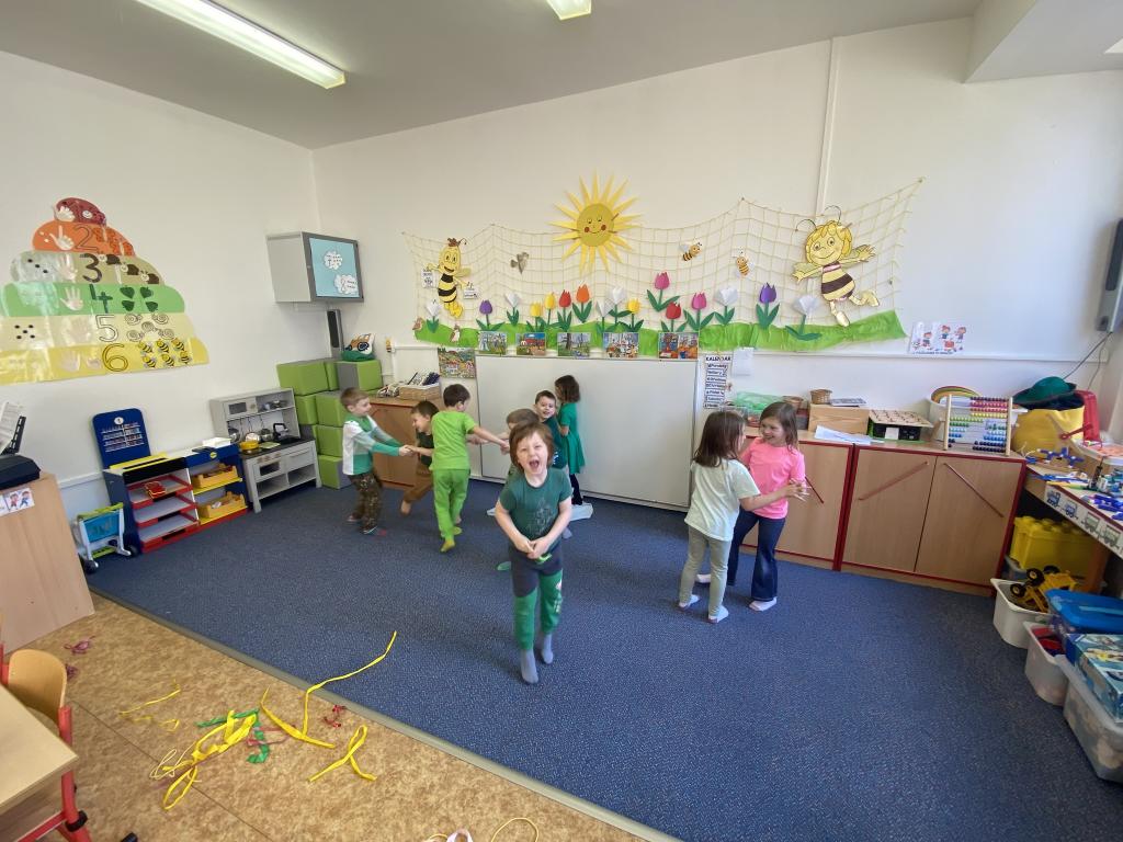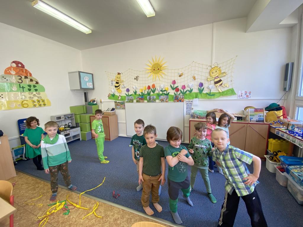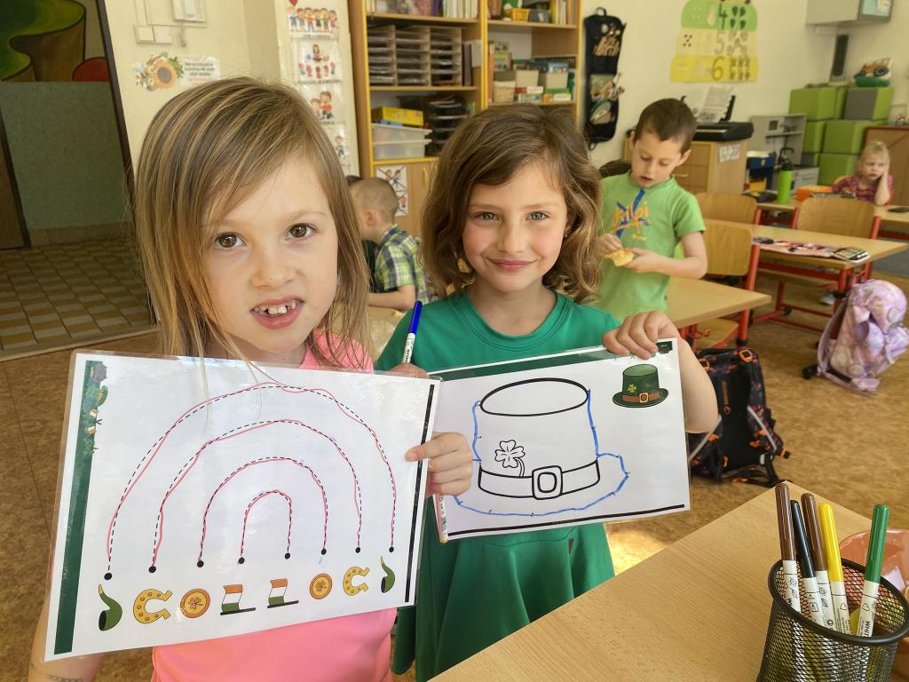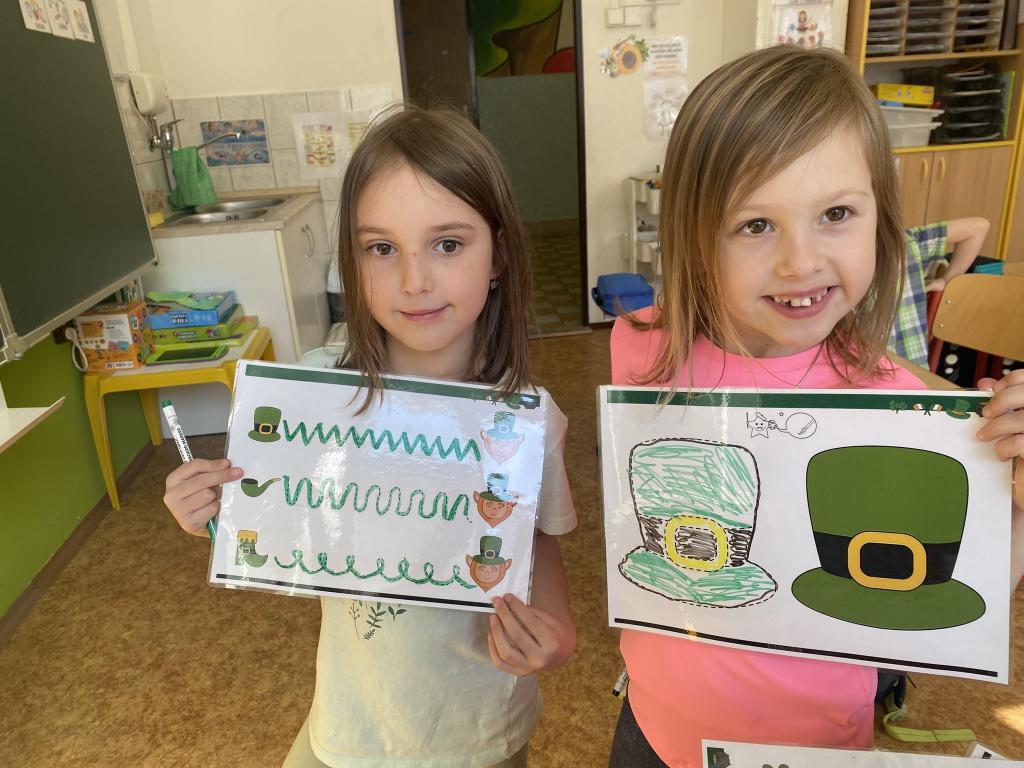 V pondělí 16. března odstartoval projektový týden, který rozzářil nejen naše přípravné třídy, ale i celou školu barvami jara. Objevování, dobrá nálada a společné aktivity nás těšily celý týden. Děti chodily v zeleném oblečení a přinesly dokonce i zelené svačiny, které jim moc chutnaly. Jako všechny učebny ve škole, tak i naše dostaly symbolický jarní klíč, který se objevil na dveřích naší třídy. Nebyl to obyčejný klíč — reagoval na splněné jarní výzvy. A že jich bylo! S dětmi jsme se starali o rostlinky – vyseté hrášky a fazolky. Děti měly radost, jak vše klíčí a roste. Po přesazení do hlíny si děti odnesly zelené květináčky domů. Na vatu jsme nechali také vyklíčit kadeřávek, čočku a mungo klíčky, na kterých jsme si s radostí po týdnu pěstování všichni pochutnali. Ve třídě jsme dělali další pestré aktivity spojené se zeleným týdnem – modelovali jarní obrázky, zpívali písničky o jaru, kreslili, vyráběli, četli příběhy a hráli si. Povídali jsme si o svátku svatého Patrika a plnili úkoly skřítka Leprikóna. Na památku jsme si namalovali kouzelné trojlístky, které nám budou připomínat důležité mezilidské hodnoty, jakými jsou láska, přátelství a pomoc druhým. Zelený týden jsme si všichni moc užili. Doufáme, že nám přinesl nejen radost, ale i zdraví a plno jarní energie!