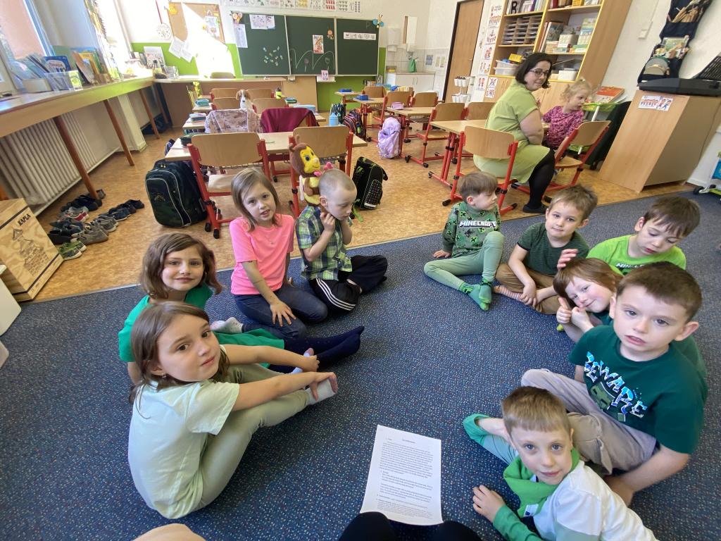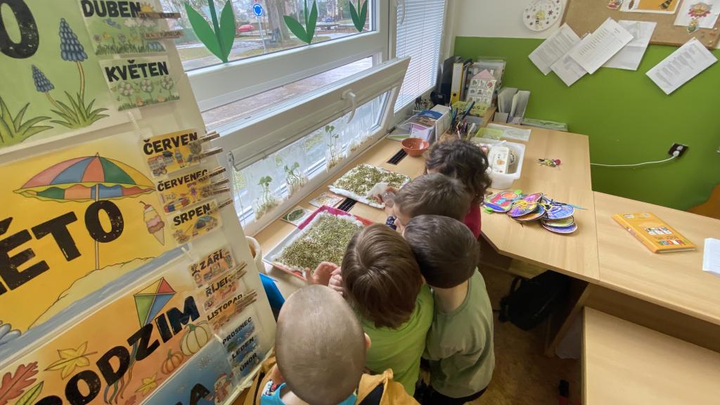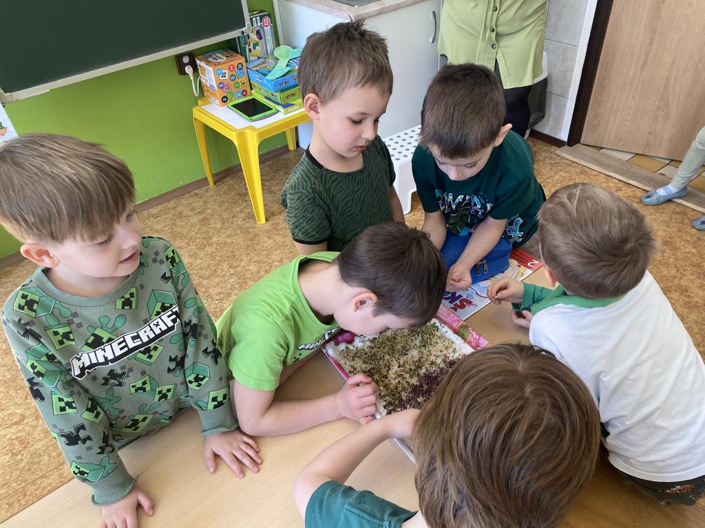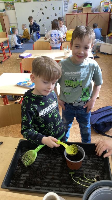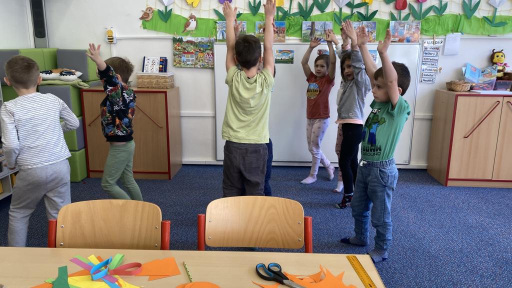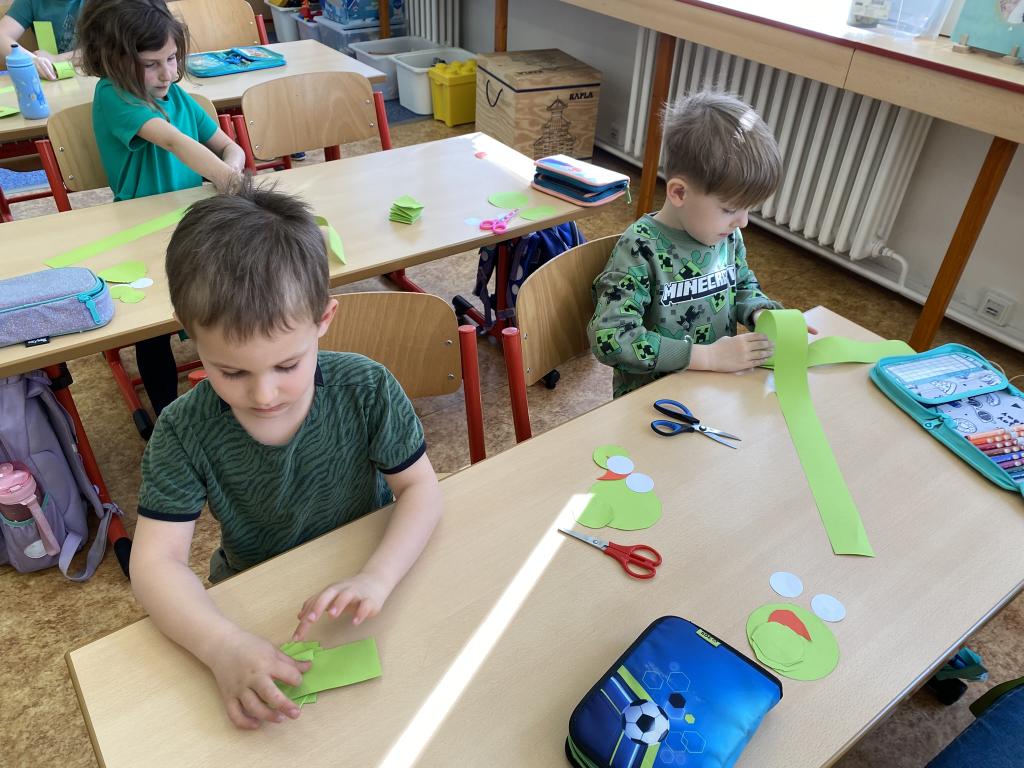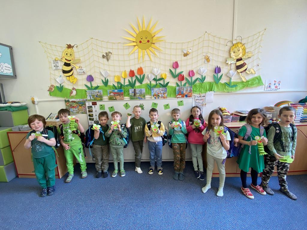 V pondělí 16. března odstartoval projektový týden, který rozzářil nejen naše přípravné třídy, ale i celou školu barvami jara. Objevování, dobrá nálada a společné aktivity nás těšily celý týden. Děti chodily v zeleném oblečení a přinesly dokonce i zelené svačiny, které jim moc chutnaly. Jako všechny učebny ve škole, tak i naše dostaly symbolický jarní klíč, který se objevil na dveřích naší třídy. Nebyl to obyčejný klíč — reagoval na splněné jarní výzvy. A že jich bylo! S dětmi jsme se starali o rostlinky – vyseté hrášky a fazolky. Děti měly radost, jak vše klíčí a roste. Po přesazení do hlíny si děti odnesly zelené květináčky domů. Na vatu jsme nechali také vyklíčit kadeřávek, čočku a mungo klíčky, na kterých jsme si s radostí po týdnu pěstování všichni pochutnali. Ve třídě jsme dělali další pestré aktivity spojené se zeleným týdnem – modelovali jarní obrázky, zpívali písničky o jaru, kreslili, vyráběli, četli příběhy a hráli si. Povídali jsme si o svátku svatého Patrika a plnili úkoly skřítka Leprikóna. Na památku jsme si namalovali kouzelné trojlístky, které nám budou připomínat důležité mezilidské hodnoty, jakými jsou láska, přátelství a pomoc druhým. Zelený týden jsme si všichni moc užili. Doufáme, že nám přinesl nejen radost, ale i zdraví a plno jarní energie!